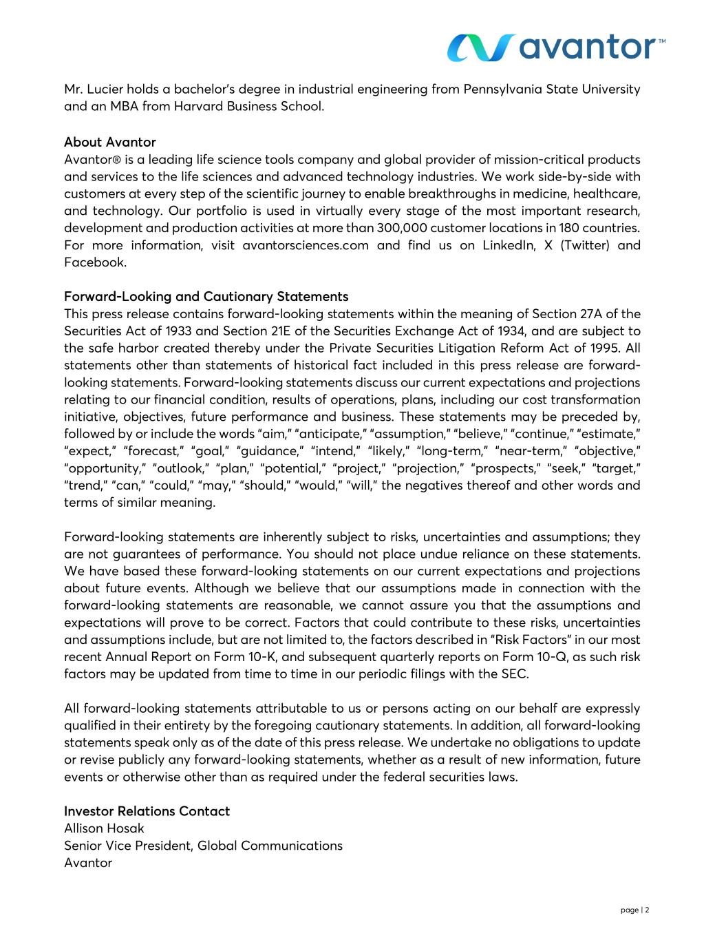 page | 2 Mr. Lucier holds a bachelor’s degree in industrial engineering from Pennsylvania State University and an MBA from Harvard Business School. About Avantor Avantor® is a leading life science tools company and global provider of mission-critical products and services to the life sciences and advanced technology industries. We work side-by-side with customers at every step of the scientific journey to enable breakthroughs in medicine, healthcare, and technology. Our portfolio is used in virtually every stage of the most important research, development and production activities at more than 300,000 customer locations in 180 countries. For more information, visit avantorsciences.com and find us on LinkedIn, X (Twitter) and Facebook. Forward-Looking and Cautionary Statements This press release contains forward-looking statements within the meaning of Section 27A of the Securities Act of 1933 and Section 21E of the Securities Exchange Act of 1934, and are subject to the safe harbor created thereby under the Private Securities Litigation Reform Act of 1995. All statements other than statements of historical fact included in this press release are forward- looking statements. Forward-looking statements discuss our current expectations and projections relating to our financial condition, results of operations, plans, including our cost transformation initiative, objectives, future performance and business. These statements may be preceded by, followed by or include the words “aim,” “anticipate,” “assumption,” “believe,” “continue,” “estimate,” “expect,” “forecast,” “goal,” “guidance,” “intend,” “likely,” “long-term,” “near-term,” “objective,” “opportunity,” “outlook,” “plan,” “potential,” “project,” “projection,” “prospects,” “seek,” “target,” “trend,” “can,” “could,” “may,” “should,” “would,” “will,” the negatives thereof and other words and terms of similar meaning. Forward-looking statements are inherently subject to risks, uncertainties and assumptions; they are not guarantees of performance. You should not place undue reliance on these statements. We have based these forward-looking statements on our current expectations and projections about future events. Although we believe that our assumptions made in connection with the forward-looking statements are reasonable, we cannot assure you that the assumptions and expectations will prove to be correct. Factors that could contribute to these risks, uncertainties and assumptions include, but are not limited to, the factors described in “Risk Factors” in our most recent Annual Report on Form 10-K, and subsequent quarterly reports on Form 10-Q, as such risk factors may be updated from time to time in our periodic filings with the SEC. All forward-looking statements attributable to us or persons acting on our behalf are expressly qualified in their entirety by the foregoing cautionary statements. In addition, all forward-looking statements speak only as of the date of this press release. We undertake no obligations to update or revise publicly any forward-looking statements, whether as a result of new information, future events or otherwise other than as required under the federal securities laws. Investor Relations Contact Allison Hosak Senior Vice President, Global Communications Avantor