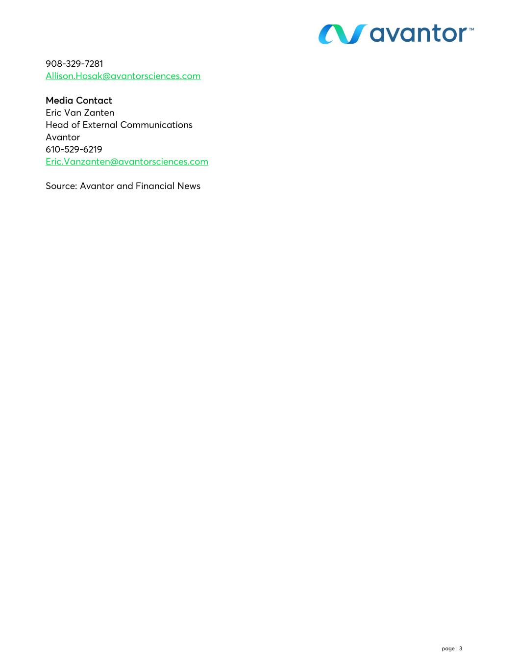 page | 3 908-329-7281 Allison.Hosak@avantorsciences.com Media Contact Eric Van Zanten Head of External Communications Avantor 610-529-6219 Eric.Vanzanten@avantorsciences.com Source: Avantor and Financial News