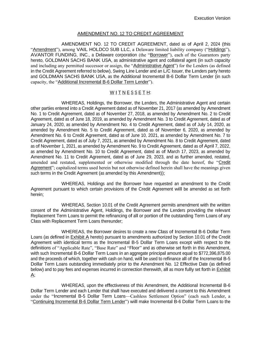 Execution Version AMENDMENT NO. 12 TO CREDIT AGREEMENT AMENDMENT NO. 12 TO CREDIT AGREEMENT, dated as of April 2, 2024 (this “Amendment”), among VAIL HOLDCO SUB LLC, a Delaware limited liability company (“Holdings”), AVANTOR FUNDING, INC., a Delaware corporation (the “Borrower”), each of the Guarantors party hereto, GOLDMAN SACHS BANK USA, as administrative agent and collateral agent (in such capacity and including any permitted successor or assign, the “Administrative Agent”) for the Lenders (as defined in the Credit Agreement referred to below), Swing Line Lender and an L/C Issuer, the Lenders party hereto and GOLDMAN SACHS BANK USA, as the Additional Incremental B-6 Dollar Term Lender (in such capacity, the “Additional Incremental B-6 Dollar Term Lender”). W I T N E S S E T H: WHEREAS, Holdings, the Borrower, the Lenders, the Administrative Agent and certain other parties entered into a Credit Agreement dated as of November 21, 2017 (as amended by Amendment No. 1 to Credit Agreement, dated as of November 27, 2018, as amended by Amendment No. 2 to Credit Agreement, dated as of June 18, 2019, as amended by Amendment No. 3 to Credit Agreement, dated as of January 24, 2020, as amended by Amendment No. 4 to Credit Agreement, dated as of July 14, 2020, as amended by Amendment No. 5 to Credit Agreement, dated as of November 6, 2020, as amended by Amendment No. 6 to Credit Agreement, dated as of June 10, 2021, as amended by Amendment No. 7 to Credit Agreement, dated as of July 7, 2021, as amended by Amendment No. 8 to Credit Agreement, dated as of November 1, 2021, as amended by Amendment No. 9 to Credit Agreement, dated as of April 7, 2022, as amended by Amendment No. 10 to Credit Agreement, dated as of March 17, 2023, as amended by Amendment No. 11 to Credit Agreement, dated as of June 29, 2023, and as further amended, restated, amended and restated, supplemented or otherwise modified through the date hereof, the “Credit Agreement”; capitalized terms used herein but not otherwise defined herein shall have the meanings given such terms in the Credit Agreement (as amended by this Amendment)); WHEREAS, Holdings and the Borrower have requested an amendment to the Credit Agreement pursuant to which certain provisions of the Credit Agreement will be amended as set forth herein; WHEREAS, Section 10.01 of the Credit Agreement permits amendment with the written consent of the Administrative Agent, Holdings, the Borrower and the Lenders providing the relevant Replacement Term Loans to permit the refinancing of all or portion of the outstanding Term Loans of any Class with Replacement Term Loans thereunder; WHEREAS, the Borrower desires to create a new Class of Incremental B-6 Dollar Term Loans (as defined in Exhibit A hereto) pursuant to amendments authorized by Section 10.01 of the Credit Agreement with identical terms as the Incremental B-5 Dollar Term Loans except with respect to the definitions of “Applicable Rate”, “Base Rate” and “Floor” and as otherwise set forth in this Amendment, with such Incremental B-6 Dollar Term Loans in an aggregate principal amount equal to $772,396,875.00 and the proceeds of which, together with cash on hand, will be used to refinance all of the Incremental B-5 Dollar Term Loans outstanding immediately prior to the Amendment No. 12 Effective Date (as defined below) and to pay fees and expenses incurred in connection therewith, all as more fully set forth in Exhibit A; WHEREAS, upon the effectiveness of this Amendment, the Additional Incremental B-6 Dollar Term Lender and each Lender that shall have executed and delivered a consent to this Amendment under the “Incremental B-5 Dollar Term Loans—Cashless Settlement Option” (each such Lender, a “Continuing Incremental B-6 Dollar Term Lender”) will make Incremental B-6 Dollar Term Loans to the