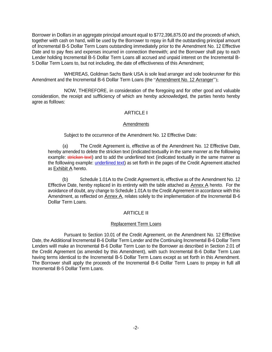 -2- Borrower in Dollars in an aggregate principal amount equal to $772,396,875.00 and the proceeds of which, together with cash on hand, will be used by the Borrower to repay in full the outstanding principal amount of Incremental B-5 Dollar Term Loans outstanding immediately prior to the Amendment No. 12 Effective Date and to pay fees and expenses incurred in connection therewith; and the Borrower shall pay to each Lender holding Incremental B-5 Dollar Term Loans all accrued and unpaid interest on the Incremental B- 5 Dollar Term Loans to, but not including, the date of effectiveness of this Amendment; WHEREAS, Goldman Sachs Bank USA is sole lead arranger and sole bookrunner for this Amendment and the Incremental B-6 Dollar Term Loans (the “Amendment No. 12 Arranger”); NOW, THEREFORE, in consideration of the foregoing and for other good and valuable consideration, the receipt and sufficiency of which are hereby acknowledged, the parties hereto hereby agree as follows: ARTICLE I Amendments Subject to the occurrence of the Amendment No. 12 Effective Date: (a) The Credit Agreement is, effective as of the Amendment No. 12 Effective Date, hereby amended to delete the stricken text (indicated textually in the same manner as the following example: stricken text) and to add the underlined text (indicated textually in the same manner as the following example: underlined text) as set forth in the pages of the Credit Agreement attached as Exhibit A hereto. (b) Schedule 1.01A to the Credit Agreement is, effective as of the Amendment No. 12 Effective Date, hereby replaced in its entirety with the table attached as Annex A hereto. For the avoidance of doubt, any change to Schedule 1.01A to the Credit Agreement in accordance with this Amendment, as reflected on Annex A, relates solely to the implementation of the Incremental B-6 Dollar Term Loans. ARTICLE II Replacement Term Loans Pursuant to Section 10.01 of the Credit Agreement, on the Amendment No. 12 Effective Date, the Additional Incremental B-6 Dollar Term Lender and the Continuing Incremental B-6 Dollar Term Lenders will make an Incremental B-6 Dollar Term Loan to the Borrower as described in Section 2.01 of the Credit Agreement (as amended by this Amendment), with such Incremental B-6 Dollar Term Loan having terms identical to the Incremental B-5 Dollar Term Loans except as set forth in this Amendment. The Borrower shall apply the proceeds of the Incremental B-6 Dollar Term Loans to prepay in full all Incremental B-5 Dollar Term Loans.