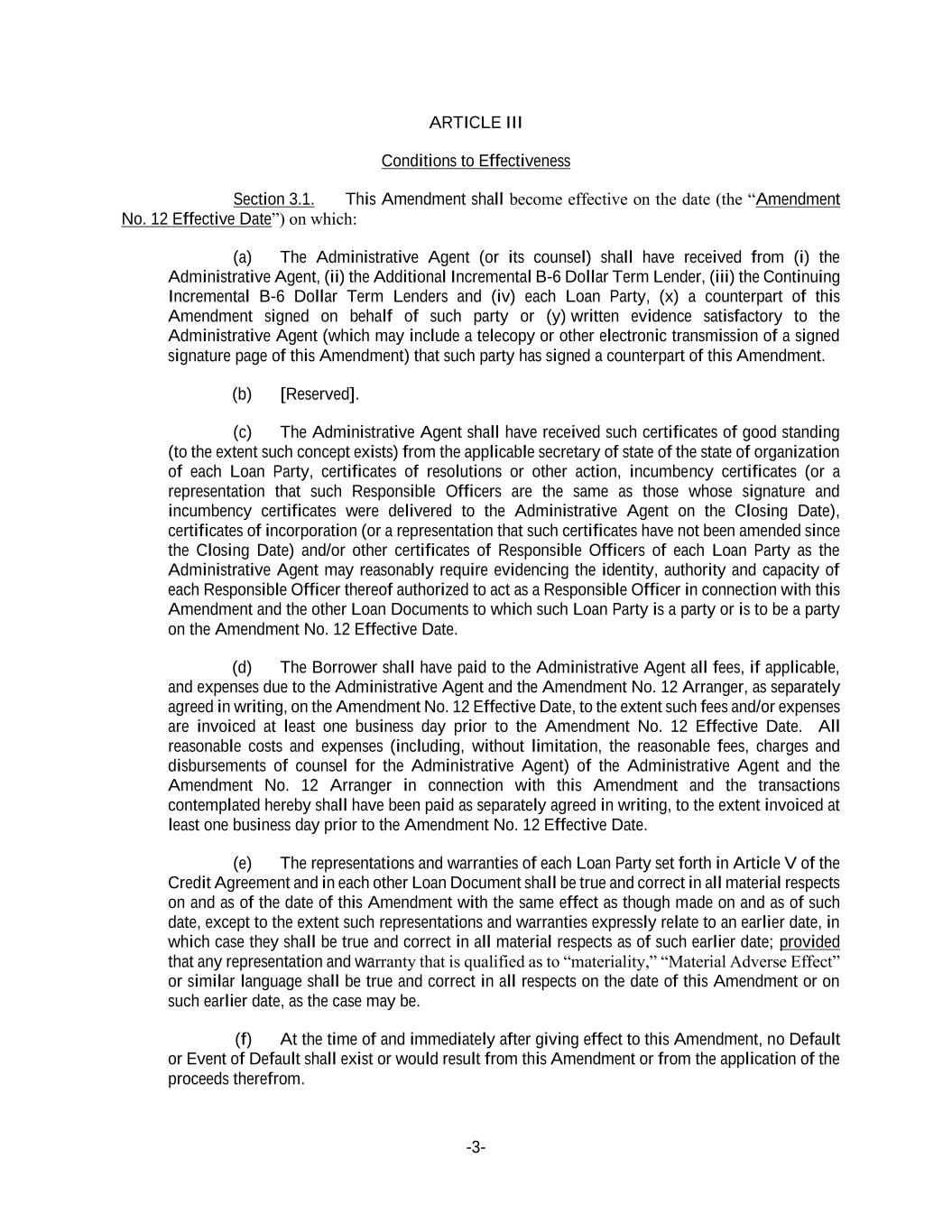 -3- ARTICLE III Conditions to Effectiveness Section 3.1. This Amendment shall become effective on the date (the “Amendment No. 12 Effective Date”) on which: (a) The Administrative Agent (or its counsel) shall have received from (i) the Administrative Agent, (ii) the Additional Incremental B-6 Dollar Term Lender, (iii) the Continuing Incremental B-6 Dollar Term Lenders and (iv) each Loan Party, (x) a counterpart of this Amendment signed on behalf of such party or (y) written evidence satisfactory to the Administrative Agent (which may include a telecopy or other electronic transmission of a signed signature page of this Amendment) that such party has signed a counterpart of this Amendment. (b) [Reserved]. (c) The Administrative Agent shall have received such certificates of good standing (to the extent such concept exists) from the applicable secretary of state of the state of organization of each Loan Party, certificates of resolutions or other action, incumbency certificates (or a representation that such Responsible Officers are the same as those whose signature and incumbency certificates were delivered to the Administrative Agent on the Closing Date), certificates of incorporation (or a representation that such certificates have not been amended since the Closing Date) and/or other certificates of Responsible Officers of each Loan Party as the Administrative Agent may reasonably require evidencing the identity, authority and capacity of each Responsible Officer thereof authorized to act as a Responsible Officer in connection with this Amendment and the other Loan Documents to which such Loan Party is a party or is to be a party on the Amendment No. 12 Effective Date. (d) The Borrower shall have paid to the Administrative Agent all fees, if applicable, and expenses due to the Administrative Agent and the Amendment No. 12 Arranger, as separately agreed in writing, on the Amendment No. 12 Effective Date, to the extent such fees and/or expenses are invoiced at least one business day prior to the Amendment No. 12 Effective Date. All reasonable costs and expenses (including, without limitation, the reasonable fees, charges and disbursements of counsel for the Administrative Agent) of the Administrative Agent and the Amendment No. 12 Arranger in connection with this Amendment and the transactions contemplated hereby shall have been paid as separately agreed in writing, to the extent invoiced at least one business day prior to the Amendment No. 12 Effective Date. (e) The representations and warranties of each Loan Party set forth in Article V of the Credit Agreement and in each other Loan Document shall be true and correct in all material respects on and as of the date of this Amendment with the same effect as though made on and as of such date, except to the extent such representations and warranties expressly relate to an earlier date, in which case they shall be true and correct in all material respects as of such earlier date; provided that any representation and warranty that is qualified as to “materiality,” “Material Adverse Effect” or similar language shall be true and correct in all respects on the date of this Amendment or on such earlier date, as the case may be. (f) At the time of and immediately after giving effect to this Amendment, no Default or Event of Default shall exist or would result from this Amendment or from the application of the proceeds therefrom.