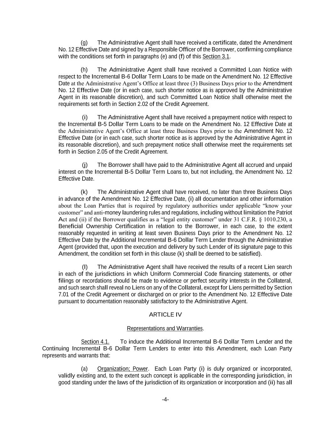 -4- (g) The Administrative Agent shall have received a certificate, dated the Amendment No. 12 Effective Date and signed by a Responsible Officer of the Borrower, confirming compliance with the conditions set forth in paragraphs (e) and (f) of this Section 3.1. (h) The Administrative Agent shall have received a Committed Loan Notice with respect to the Incremental B-6 Dollar Term Loans to be made on the Amendment No. 12 Effective Date at the Administrative Agent’s Office at least three (3) Business Days prior to the Amendment No. 12 Effective Date (or in each case, such shorter notice as is approved by the Administrative Agent in its reasonable discretion), and such Committed Loan Notice shall otherwise meet the requirements set forth in Section 2.02 of the Credit Agreement. (i) The Administrative Agent shall have received a prepayment notice with respect to the Incremental B-5 Dollar Term Loans to be made on the Amendment No. 12 Effective Date at the Administrative Agent’s Office at least three Business Days prior to the Amendment No. 12 Effective Date (or in each case, such shorter notice as is approved by the Administrative Agent in its reasonable discretion), and such prepayment notice shall otherwise meet the requirements set forth in Section 2.05 of the Credit Agreement. (j) The Borrower shall have paid to the Administrative Agent all accrued and unpaid interest on the Incremental B-5 Dollar Term Loans to, but not including, the Amendment No. 12 Effective Date. (k) The Administrative Agent shall have received, no later than three Business Days in advance of the Amendment No. 12 Effective Date, (i) all documentation and other information about the Loan Parties that is required by regulatory authorities under applicable “know your customer” and anti-money laundering rules and regulations, including without limitation the Patriot Act and (ii) if the Borrower qualifies as a “legal entity customer” under 31 C.F.R. § 1010.230, a Beneficial Ownership Certification in relation to the Borrower, in each case, to the extent reasonably requested in writing at least seven Business Days prior to the Amendment No. 12 Effective Date by the Additional Incremental B-6 Dollar Term Lender through the Administrative Agent (provided that, upon the execution and delivery by such Lender of its signature page to this Amendment, the condition set forth in this clause (k) shall be deemed to be satisfied). (l) The Administrative Agent shall have received the results of a recent Lien search in each of the jurisdictions in which Uniform Commercial Code financing statements, or other filings or recordations should be made to evidence or perfect security interests in the Collateral, and such search shall reveal no Liens on any of the Collateral, except for Liens permitted by Section 7.01 of the Credit Agreement or discharged on or prior to the Amendment No. 12 Effective Date pursuant to documentation reasonably satisfactory to the Administrative Agent. ARTICLE IV Representations and Warranties. Section 4.1. To induce the Additional Incremental B-6 Dollar Term Lender and the Continuing Incremental B-6 Dollar Term Lenders to enter into this Amendment, each Loan Party represents and warrants that: (a) Organization; Power. Each Loan Party (i) is duly organized or incorporated, validly existing and, to the extent such concept is applicable in the corresponding jurisdiction, in good standing under the laws of the jurisdiction of its organization or incorporation and (ii) has all