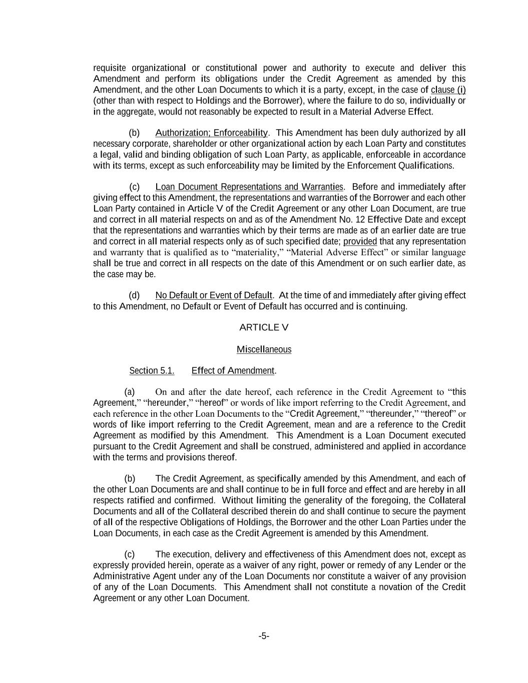 -5- requisite organizational or constitutional power and authority to execute and deliver this Amendment and perform its obligations under the Credit Agreement as amended by this Amendment, and the other Loan Documents to which it is a party, except, in the case of clause (i) (other than with respect to Holdings and the Borrower), where the failure to do so, individually or in the aggregate, would not reasonably be expected to result in a Material Adverse Effect. (b) Authorization; Enforceability. This Amendment has been duly authorized by all necessary corporate, shareholder or other organizational action by each Loan Party and constitutes a legal, valid and binding obligation of such Loan Party, as applicable, enforceable in accordance with its terms, except as such enforceability may be limited by the Enforcement Qualifications. (c) Loan Document Representations and Warranties. Before and immediately after giving effect to this Amendment, the representations and warranties of the Borrower and each other Loan Party contained in Article V of the Credit Agreement or any other Loan Document, are true and correct in all material respects on and as of the Amendment No. 12 Effective Date and except that the representations and warranties which by their terms are made as of an earlier date are true and correct in all material respects only as of such specified date; provided that any representation and warranty that is qualified as to “materiality,” “Material Adverse Effect” or similar language shall be true and correct in all respects on the date of this Amendment or on such earlier date, as the case may be. (d) No Default or Event of Default. At the time of and immediately after giving effect to this Amendment, no Default or Event of Default has occurred and is continuing. ARTICLE V Miscellaneous Section 5.1. Effect of Amendment. (a) On and after the date hereof, each reference in the Credit Agreement to “this Agreement,” “hereunder,” “hereof” or words of like import referring to the Credit Agreement, and each reference in the other Loan Documents to the “Credit Agreement,” “thereunder,” “thereof” or words of like import referring to the Credit Agreement, mean and are a reference to the Credit Agreement as modified by this Amendment. This Amendment is a Loan Document executed pursuant to the Credit Agreement and shall be construed, administered and applied in accordance with the terms and provisions thereof. (b) The Credit Agreement, as specifically amended by this Amendment, and each of the other Loan Documents are and shall continue to be in full force and effect and are hereby in all respects ratified and confirmed. Without limiting the generality of the foregoing, the Collateral Documents and all of the Collateral described therein do and shall continue to secure the payment of all of the respective Obligations of Holdings, the Borrower and the other Loan Parties under the Loan Documents, in each case as the Credit Agreement is amended by this Amendment. (c) The execution, delivery and effectiveness of this Amendment does not, except as expressly provided herein, operate as a waiver of any right, power or remedy of any Lender or the Administrative Agent under any of the Loan Documents nor constitute a waiver of any provision of any of the Loan Documents. This Amendment shall not constitute a novation of the Credit Agreement or any other Loan Document.