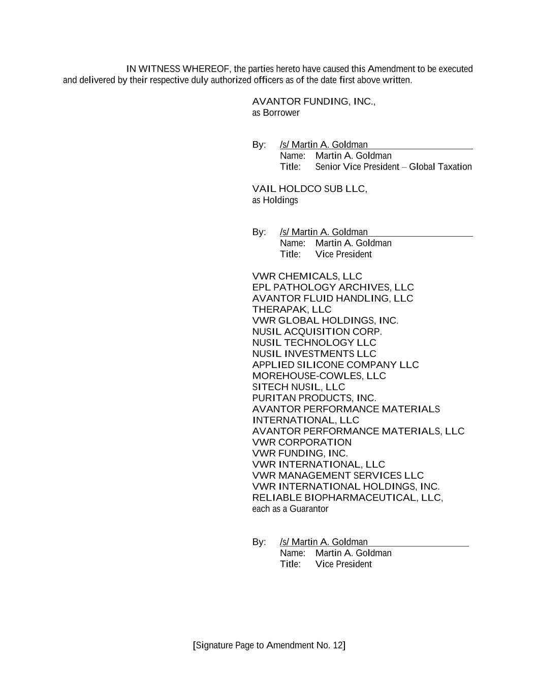 [Signature Page to Amendment No. 12] IN WITNESS WHEREOF, the parties hereto have caused this Amendment to be executed and delivered by their respective duly authorized officers as of the date first above written. AVANTOR FUNDING, INC., as Borrower By: /s/ Martin A. Goldman Name: Martin A. Goldman Title: Senior Vice President – Global Taxation VAIL HOLDCO SUB LLC, as Holdings By: /s/ Martin A. Goldman Name: Martin A. Goldman Title: Vice President VWR CHEMICALS, LLC EPL PATHOLOGY ARCHIVES, LLC AVANTOR FLUID HANDLING, LLC THERAPAK, LLC VWR GLOBAL HOLDINGS, INC. NUSIL ACQUISITION CORP. NUSIL TECHNOLOGY LLC NUSIL INVESTMENTS LLC APPLIED SILICONE COMPANY LLC MOREHOUSE-COWLES, LLC SITECH NUSIL, LLC PURITAN PRODUCTS, INC. AVANTOR PERFORMANCE MATERIALS INTERNATIONAL, LLC AVANTOR PERFORMANCE MATERIALS, LLC VWR CORPORATION VWR FUNDING, INC. VWR INTERNATIONAL, LLC VWR MANAGEMENT SERVICES LLC VWR INTERNATIONAL HOLDINGS, INC. RELIABLE BIOPHARMACEUTICAL, LLC, each as a Guarantor By: /s/ Martin A. Goldman Name: Martin A. Goldman Title: Vice President