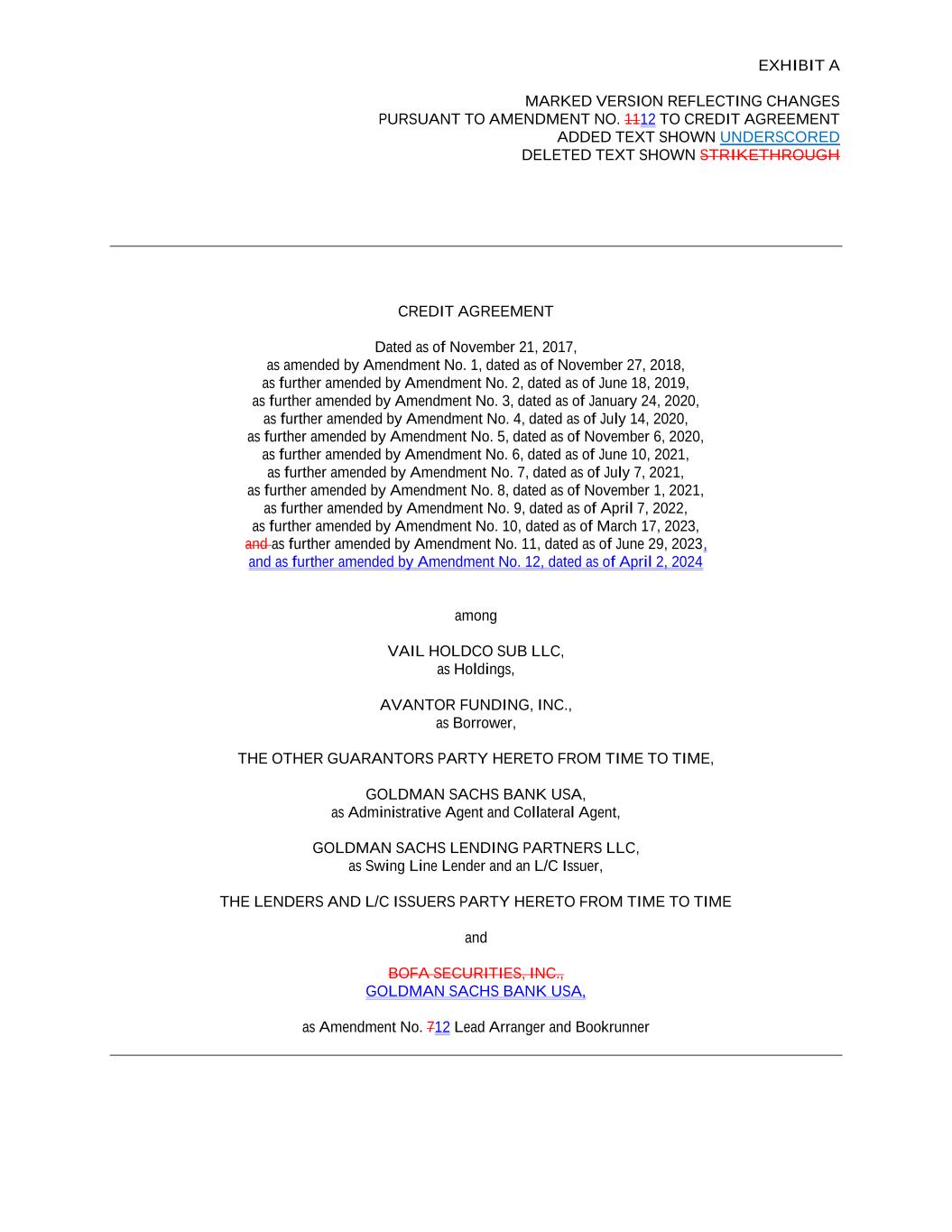 EXHIBIT A MARKED VERSION REFLECTING CHANGES PURSUANT TO AMENDMENT NO. 1112 TO CREDIT AGREEMENT ADDED TEXT SHOWN UNDERSCORED DELETED TEXT SHOWN STRIKETHROUGH CREDIT AGREEMENT Dated as of November 21, 2017, as amended by Amendment No. 1, dated as of November 27, 2018, as further amended by Amendment No. 2, dated as of June 18, 2019, as further amended by Amendment No. 3, dated as of January 24, 2020, as further amended by Amendment No. 4, dated as of July 14, 2020, as further amended by Amendment No. 5, dated as of November 6, 2020, as further amended by Amendment No. 6, dated as of June 10, 2021, as further amended by Amendment No. 7, dated as of July 7, 2021, as further amended by Amendment No. 8, dated as of November 1, 2021, as further amended by Amendment No. 9, dated as of April 7, 2022, as further amended by Amendment No. 10, dated as of March 17, 2023, and as further amended by Amendment No. 11, dated as of June 29, 2023, and as further amended by Amendment No. 12, dated as of April 2, 2024 among VAIL HOLDCO SUB LLC, as Holdings, AVANTOR FUNDING, INC., as Borrower, THE OTHER GUARANTORS PARTY HERETO FROM TIME TO TIME, GOLDMAN SACHS BANK USA, as Administrative Agent and Collateral Agent, GOLDMAN SACHS LENDING PARTNERS LLC, as Swing Line Lender and an L/C Issuer, THE LENDERS AND L/C ISSUERS PARTY HERETO FROM TIME TO TIME and BOFA SECURITIES, INC., GOLDMAN SACHS BANK USA, as Amendment No. 712 Lead Arranger and Bookrunner