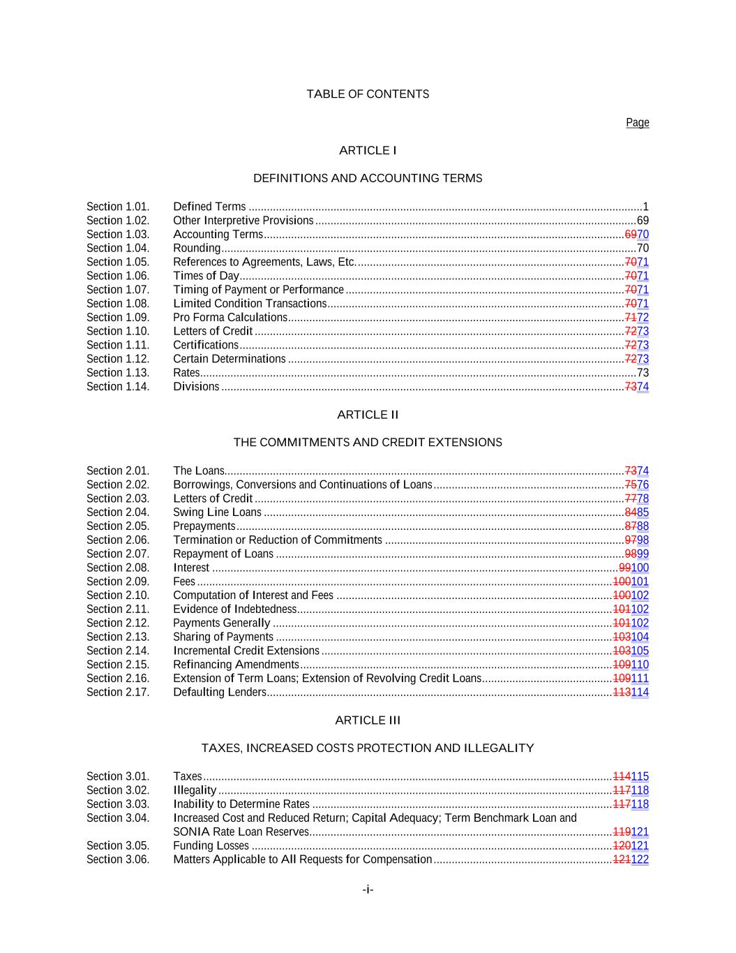-i- TABLE OF CONTENTS Page ARTICLE I DEFINITIONS AND ACCOUNTING TERMS Section 1.01. Defined Terms .................................................................................................................................. 1 Section 1.02. Other Interpretive Provisions .......................................................................................................... 69 Section 1.03. Accounting Terms ....................................................................................................................... 6970 Section 1.04. Rounding ......................................................................................................................................... 70 Section 1.05. References to Agreements, Laws, Etc. ........................................................................................ 7071 Section 1.06. Times of Day ............................................................................................................................... 7071 Section 1.07. Timing of Payment or Performance ............................................................................................ 7071 Section 1.08. Limited Condition Transactions .................................................................................................. 7071 Section 1.09. Pro Forma Calculations ............................................................................................................... 7172 Section 1.10. Letters of Credit .......................................................................................................................... 7273 Section 1.11. Certifications ............................................................................................................................... 7273 Section 1.12. Certain Determinations ............................................................................................................... 7273 Section 1.13. Rates ................................................................................................................................................ 73 Section 1.14. Divisions ..................................................................................................................................... 7374 ARTICLE II THE COMMITMENTS AND CREDIT EXTENSIONS Section 2.01. The Loans.................................................................................................................................... 7374 Section 2.02. Borrowings, Conversions and Continuations of Loans ............................................................... 7576 Section 2.03. Letters of Credit .......................................................................................................................... 7778 Section 2.04. Swing Line Loans ....................................................................................................................... 8485 Section 2.05. Prepayments ................................................................................................................................ 8788 Section 2.06. Termination or Reduction of Commitments ............................................................................... 9798 Section 2.07. Repayment of Loans ................................................................................................................... 9899 Section 2.08. Interest ...................................................................................................................................... 99100 Section 2.09. Fees ......................................................................................................................................... 100101 Section 2.10. Computation of Interest and Fees ........................................................................................... 100102 Section 2.11. Evidence of Indebtedness ........................................................................................................ 101102 Section 2.12. Payments Generally ................................................................................................................ 101102 Section 2.13. Sharing of Payments ............................................................................................................... 103104 Section 2.14. Incremental Credit Extensions ................................................................................................ 103105 Section 2.15. Refinancing Amendments ....................................................................................................... 109110 Section 2.16. Extension of Term Loans; Extension of Revolving Credit Loans ........................................... 109111 Section 2.17. Defaulting Lenders .................................................................................................................. 113114 ARTICLE III TAXES, INCREASED COSTS PROTECTION AND ILLEGALITY Section 3.01. Taxes ....................................................................................................................................... 114115 Section 3.02. Illegality .................................................................................................................................. 117118 Section 3.03. Inability to Determine Rates ................................................................................................... 117118 Section 3.04. Increased Cost and Reduced Return; Capital Adequacy; Term Benchmark Loan and SONIA Rate Loan Reserves.................................................................................................... 119121 Section 3.05. Funding Losses ....................................................................................................................... 120121 Section 3.06. Matters Applicable to All Requests for Compensation ........................................................... 121122