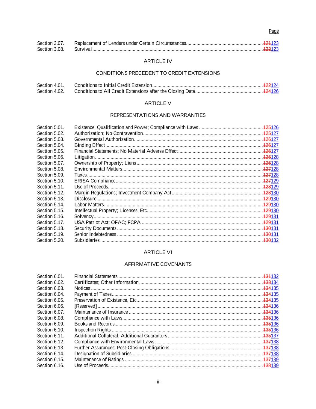 Page -ii- Section 3.07. Replacement of Lenders under Certain Circumstances ........................................................... 121123 Section 3.08. Survival ................................................................................................................................... 122123 ARTICLE IV CONDITIONS PRECEDENT TO CREDIT EXTENSIONS Section 4.01. Conditions to Initial Credit Extension ..................................................................................... 122124 Section 4.02. Conditions to All Credit Extensions after the Closing Date .................................................... 124126 ARTICLE V REPRESENTATIONS AND WARRANTIES Section 5.01. Existence, Qualification and Power; Compliance with Laws ................................................. 125126 Section 5.02. Authorization; No Contravention ............................................................................................ 125127 Section 5.03. Governmental Authorization ................................................................................................... 126127 Section 5.04. Binding Effect ......................................................................................................................... 126127 Section 5.05. Financial Statements; No Material Adverse Effect ................................................................. 126127 Section 5.06. Litigation ................................................................................................................................. 126128 Section 5.07. Ownership of Property; Liens ................................................................................................. 126128 Section 5.08. Environmental Matters ............................................................................................................ 127128 Section 5.09. Taxes ....................................................................................................................................... 127128 Section 5.10. ERISA Compliance ................................................................................................................. 127129 Section 5.11. Use of Proceeds ....................................................................................................................... 128129 Section 5.12. Margin Regulations; Investment Company Act ...................................................................... 128130 Section 5.13. Disclosure ............................................................................................................................... 129130 Section 5.14. Labor Matters .......................................................................................................................... 129130 Section 5.15. Intellectual Property; Licenses, Etc. ........................................................................................ 129130 Section 5.16. Solvency .................................................................................................................................. 129131 Section 5.17. USA Patriot Act; OFAC; FCPA ............................................................................................. 129131 Section 5.18. Security Documents ................................................................................................................ 130131 Section 5.19. Senior Indebtedness ................................................................................................................ 130131 Section 5.20. Subsidiaries ............................................................................................................................. 130132 ARTICLE VI AFFIRMATIVE COVENANTS Section 6.01. Financial Statements ............................................................................................................... 131132 Section 6.02. Certificates; Other Information ............................................................................................... 133134 Section 6.03. Notices .................................................................................................................................... 134135 Section 6.04. Payment of Taxes .................................................................................................................... 134135 Section 6.05. Preservation of Existence, Etc. ................................................................................................ 134135 Section 6.06. [Reserved] ............................................................................................................................... 134136 Section 6.07. Maintenance of Insurance ....................................................................................................... 134136 Section 6.08. Compliance with Laws ............................................................................................................ 135136 Section 6.09. Books and Records.................................................................................................................. 135136 Section 6.10. Inspection Rights .................................................................................................................... 135136 Section 6.11. Additional Collateral; Additional Guarantors ......................................................................... 135137 Section 6.12. Compliance with Environmental Laws ................................................................................... 137138 Section 6.13. Further Assurances; Post-Closing Obligations........................................................................ 137138 Section 6.14. Designation of Subsidiaries..................................................................................................... 137138 Section 6.15. Maintenance of Ratings .......................................................................................................... 137139 Section 6