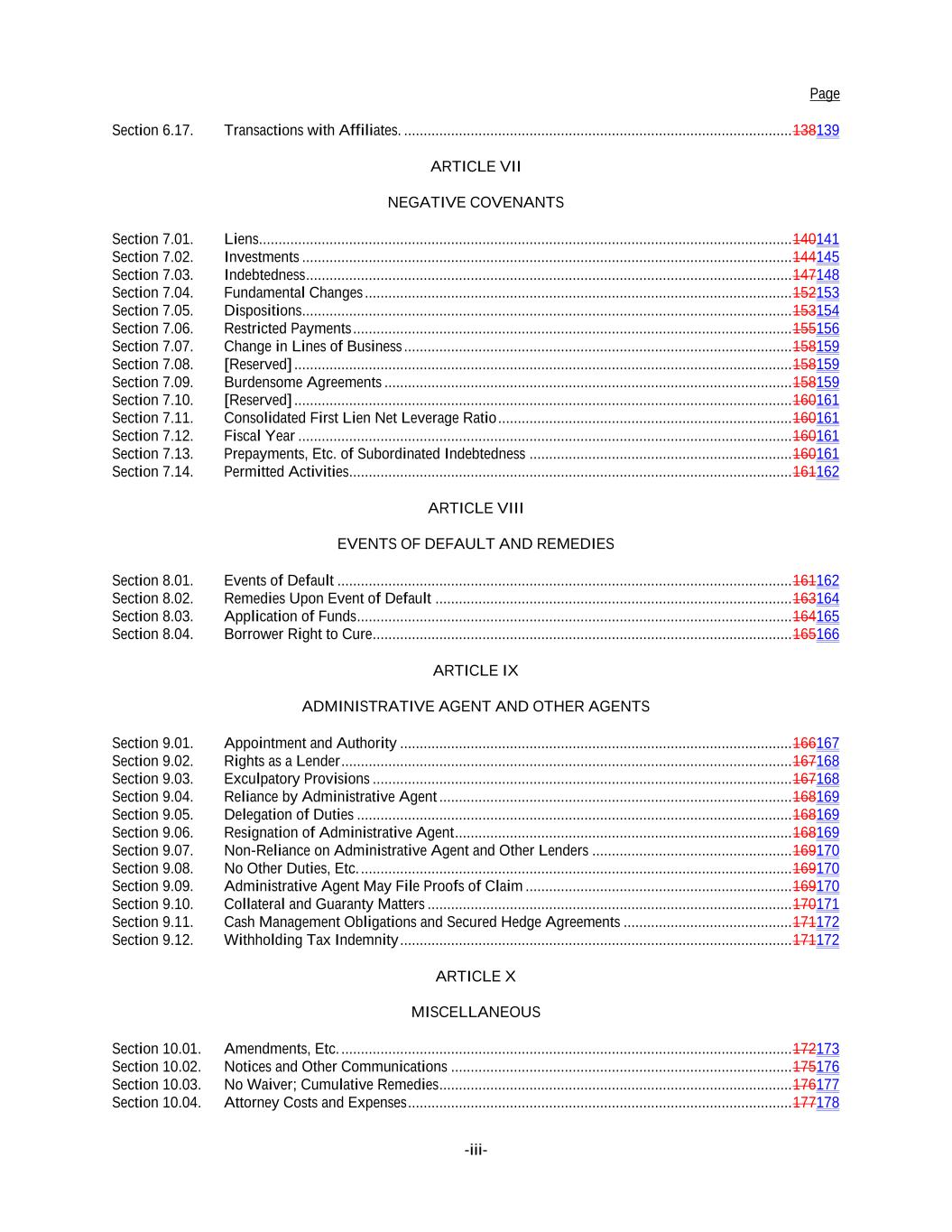 Page -iii- Section 6.17. Transactions with Affiliates. ................................................................................................... 138139 ARTICLE VII NEGATIVE COVENANTS Section 7.01. Liens ........................................................................................................................................ 140141 Section 7.02. Investments ............................................................................................................................. 144145 Section 7.03. Indebtedness ............................................................................................................................ 147148 Section 7.04. Fundamental Changes ............................................................................................................. 152153 Section 7.05. Dispositions............................................................................................................................. 153154 Section 7.06. Restricted Payments ................................................................................................................ 155156 Section 7.07. Change in Lines of Business ................................................................................................... 158159 Section 7.08. [Reserved] ............................................................................................................................... 158159 Section 7.09. Burdensome Agreements ........................................................................................................ 158159 Section 7.10. [Reserved] ............................................................................................................................... 160161 Section 7.11. Consolidated First Lien Net Leverage Ratio ........................................................................... 160161 Section 7.12. Fiscal Year .............................................................................................................................. 160161 Section 7.13. Prepayments, Etc. of Subordinated Indebtedness ................................................................... 160161 Section 7.14. Permitted Activities................................................................................................................. 161162 ARTICLE VIII EVENTS OF DEFAULT AND REMEDIES Section 8.01. Events of Default .................................................................................................................... 161162 Section 8.02. Remedies Upon Event of Default ........................................................................................... 163164 Section 8.03. Application of Funds ............................................................................................................... 164165 Section 8.04. Borrower Right to Cure ........................................................................................................... 165166 ARTICLE IX ADMINISTRATIVE AGENT AND OTHER AGENTS Section 9.01. Appointment and Authority .................................................................................................... 166167 Section 9.02. Rights as a Lender ................................................................................................................... 167168 Section 9.03. Exculpatory Provisions ........................................................................................................... 167168 Section 9.04. Reliance by Administrative Agent .......................................................................................... 168169 Section 9.05. Delegation of Duties ............................................................................................................... 168169 Section 9.06. Resignation of Administrative Agent ...................................................................................... 168169 Section 9.07. Non-Reliance on Administrative Agent and Other Lenders ................................................... 169170 Section 9.08. No Other Duties, Etc. .............................................................................................................. 169170 Section 9.09. Administrative Agent May File Proofs of Claim .................................................................... 169170 Section 9.10. Collateral and Guaranty Matters ............................................................................................. 170171 Section 9.11. Cash Management Obligations and Secured Hedge Agreements ........................................... 171172 Section 9.12. Withholding Tax Indemnity .................................................................................................... 171172 ARTICLE X MISCELLANEOUS Section 10.01. Amendments, Etc. ................................................................................................................... 172173 Section 10.02. Notices and Other Communications ....................................................................................... 175176 Section 10.03. No Waiver; Cumulative Remedies .......................................................................................... 176177 Section 10.04. Attorney Costs and Expenses .................................................................................................. 177178