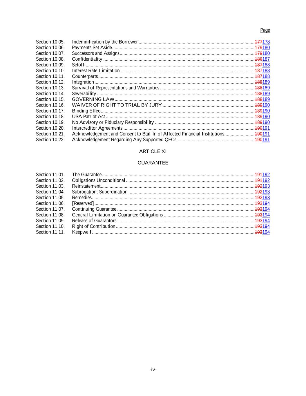 Page -iv- Section 10.05. Indemnification by the Borrower ............................................................................................ 177178 Section 10.06. Payments Set Aside ................................................................................................................. 179180 Section 10.07. Successors and Assigns ........................................................................................................... 179180 Section 10.08. Confidentiality ........................................................................................................................ 186187 Section 10.09. Setoff ....................................................................................................................................... 187188 Section 10.10. Interest Rate Limitation .......................................................................................................... 187188 Section 10.11. Counterparts ............................................................................................................................ 187188 Section 10.12. Integration ............................................................................................................................... 188189 Section 10.13. Survival of Representations and Warranties ........................................................................... 188189 Section 10.14. Severability ............................................................................................................................. 188189 Section 10.15. GOVERNING LAW ............................................................................................................... 188189 Section 10.16. WAIVER OF RIGHT TO TRIAL BY JURY ......................................................................... 189190 Section 10.17. Binding Effect ......................................................................................................................... 189190 Section 10.18. USA Patriot Act ...................................................................................................................... 189190 Section 10.19. No Advisory or Fiduciary Responsibility ............................................................................... 189190 Section 10.20. Intercreditor Agreements ........................................................................................................ 190191 Section 10.21. Acknowledgement and Consent to Bail-In of Affected Financial Institutions ........................ 190191 Section 10.22. Acknowledgement Regarding Any Supported QFCs.............................................................. 190191 ARTICLE XI GUARANTEE Section 11.01. The Guarantee ......................................................................................................................... 191192 Section 11.02. Obligations Unconditional ...................................................................................................... 191192 Section 11.03. Reinstatement .......................................................................................................................... 192193 Section 11.04. Subrogation; Subordination .................................................................................................... 192193 Section 11.05. Remedies ................................................................................................................................. 192193 Section 11.06. [Reserved] ............................................................................................................................... 193194 Section 11.07. Continuing Guarantee ............................................................................................................. 193194 Section 11.08. General Limitation on Guarantee Obligations ........................................................................ 193194 Section 11.09. Release of Guarantors ............................................................................................................. 193194 Section 11.10. Right of Contribution .............................................................................................................. 193194 Section 11.11. Keepwell ................................................................................................................................. 193194