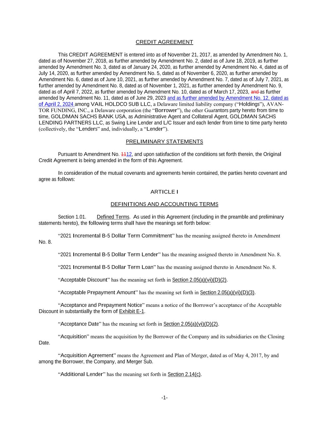 -1- CREDIT AGREEMENT This CREDIT AGREEMENT is entered into as of November 21, 2017, as amended by Amendment No. 1, dated as of November 27, 2018, as further amended by Amendment No. 2, dated as of June 18, 2019, as further amended by Amendment No. 3, dated as of January 24, 2020, as further amended by Amendment No. 4, dated as of July 14, 2020, as further amended by Amendment No. 5, dated as of November 6, 2020, as further amended by Amendment No. 6, dated as of June 10, 2021, as further amended by Amendment No. 7, dated as of July 7, 2021, as further amended by Amendment No. 8, dated as of November 1, 2021, as further amended by Amendment No. 9, dated as of April 7, 2022, as further amended by Amendment No. 10, dated as of March 17, 2023, and as further amended by Amendment No. 11, dated as of June 29, 2023 and as further amended by Amendment No. 12, dated as of April 2, 2024 among VAIL HOLDCO SUB LLC, a Delaware limited liability company (“Holdings”), AVAN- TOR FUNDING, INC., a Delaware corporation (the “Borrower”), the other Guarantors party hereto from time to time, GOLDMAN SACHS BANK USA, as Administrative Agent and Collateral Agent, GOLDMAN SACHS LENDING PARTNERS LLC, as Swing Line Lender and L/C Issuer and each lender from time to time party hereto (collectively, the “Lenders” and, individually, a “Lender”). PRELIMINARY STATEMENTS Pursuant to Amendment No. 1112, and upon satisfaction of the conditions set forth therein, the Original Credit Agreement is being amended in the form of this Agreement. In consideration of the mutual covenants and agreements herein contained, the parties hereto covenant and agree as follows: ARTICLE I DEFINITIONS AND ACCOUNTING TERMS Section 1.01. Defined Terms. As used in this Agreement (including in the preamble and preliminary statements hereto), the following terms shall have the meanings set forth below: “2021 Incremental B-5 Dollar Term Commitment” has the meaning assigned thereto in Amendment No. 8. “2021 Incremental B-5 Dollar Term Lender” has the meaning assigned thereto in Amendment No. 8. “2021 Incremental B-5 Dollar Term Loan” has the meaning assigned thereto in Amendment No. 8. “Acceptable Discount” has the meaning set forth in Section 2.05(a)(vi)(D)(2). “Acceptable Prepayment Amount” has the meaning set forth in Section 2.05(a)(vi)(D)(3). “Acceptance and Prepayment Notice” means a notice of the Borrower’s acceptance of the Acceptable Discount in substantially the form of Exhibit E-1. “Acceptance Date” has the meaning set forth in Section 2.05(a)(vi)(D)(2). “Acquisition” means the acquisition by the Borrower of the Company and its subsidiaries on the Closing Date. “Acquisition Agreement” means the Agreement and Plan of Merger, dated as of May 4, 2017, by and among the Borrower, the Company, and Merger Sub. “Additional Lender” has the meaning set forth in Section 2.14(c).