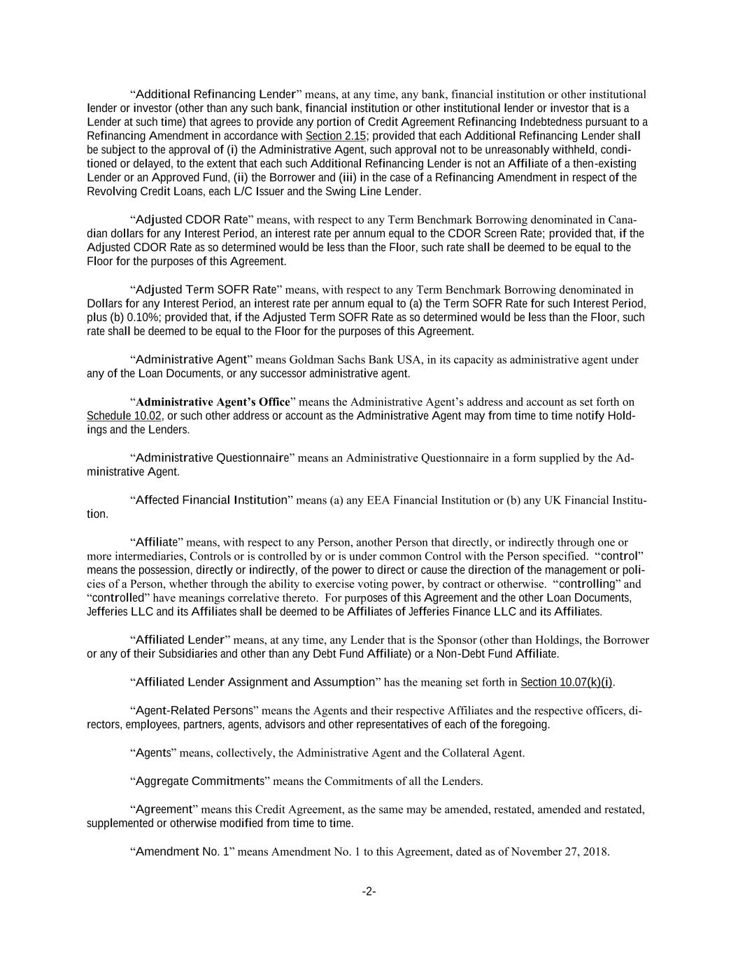 -2- “Additional Refinancing Lender” means, at any time, any bank, financial institution or other institutional lender or investor (other than any such bank, financial institution or other institutional lender or investor that is a Lender at such time) that agrees to provide any portion of Credit Agreement Refinancing Indebtedness pursuant to a Refinancing Amendment in accordance with Section 2.15; provided that each Additional Refinancing Lender shall be subject to the approval of (i) the Administrative Agent, such approval not to be unreasonably withheld, condi- tioned or delayed, to the extent that each such Additional Refinancing Lender is not an Affiliate of a then-existing Lender or an Approved Fund, (ii) the Borrower and (iii) in the case of a Refinancing Amendment in respect of the Revolving Credit Loans, each L/C Issuer and the Swing Line Lender. “Adjusted CDOR Rate” means, with respect to any Term Benchmark Borrowing denominated in Cana- dian dollars for any Interest Period, an interest rate per annum equal to the CDOR Screen Rate; provided that, if the Adjusted CDOR Rate as so determined would be less than the Floor, such rate shall be deemed to be equal to the Floor for the purposes of this Agreement. “Adjusted Term SOFR Rate” means, with respect to any Term Benchmark Borrowing denominated in Dollars for any Interest Period, an interest rate per annum equal to (a) the Term SOFR Rate for such Interest Period, plus (b) 0.10%; provided that, if the Adjusted Term SOFR Rate as so determined would be less than the Floor, such rate shall be deemed to be equal to the Floor for the purposes of this Agreement. “Administrative Agent” means Goldman Sachs Bank USA, in its capacity as administrative agent under any of the Loan Documents, or any successor administrative agent. “Administrative Agent’s Office” means the Administrative Agent’s address and account as set forth on Schedule 10.02, or such other address or account as the Administrative Agent may from time to time notify Hold- ings and the Lenders. “Administrative Questionnaire” means an Administrative Questionnaire in a form supplied by the Ad- ministrative Agent. “Affected Financial Institution” means (a) any EEA Financial Institution or (b) any UK Financial Institu- tion. “Affiliate” means, with respect to any Person, another Person that directly, or indirectly through one or more intermediaries, Controls or is controlled by or is under common Control with the Person specified. “control” means the possession, directly or indirectly, of the power to direct or cause the direction of the management or poli- cies of a Person, whether through the ability to exercise voting power, by contract or otherwise. “controlling” and “controlled” have meanings correlative thereto. For purposes of this Agreement and the other Loan Documents, Jefferies LLC and its Affiliates shall be deemed to be Affiliates of Jefferies Finance LLC and its Affiliates. “Affiliated Lender” means, at any time, any Lender that is the Sponsor (other than Holdings, the Borrower or any of their Subsidiaries and other than any Debt Fund Affiliate) or a Non-Debt Fund Affiliate. “Affiliated Lender Assignment and Assumption” has the meaning set forth in Section 10.07(k)(i). “Agent-Related Persons” means the Agents and their respective Affiliates and the respective officers, di- rectors, employees, partners, agents, advisors and other representatives of each of the foregoing. “Agents” means, collectively, the Administrative Agent and the Collateral Agent. “Aggregate Commitments” means the Commitments of all the Lenders. “Agreement” means this Credit Agreement, as the same may be amended, restated, amended and restated, supplemented or otherwise modified from time to time. “Amendment No. 1” means Amendment No. 1 to this Agreement, dated as of November 27, 2018.