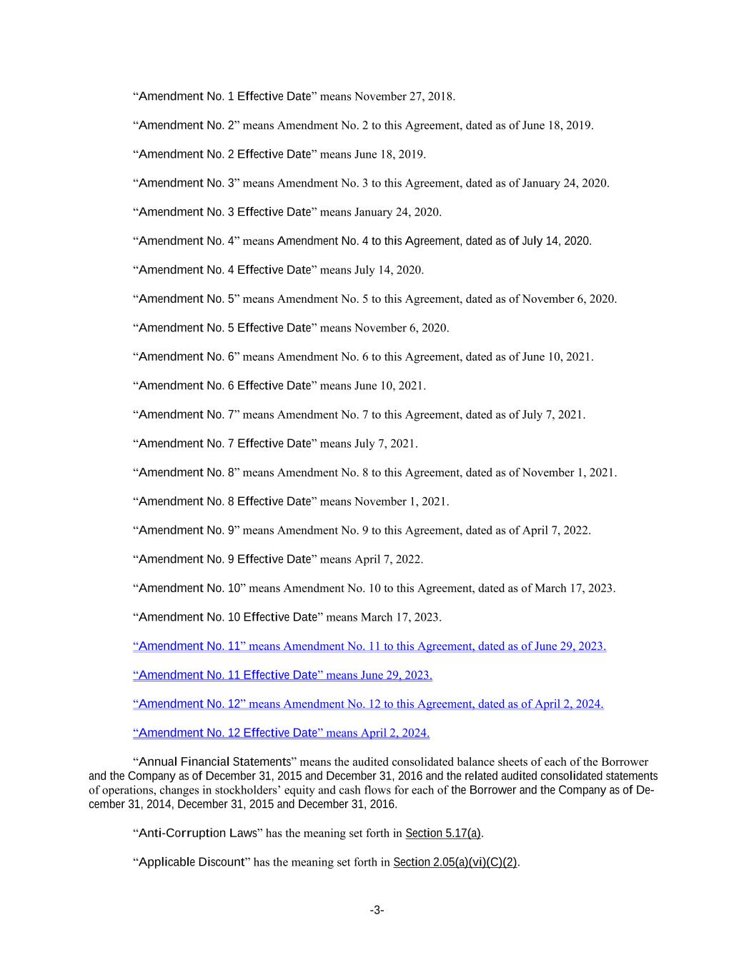 -3- “Amendment No. 1 Effective Date” means November 27, 2018. “Amendment No. 2” means Amendment No. 2 to this Agreement, dated as of June 18, 2019. “Amendment No. 2 Effective Date” means June 18, 2019. “Amendment No. 3” means Amendment No. 3 to this Agreement, dated as of January 24, 2020. “Amendment No. 3 Effective Date” means January 24, 2020. “Amendment No. 4” means Amendment No. 4 to this Agreement, dated as of July 14, 2020. “Amendment No. 4 Effective Date” means July 14, 2020. “Amendment No. 5” means Amendment No. 5 to this Agreement, dated as of November 6, 2020. “Amendment No. 5 Effective Date” means November 6, 2020. “Amendment No. 6” means Amendment No. 6 to this Agreement, dated as of June 10, 2021. “Amendment No. 6 Effective Date” means June 10, 2021. “Amendment No. 7” means Amendment No. 7 to this Agreement, dated as of July 7, 2021. “Amendment No. 7 Effective Date” means July 7, 2021. “Amendment No. 8” means Amendment No. 8 to this Agreement, dated as of November 1, 2021. “Amendment No. 8 Effective Date” means November 1, 2021. “Amendment No. 9” means Amendment No. 9 to this Agreement, dated as of April 7, 2022. “Amendment No. 9 Effective Date” means April 7, 2022. “Amendment No. 10” means Amendment No. 10 to this Agreement, dated as of March 17, 2023. “Amendment No. 10 Effective Date” means March 17, 2023. “Amendment No. 11” means Amendment No. 11 to this Agreement, dated as of June 29, 2023. “Amendment No. 11 Effective Date” means June 29, 2023. “Amendment No. 12” means Amendment No. 12 to this Agreement, dated as of April 2, 2024. “Amendment No. 12 Effective Date” means April 2, 2024. “Annual Financial Statements” means the audited consolidated balance sheets of each of the Borrower and the Company as of December 31, 2015 and December 31, 2016 and the related audited consolidated statements of operations, changes in stockholders’ equity and cash flows for each of the Borrower and the Company as of De- cember 31, 2014, December 31, 2015 and December 31, 2016. “Anti-Corruption Laws” has the meaning set forth in Section 5.17(a). “Applicable Discount” has the meaning set forth in Section 2.05(a)(vi)(C)(2).