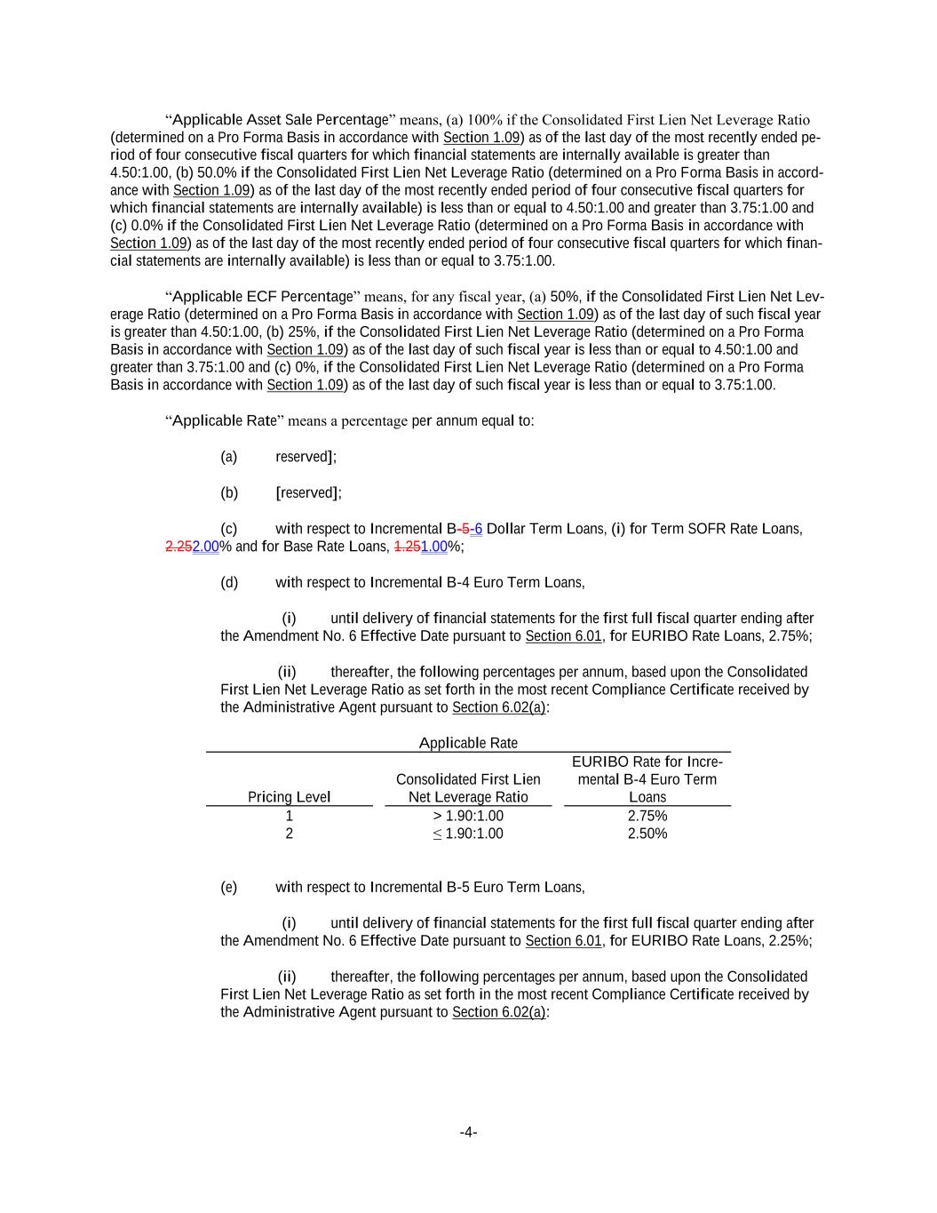 -4- “Applicable Asset Sale Percentage” means, (a) 100% if the Consolidated First Lien Net Leverage Ratio (determined on a Pro Forma Basis in accordance with Section 1.09) as of the last day of the most recently ended pe- riod of four consecutive fiscal quarters for which financial statements are internally available is greater than 4.50:1.00, (b) 50.0% if the Consolidated First Lien Net Leverage Ratio (determined on a Pro Forma Basis in accord- ance with Section 1.09) as of the last day of the most recently ended period of four consecutive fiscal quarters for which financial statements are internally available) is less than or equal to 4.50:1.00 and greater than 3.75:1.00 and (c) 0.0% if the Consolidated First Lien Net Leverage Ratio (determined on a Pro Forma Basis in accordance with Section 1.09) as of the last day of the most recently ended period of four consecutive fiscal quarters for which finan- cial statements are internally available) is less than or equal to 3.75:1.00. “Applicable ECF Percentage” means, for any fiscal year, (a) 50%, if the Consolidated First Lien Net Lev- erage Ratio (determined on a Pro Forma Basis in accordance with Section 1.09) as of the last day of such fiscal year is greater than 4.50:1.00, (b) 25%, if the Consolidated First Lien Net Leverage Ratio (determined on a Pro Forma Basis in accordance with Section 1.09) as of the last day of such fiscal year is less than or equal to 4.50:1.00 and greater than 3.75:1.00 and (c) 0%, if the Consolidated First Lien Net Leverage Ratio (determined on a Pro Forma Basis in accordance with Section 1.09) as of the last day of such fiscal year is less than or equal to 3.75:1.00. “Applicable Rate” means a percentage per annum equal to: (a) reserved]; (b) [reserved]; (c) with respect to Incremental B-5-6 Dollar Term Loans, (i) for Term SOFR Rate Loans, 2.252.00% and for Base Rate Loans, 1.251.00%; (d) with respect to Incremental B-4 Euro Term Loans, (i) until delivery of financial statements for the first full fiscal quarter ending after the Amendment No. 6 Effective Date pursuant to Section 6.01, for EURIBO Rate Loans, 2.75%; (ii) thereafter, the following percentages per annum, based upon the Consolidated First Lien Net Leverage Ratio as set forth in the most recent Compliance Certificate received by the Administrative Agent pursuant to Section 6.02(a): Applicable Rate Pricing Level Consolidated First Lien Net Leverage Ratio EURIBO Rate for Incre- mental B-4 Euro Term Loans 1 > 1.90:1.00 2.75% 2 ≤ 1.90:1.00 2.50% (e) with respect to Incremental B-5 Euro Term Loans, (i) until delivery of financial statements for the first full fiscal quarter ending after the Amendment No. 6 Effective Date pursuant to Section 6.01, for EURIBO Rate Loans, 2.25%; (ii) thereafter, the following percentages per annum, based upon the Consolidated First Lien Net Leverage Ratio as set forth in the most recent Compliance Certificate received by the Administrative Agent pursuant to Section 6.02(a):