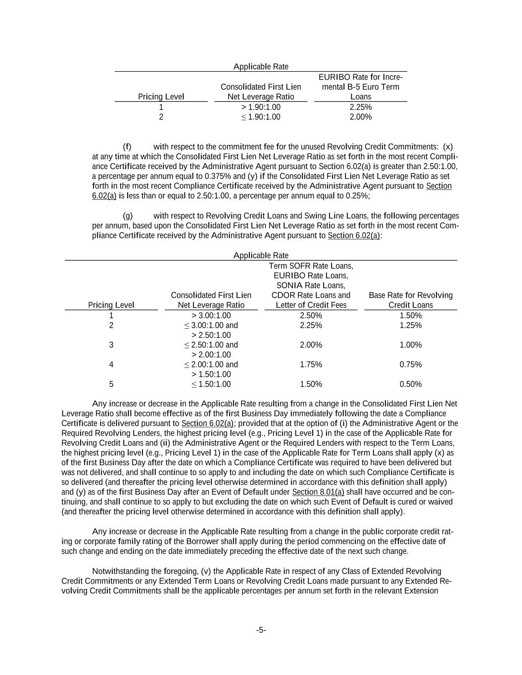 -5- Applicable Rate Pricing Level Consolidated First Lien Net Leverage Ratio EURIBO Rate for Incre- mental B-5 Euro Term Loans 1 > 1.90:1.00 2.25% 2 ≤ 1.90:1.00 2.00% (f) with respect to the commitment fee for the unused Revolving Credit Commitments: (x) at any time at which the Consolidated First Lien Net Leverage Ratio as set forth in the most recent Compli- ance Certificate received by the Administrative Agent pursuant to Section 6.02(a) is greater than 2.50:1.00, a percentage per annum equal to 0.375% and (y) if the Consolidated First Lien Net Leverage Ratio as set forth in the most recent Compliance Certificate received by the Administrative Agent pursuant to Section 6.02(a) is less than or equal to 2.50:1.00, a percentage per annum equal to 0.25%; (g) with respect to Revolving Credit Loans and Swing Line Loans, the following percentages per annum, based upon the Consolidated First Lien Net Leverage Ratio as set forth in the most recent Com- pliance Certificate received by the Administrative Agent pursuant to Section 6.02(a): Applicable Rate Pricing Level Consolidated First Lien Net Leverage Ratio Term SOFR Rate Loans, EURIBO Rate Loans, SONIA Rate Loans, CDOR Rate Loans and Letter of Credit Fees Base Rate for Revolving Credit Loans 1 > 3.00:1.00 2.50% 1.50% 2 ≤ 3.00:1.00 and > 2.50:1.00 2.25% 1.25% 3 ≤ 2.50:1.00 and > 2.00:1.00 2.00% 1.00% 4 ≤ 2.00:1.00 and > 1.50:1.00 1.75% 0.75% 5 ≤ 1.50:1.00 1.50% 0.50% Any increase or decrease in the Applicable Rate resulting from a change in the Consolidated First Lien Net Leverage Ratio shall become effective as of the first Business Day immediately following the date a Compliance Certificate is delivered pursuant to Section 6.02(a); provided that at the option of (i) the Administrative Agent or the Required Revolving Lenders, the highest pricing level (e.g., Pricing Level 1) in the case of the Applicable Rate for Revolving Credit Loans and (ii) the Administrative Agent or the Required Lenders with respect to the Term Loans, the highest pricing level (e.g., Pricing Level 1) in the case of the Applicable Rate for Term Loans shall apply (x) as of the first Business Day after the date on which a Compliance Certificate was required to have been delivered but was not delivered, and shall continue to so apply to and including the date on which such Compliance Certificate is so delivered (and thereafter the pricing level otherwise determined in accordance with this definition shall apply) and (y) as of the first Business Day after an Event of Default under Section 8.01(a) shall have occurred and be con- tinuing, and shall continue to so apply to but excluding the date on which such Event of Default is cured or waived (and thereafter the pricing level otherwise determined in accordance with this definition shall apply). Any increase or decrease in the Applicable Rate resulting from a change in the public corporate credit rat- ing or corporate family rating of the Borrower shall apply during the period commencing on the effective date of such change and ending on the date immediately preceding the effective date of the next such change. Notwithstanding the foregoing, (v) the Applicable Rate in respect of any Class of Extended Revolving Credit Commitments or any Extended Term Loans or Revolving Credit Loans made pursuant to any Extended Re- volving Credit Commitments shall be the applicable percentages per annum set forth in the relevant Extension