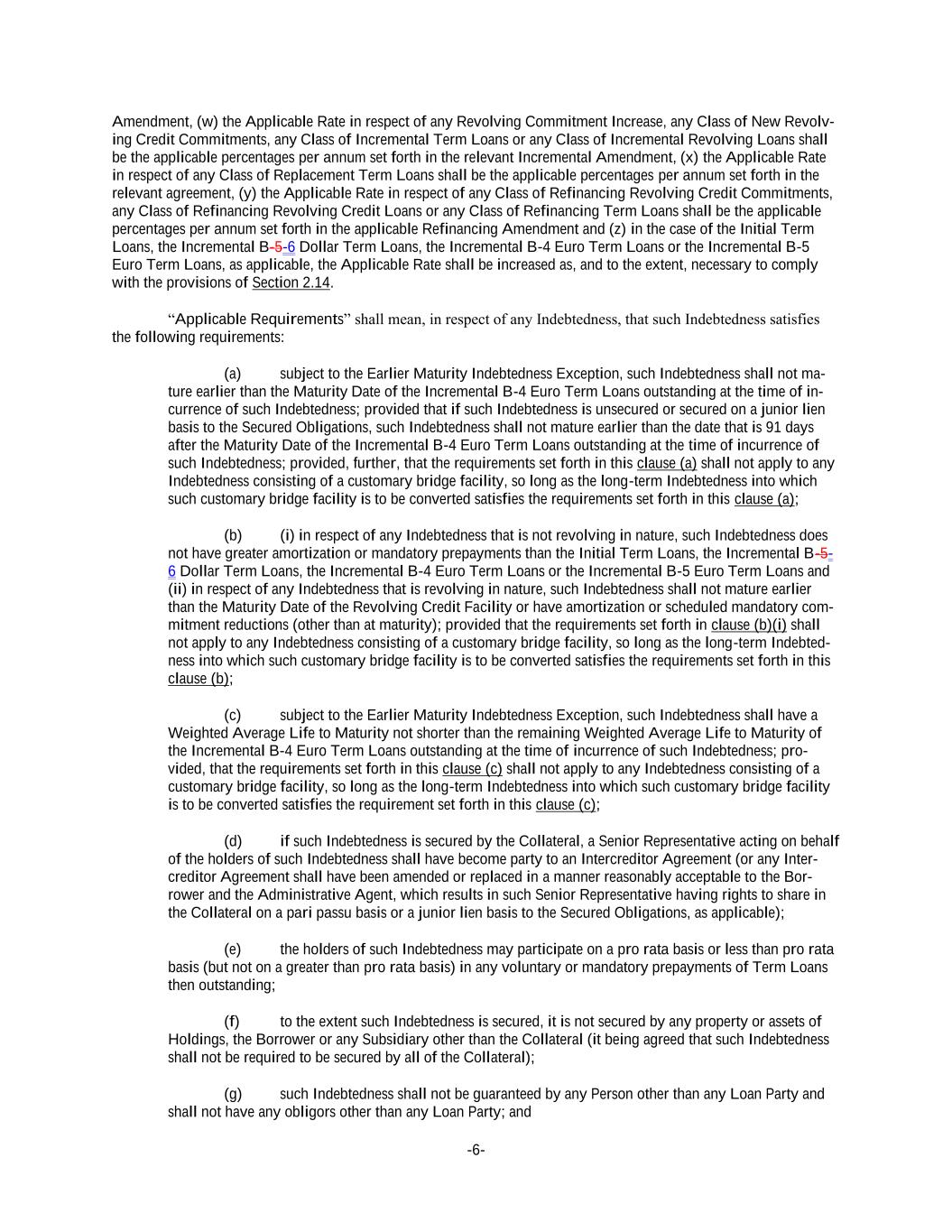 -6- Amendment, (w) the Applicable Rate in respect of any Revolving Commitment Increase, any Class of New Revolv- ing Credit Commitments, any Class of Incremental Term Loans or any Class of Incremental Revolving Loans shall be the applicable percentages per annum set forth in the relevant Incremental Amendment, (x) the Applicable Rate in respect of any Class of Replacement Term Loans shall be the applicable percentages per annum set forth in the relevant agreement, (y) the Applicable Rate in respect of any Class of Refinancing Revolving Credit Commitments, any Class of Refinancing Revolving Credit Loans or any Class of Refinancing Term Loans shall be the applicable percentages per annum set forth in the applicable Refinancing Amendment and (z) in the case of the Initial Term Loans, the Incremental B-5-6 Dollar Term Loans, the Incremental B-4 Euro Term Loans or the Incremental B-5 Euro Term Loans, as applicable, the Applicable Rate shall be increased as, and to the extent, necessary to comply with the provisions of Section 2.14. “Applicable Requirements” shall mean, in respect of any Indebtedness, that such Indebtedness satisfies the following requirements: (a) subject to the Earlier Maturity Indebtedness Exception, such Indebtedness shall not ma- ture earlier than the Maturity Date of the Incremental B-4 Euro Term Loans outstanding at the time of in- currence of such Indebtedness; provided that if such Indebtedness is unsecured or secured on a junior lien basis to the Secured Obligations, such Indebtedness shall not mature earlier than the date that is 91 days after the Maturity Date of the Incremental B-4 Euro Term Loans outstanding at the time of incurrence of such Indebtedness; provided, further, that the requirements set forth in this clause (a) shall not apply to any Indebtedness consisting of a customary bridge facility, so long as the long-term Indebtedness into which such customary bridge facility is to be converted satisfies the requirements set forth in this clause (a); (b) (i) in respect of any Indebtedness that is not revolving in nature, such Indebtedness does not have greater amortization or mandatory prepayments than the Initial Term Loans, the Incremental B-5- 6 Dollar Term Loans, the Incremental B-4 Euro Term Loans or the Incremental B-5 Euro Term Loans and (ii) in respect of any Indebtedness that is revolving in nature, such Indebtedness shall not mature earlier than the Maturity Date of the Revolving Credit Facility or have amortization or scheduled mandatory com- mitment reductions (other than at maturity); provided that the requirements set forth in clause (b)(i) shall not apply to any Indebtedness consisting of a customary bridge facility, so long as the long-term Indebted- ness into which such customary bridge facility is to be converted satisfies the requirements set forth in this clause (b); (c) subject to the Earlier Maturity Indebtedness Exception, such Indebtedness shall have a Weighted Average Life to Maturity not shorter than the remaining Weighted Average Life to Maturity of the Incremental B-4 Euro Term Loans outstanding at the time of incurrence of such Indebtedness; pro- vided, that the requirements set forth in this clause (c) shall not apply to any Indebtedness consisting of a customary bridge facility, so long as the long-term Indebtedness into which such customary bridge facility is to be converted satisfies the requirement set forth in this clause (c); (d) if such Indebtedness is secured by the Collateral, a Senior Representative acting on behalf of the holders of such Indebtedness shall have become party to an Intercreditor Agreement (or any Inter- creditor Agreement shall have been amended or replaced in a manner reasonably acceptable to the Bor- rower and the Administrative Agent, which results in such Senior Representative having rights to share in the Collateral on a pari passu basis or a junior lien basis to the Secured Obligations, as applicable); (e) the holders of such Indebtedness may participate on a pro rata basis or less than pro rata basis (but not on a greater than pro rata basis) in any voluntary or mandatory prepayments of Term Loans then outstanding; (f) to the extent such Indebtedness is secured, it is not secured by any property or assets of Holdings, the Borrower or any Subsidiary other than the Collateral (it being agreed that such Indebtedness shall not be required to be secured by all of the Collateral); (g) such Indebtedness shall not be guaranteed by any Person other than any Loan Party and shall not have any obligors other than any Loan Party; and