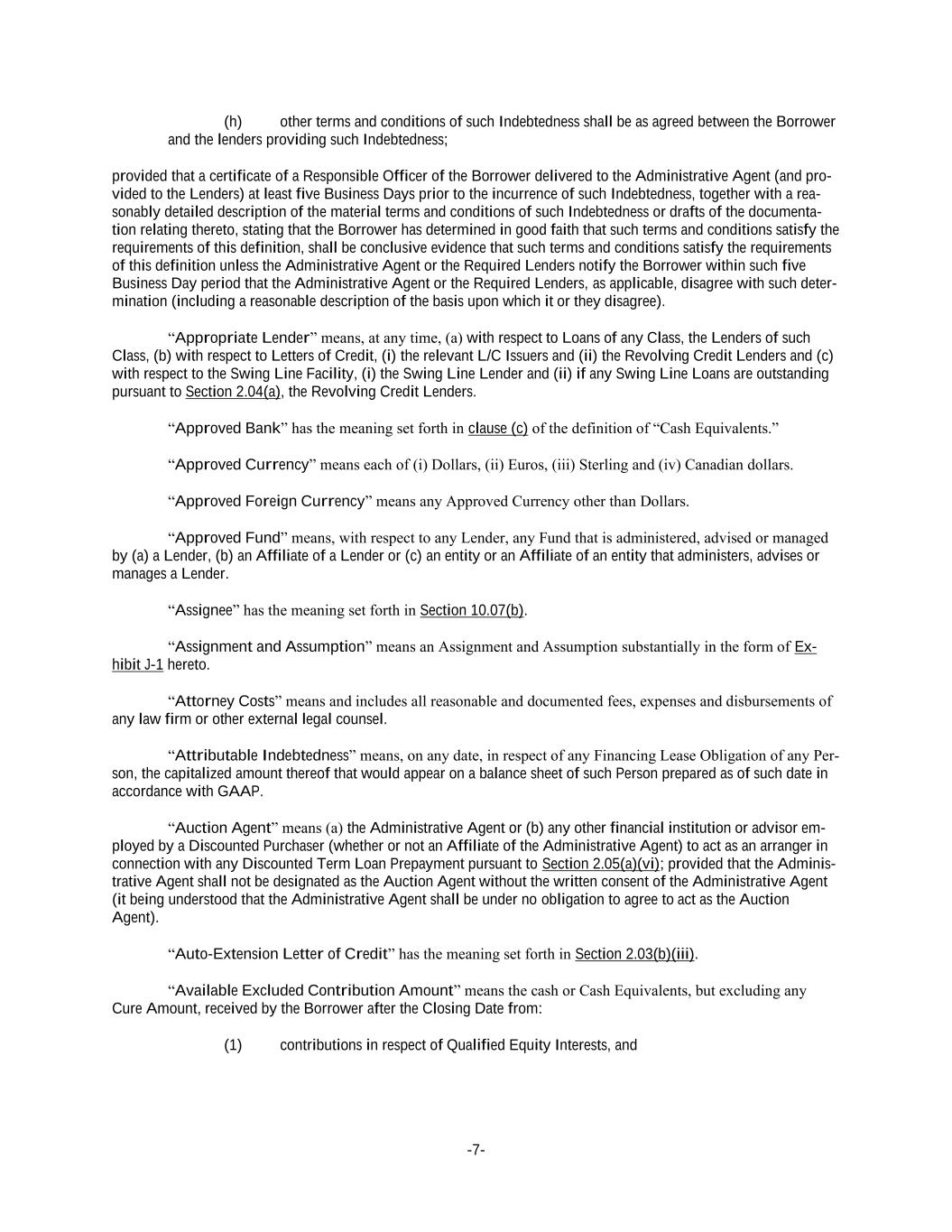 -7- (h) other terms and conditions of such Indebtedness shall be as agreed between the Borrower and the lenders providing such Indebtedness; provided that a certificate of a Responsible Officer of the Borrower delivered to the Administrative Agent (and pro- vided to the Lenders) at least five Business Days prior to the incurrence of such Indebtedness, together with a rea- sonably detailed description of the material terms and conditions of such Indebtedness or drafts of the documenta- tion relating thereto, stating that the Borrower has determined in good faith that such terms and conditions satisfy the requirements of this definition, shall be conclusive evidence that such terms and conditions satisfy the requirements of this definition unless the Administrative Agent or the Required Lenders notify the Borrower within such five Business Day period that the Administrative Agent or the Required Lenders, as applicable, disagree with such deter- mination (including a reasonable description of the basis upon which it or they disagree). “Appropriate Lender” means, at any time, (a) with respect to Loans of any Class, the Lenders of such Class, (b) with respect to Letters of Credit, (i) the relevant L/C Issuers and (ii) the Revolving Credit Lenders and (c) with respect to the Swing Line Facility, (i) the Swing Line Lender and (ii) if any Swing Line Loans are outstanding pursuant to Section 2.04(a), the Revolving Credit Lenders. “Approved Bank” has the meaning set forth in clause (c) of the definition of “Cash Equivalents.” “Approved Currency” means each of (i) Dollars, (ii) Euros, (iii) Sterling and (iv) Canadian dollars. “Approved Foreign Currency” means any Approved Currency other than Dollars. “Approved Fund” means, with respect to any Lender, any Fund that is administered, advised or managed by (a) a Lender, (b) an Affiliate of a Lender or (c) an entity or an Affiliate of an entity that administers, advises or manages a Lender. “Assignee” has the meaning set forth in Section 10.07(b). “Assignment and Assumption” means an Assignment and Assumption substantially in the form of Ex- hibit J-1 hereto. “Attorney Costs” means and includes all reasonable and documented fees, expenses and disbursements of any law firm or other external legal counsel. “Attributable Indebtedness” means, on any date, in respect of any Financing Lease Obligation of any Per- son, the capitalized amount thereof that would appear on a balance sheet of such Person prepared as of such date in accordance with GAAP. “Auction Agent” means (a) the Administrative Agent or (b) any other financial institution or advisor em- ployed by a Discounted Purchaser (whether or not an Affiliate of the Administrative Agent) to act as an arranger in connection with any Discounted Term Loan Prepayment pursuant to Section 2.05(a)(vi); provided that the Adminis- trative Agent shall not be designated as the Auction Agent without the written consent of the Administrative Agent (it being understood that the Administrative Agent shall be under no obligation to agree to act as the Auction Agent). “Auto-Extension Letter of Credit” has the meaning set forth in Section 2.03(b)(iii). “Available Excluded Contribution Amount” means the cash or Cash Equivalents, but excluding any Cure Amount, received by the Borrower after the Closing Date from: (1) contributions in respect of Qualified Equity Interests, and