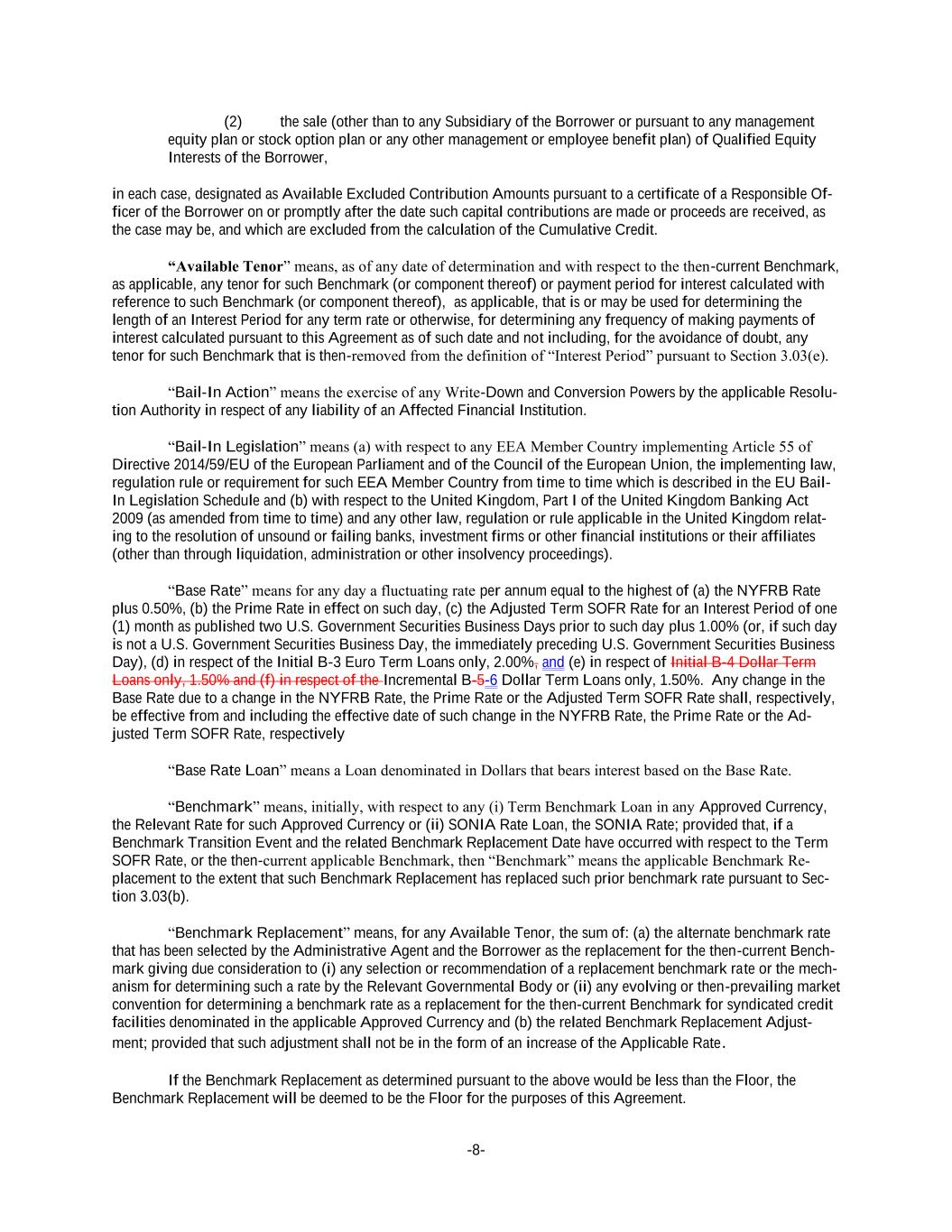 -8- (2) the sale (other than to any Subsidiary of the Borrower or pursuant to any management equity plan or stock option plan or any other management or employee benefit plan) of Qualified Equity Interests of the Borrower, in each case, designated as Available Excluded Contribution Amounts pursuant to a certificate of a Responsible Of- ficer of the Borrower on or promptly after the date such capital contributions are made or proceeds are received, as the case may be, and which are excluded from the calculation of the Cumulative Credit. “Available Tenor” means, as of any date of determination and with respect to the then-current Benchmark, as applicable, any tenor for such Benchmark (or component thereof) or payment period for interest calculated with reference to such Benchmark (or component thereof), as applicable, that is or may be used for determining the length of an Interest Period for any term rate or otherwise, for determining any frequency of making payments of interest calculated pursuant to this Agreement as of such date and not including, for the avoidance of doubt, any tenor for such Benchmark that is then-removed from the definition of “Interest Period” pursuant to Section 3.03(e). “Bail-In Action” means the exercise of any Write-Down and Conversion Powers by the applicable Resolu- tion Authority in respect of any liability of an Affected Financial Institution. “Bail-In Legislation” means (a) with respect to any EEA Member Country implementing Article 55 of Directive 2014/59/EU of the European Parliament and of the Council of the European Union, the implementing law, regulation rule or requirement for such EEA Member Country from time to time which is described in the EU Bail- In Legislation Schedule and (b) with respect to the United Kingdom, Part I of the United Kingdom Banking Act 2009 (as amended from time to time) and any other law, regulation or rule applicable in the United Kingdom relat- ing to the resolution of unsound or failing banks, investment firms or other financial institutions or their affiliates (other than through liquidation, administration or other insolvency proceedings). “Base Rate” means for any day a fluctuating rate per annum equal to the highest of (a) the NYFRB Rate plus 0.50%, (b) the Prime Rate in effect on such day, (c) the Adjusted Term SOFR Rate for an Interest Period of one (1) month as published two U.S. Government Securities Business Days prior to such day plus 1.00% (or, if such day is not a U.S. Government Securities Business Day, the immediately preceding U.S. Government Securities Business Day), (d) in respect of the Initial B-3 Euro Term Loans only, 2.00%, and (e) in respect of Initial B-4 Dollar Term Loans only, 1.50% and (f) in respect of the Incremental B-5-6 Dollar Term Loans only, 1.50%. Any change in the Base Rate due to a change in the NYFRB Rate, the Prime Rate or the Adjusted Term SOFR Rate shall, respectively, be effective from and including the effective date of such change in the NYFRB Rate, the Prime Rate or the Ad- justed Term SOFR Rate, respectively “Base Rate Loan” means a Loan denominated in Dollars that bears interest based on the Base Rate. “Benchmark” means, initially, with respect to any (i) Term Benchmark Loan in any Approved Currency, the Relevant Rate for such Approved Currency or (ii) SONIA Rate Loan, the SONIA Rate; provided that, if a Benchmark Transition Event and the related Benchmark Replacement Date have occurred with respect to the Term SOFR Rate, or the then-current applicable Benchmark, then “Benchmark” means the applicable Benchmark Re- placement to the extent that such Benchmark Replacement has replaced such prior benchmark rate pursuant to Sec- tion 3.03(b). “Benchmark Replacement” means, for any Available Tenor, the sum of: (a) the alternate benchmark rate that has been selected by the Administrative Agent and the Borrower as the replacement for the then-current Bench- mark giving due consideration to (i) any selection or recommendation of a replacement benchmark rate or the mech- anism for determining such a rate by the Relevant Governmental Body or (ii) any evolving or then-prevailing market convention for determining a benchmark rate as a replacement for the then-current Benchmark for syndicated credit facilities denominated in the applicable Approved Currency and (b) the related Benchmark Replacement Adjust- ment; provided that such adjustment shall not be in the form of an increase of the Applicable Rate. If the Benchmark Replacement as determined pursuant to the above would be less than the Floor, the Benchmark Replacement will be deemed to be the Floor for the purposes of this Agreement.