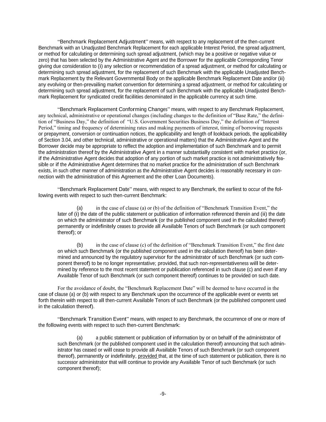 -9- “Benchmark Replacement Adjustment” means, with respect to any replacement of the then-current Benchmark with an Unadjusted Benchmark Replacement for each applicable Interest Period, the spread adjustment, or method for calculating or determining such spread adjustment, (which may be a positive or negative value or zero) that has been selected by the Administrative Agent and the Borrower for the applicable Corresponding Tenor giving due consideration to (i) any selection or recommendation of a spread adjustment, or method for calculating or determining such spread adjustment, for the replacement of such Benchmark with the applicable Unadjusted Bench- mark Replacement by the Relevant Governmental Body on the applicable Benchmark Replacement Date and/or (ii) any evolving or then-prevailing market convention for determining a spread adjustment, or method for calculating or determining such spread adjustment, for the replacement of such Benchmark with the applicable Unadjusted Bench- mark Replacement for syndicated credit facilities denominated in the applicable currency at such time. “Benchmark Replacement Conforming Changes” means, with respect to any Benchmark Replacement, any technical, administrative or operational changes (including changes to the definition of “Base Rate,” the defini- tion of “Business Day,” the definition of “U.S. Government Securities Business Day,” the definition of “Interest Period,” timing and frequency of determining rates and making payments of interest, timing of borrowing requests or prepayment, conversion or continuation notices, the applicability and length of lookback periods, the applicability of Section 3.04, and other technical, administrative or operational matters) that the Administrative Agent and the Borrower decide may be appropriate to reflect the adoption and implementation of such Benchmark and to permit the administration thereof by the Administrative Agent in a manner substantially consistent with market practice (or, if the Administrative Agent decides that adoption of any portion of such market practice is not administratively fea- sible or if the Administrative Agent determines that no market practice for the administration of such Benchmark exists, in such other manner of administration as the Administrative Agent decides is reasonably necessary in con- nection with the administration of this Agreement and the other Loan Documents). “Benchmark Replacement Date” means, with respect to any Benchmark, the earliest to occur of the fol- lowing events with respect to such then-current Benchmark: (a) in the case of clause (a) or (b) of the definition of “Benchmark Transition Event,” the later of (i) the date of the public statement or publication of information referenced therein and (ii) the date on which the administrator of such Benchmark (or the published component used in the calculated thereof) permanently or indefinitely ceases to provide all Available Tenors of such Benchmark (or such component thereof); or (b) in the case of clause (c) of the definition of “Benchmark Transition Event,” the first date on which such Benchmark (or the published component used in the calculation thereof) has been deter- mined and announced by the regulatory supervisor for the administrator of such Benchmark (or such com- ponent thereof) to be no longer representative; provided, that such non-representativeness will be deter- mined by reference to the most recent statement or publication referenced in such clause (c) and even if any Available Tenor of such Benchmark (or such component thereof) continues to be provided on such date. For the avoidance of doubt, the “Benchmark Replacement Date” will be deemed to have occurred in the case of clause (a) or (b) with respect to any Benchmark upon the occurrence of the applicable event or events set forth therein with respect to all then-current Available Tenors of such Benchmark (or the published component used in the calculation thereof). “Benchmark Transition Event” means, with respect to any Benchmark, the occurrence of one or more of the following events with respect to such then-current Benchmark: (a) a public statement or publication of information by or on behalf of the administrator of such Benchmark (or the published component used in the calculation thereof) announcing that such admin- istrator has ceased or will cease to provide all Available Tenors of such Benchmark (or such component thereof), permanently or indefinitely, provided that, at the time of such statement or publication, there is no successor administrator that will continue to provide any Available Tenor of such Benchmark (or such component thereof);