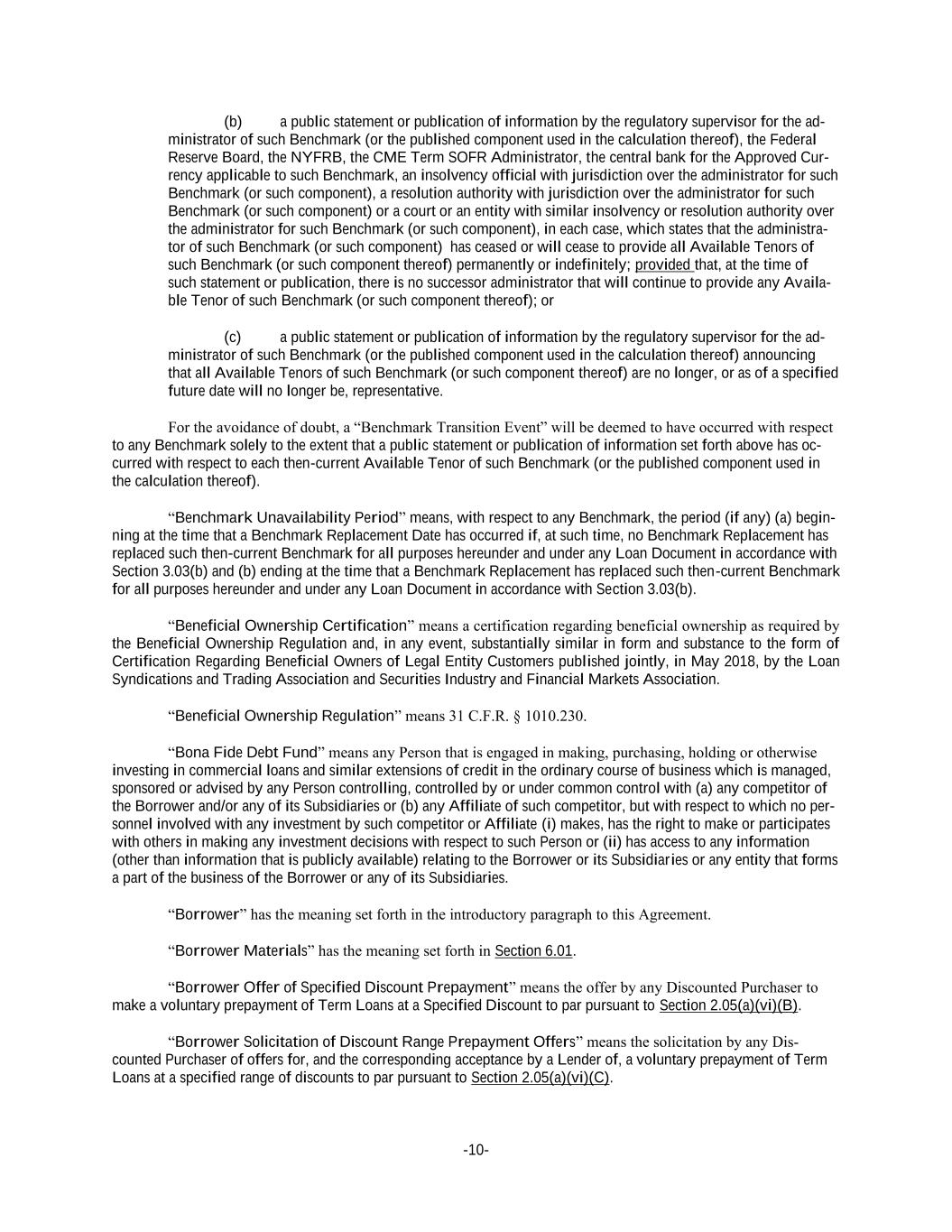 -10- (b) a public statement or publication of information by the regulatory supervisor for the ad- ministrator of such Benchmark (or the published component used in the calculation thereof), the Federal Reserve Board, the NYFRB, the CME Term SOFR Administrator, the central bank for the Approved Cur- rency applicable to such Benchmark, an insolvency official with jurisdiction over the administrator for such Benchmark (or such component), a resolution authority with jurisdiction over the administrator for such Benchmark (or such component) or a court or an entity with similar insolvency or resolution authority over the administrator for such Benchmark (or such component), in each case, which states that the administra- tor of such Benchmark (or such component) has ceased or will cease to provide all Available Tenors of such Benchmark (or such component thereof) permanently or indefinitely; provided that, at the time of such statement or publication, there is no successor administrator that will continue to provide any Availa- ble Tenor of such Benchmark (or such component thereof); or (c) a public statement or publication of information by the regulatory supervisor for the ad- ministrator of such Benchmark (or the published component used in the calculation thereof) announcing that all Available Tenors of such Benchmark (or such component thereof) are no longer, or as of a specified future date will no longer be, representative. For the avoidance of doubt, a “Benchmark Transition Event” will be deemed to have occurred with respect to any Benchmark solely to the extent that a public statement or publication of information set forth above has oc- curred with respect to each then-current Available Tenor of such Benchmark (or the published component used in the calculation thereof). “Benchmark Unavailability Period” means, with respect to any Benchmark, the period (if any) (a) begin- ning at the time that a Benchmark Replacement Date has occurred if, at such time, no Benchmark Replacement has replaced such then-current Benchmark for all purposes hereunder and under any Loan Document in accordance with Section 3.03(b) and (b) ending at the time that a Benchmark Replacement has replaced such then-current Benchmark for all purposes hereunder and under any Loan Document in accordance with Section 3.03(b). “Beneficial Ownership Certification” means a certification regarding beneficial ownership as required by the Beneficial Ownership Regulation and, in any event, substantially similar in form and substance to the form of Certification Regarding Beneficial Owners of Legal Entity Customers published jointly, in May 2018, by the Loan Syndications and Trading Association and Securities Industry and Financial Markets Association. “Beneficial Ownership Regulation” means 31 C.F.R. § 1010.230. “Bona Fide Debt Fund” means any Person that is engaged in making, purchasing, holding or otherwise investing in commercial loans and similar extensions of credit in the ordinary course of business which is managed, sponsored or advised by any Person controlling, controlled by or under common control with (a) any competitor of the Borrower and/or any of its Subsidiaries or (b) any Affiliate of such competitor, but with respect to which no per- sonnel involved with any investment by such competitor or Affiliate (i) makes, has the right to make or participates with others in making any investment decisions with respect to such Person or (ii) has access to any information (other than information that is publicly available) relating to the Borrower or its Subsidiaries or any entity that forms a part of the business of the Borrower or any of its Subsidiaries. “Borrower” has the meaning set forth in the introductory paragraph to this Agreement. “Borrower Materials” has the meaning set forth in Section 6.01. “Borrower Offer of Specified Discount Prepayment” means the offer by any Discounted Purchaser to make a voluntary prepayment of Term Loans at a Specified Discount to par pursuant to Section 2.05(a)(vi)(B). “Borrower Solicitation of Discount Range Prepayment Offers” means the solicitation by any Dis- counted Purchaser of offers for, and the corresponding acceptance by a Lender of, a voluntary prepayment of Term Loans at a specified range of discounts to par pursuant to Section 2.05(a)(vi)(C).