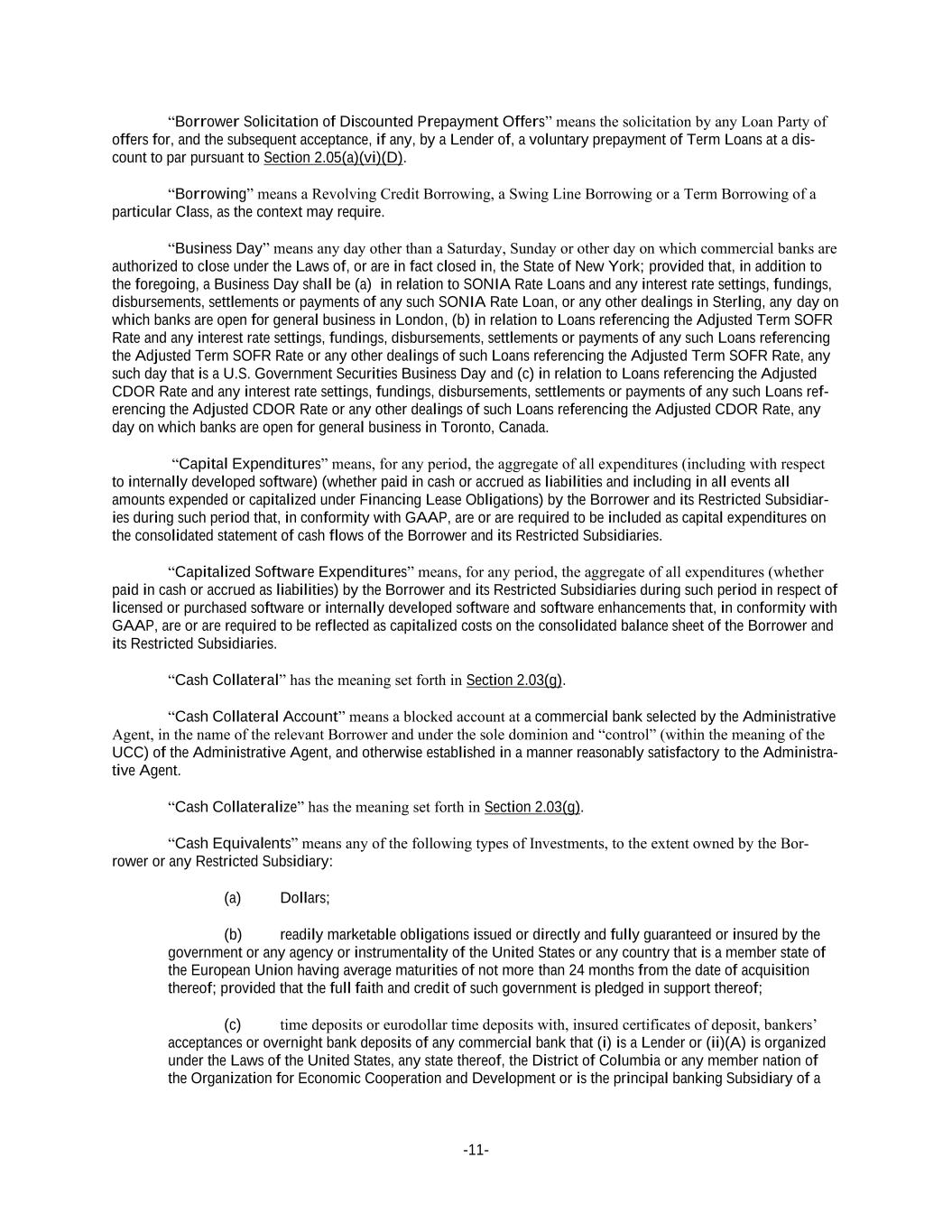 -11- “Borrower Solicitation of Discounted Prepayment Offers” means the solicitation by any Loan Party of offers for, and the subsequent acceptance, if any, by a Lender of, a voluntary prepayment of Term Loans at a dis- count to par pursuant to Section 2.05(a)(vi)(D). “Borrowing” means a Revolving Credit Borrowing, a Swing Line Borrowing or a Term Borrowing of a particular Class, as the context may require. “Business Day” means any day other than a Saturday, Sunday or other day on which commercial banks are authorized to close under the Laws of, or are in fact closed in, the State of New York; provided that, in addition to the foregoing, a Business Day shall be (a) in relation to SONIA Rate Loans and any interest rate settings, fundings, disbursements, settlements or payments of any such SONIA Rate Loan, or any other dealings in Sterling, any day on which banks are open for general business in London, (b) in relation to Loans referencing the Adjusted Term SOFR Rate and any interest rate settings, fundings, disbursements, settlements or payments of any such Loans referencing the Adjusted Term SOFR Rate or any other dealings of such Loans referencing the Adjusted Term SOFR Rate, any such day that is a U.S. Government Securities Business Day and (c) in relation to Loans referencing the Adjusted CDOR Rate and any interest rate settings, fundings, disbursements, settlements or payments of any such Loans ref- erencing the Adjusted CDOR Rate or any other dealings of such Loans referencing the Adjusted CDOR Rate, any day on which banks are open for general business in Toronto, Canada. “Capital Expenditures” means, for any period, the aggregate of all expenditures (including with respect to internally developed software) (whether paid in cash or accrued as liabilities and including in all events all amounts expended or capitalized under Financing Lease Obligations) by the Borrower and its Restricted Subsidiar- ies during such period that, in conformity with GAAP, are or are required to be included as capital expenditures on the consolidated statement of cash flows of the Borrower and its Restricted Subsidiaries. “Capitalized Software Expenditures” means, for any period, the aggregate of all expenditures (whether paid in cash or accrued as liabilities) by the Borrower and its Restricted Subsidiaries during such period in respect of licensed or purchased software or internally developed software and software enhancements that, in conformity with GAAP, are or are required to be reflected as capitalized costs on the consolidated balance sheet of the Borrower and its Restricted Subsidiaries. “Cash Collateral” has the meaning set forth in Section 2.03(g). “Cash Collateral Account” means a blocked account at a commercial bank selected by the Administrative Agent, in the name of the relevant Borrower and under the sole dominion and “control” (within the meaning of the UCC) of the Administrative Agent, and otherwise established in a manner reasonably satisfactory to the Administra- tive Agent. “Cash Collateralize” has the meaning set forth in Section 2.03(g). “Cash Equivalents” means any of the following types of Investments, to the extent owned by the Bor- rower or any Restricted Subsidiary: (a) Dollars; (b) readily marketable obligations issued or directly and fully guaranteed or insured by the government or any agency or instrumentality of the United States or any country that is a member state of the European Union having average maturities of not more than 24 months from the date of acquisition thereof; provided that the full faith and credit of such government is pledged in support thereof; (c) time deposits or eurodollar time deposits with, insured certificates of deposit, bankers’ acceptances or overnight bank deposits of any commercial bank that (i) is a Lender or (ii)(A) is organized under the Laws of the United States, any state thereof, the District of Columbia or any member nation of the Organization for Economic Cooperation and Development or is the principal banking Subsidiary of a