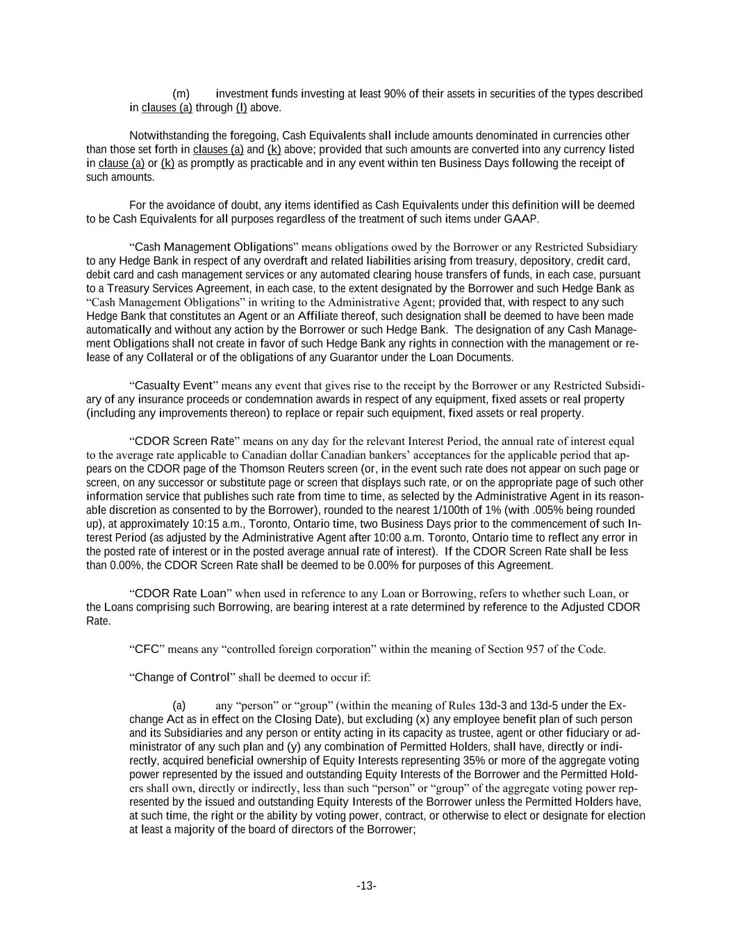 -13- (m) investment funds investing at least 90% of their assets in securities of the types described in clauses (a) through (l) above. Notwithstanding the foregoing, Cash Equivalents shall include amounts denominated in currencies other than those set forth in clauses (a) and (k) above; provided that such amounts are converted into any currency listed in clause (a) or (k) as promptly as practicable and in any event within ten Business Days following the receipt of such amounts. For the avoidance of doubt, any items identified as Cash Equivalents under this definition will be deemed to be Cash Equivalents for all purposes regardless of the treatment of such items under GAAP. “Cash Management Obligations” means obligations owed by the Borrower or any Restricted Subsidiary to any Hedge Bank in respect of any overdraft and related liabilities arising from treasury, depository, credit card, debit card and cash management services or any automated clearing house transfers of funds, in each case, pursuant to a Treasury Services Agreement, in each case, to the extent designated by the Borrower and such Hedge Bank as “Cash Management Obligations” in writing to the Administrative Agent; provided that, with respect to any such Hedge Bank that constitutes an Agent or an Affiliate thereof, such designation shall be deemed to have been made automatically and without any action by the Borrower or such Hedge Bank. The designation of any Cash Manage- ment Obligations shall not create in favor of such Hedge Bank any rights in connection with the management or re- lease of any Collateral or of the obligations of any Guarantor under the Loan Documents. “Casualty Event” means any event that gives rise to the receipt by the Borrower or any Restricted Subsidi- ary of any insurance proceeds or condemnation awards in respect of any equipment, fixed assets or real property (including any improvements thereon) to replace or repair such equipment, fixed assets or real property. “CDOR Screen Rate” means on any day for the relevant Interest Period, the annual rate of interest equal to the average rate applicable to Canadian dollar Canadian bankers’ acceptances for the applicable period that ap- pears on the CDOR page of the Thomson Reuters screen (or, in the event such rate does not appear on such page or screen, on any successor or substitute page or screen that displays such rate, or on the appropriate page of such other information service that publishes such rate from time to time, as selected by the Administrative Agent in its reason- able discretion as consented to by the Borrower), rounded to the nearest 1/100th of 1% (with .005% being rounded up), at approximately 10:15 a.m., Toronto, Ontario time, two Business Days prior to the commencement of such In- terest Period (as adjusted by the Administrative Agent after 10:00 a.m. Toronto, Ontario time to reflect any error in the posted rate of interest or in the posted average annual rate of interest). If the CDOR Screen Rate shall be less than 0.00%, the CDOR Screen Rate shall be deemed to be 0.00% for purposes of this Agreement. “CDOR Rate Loan” when used in reference to any Loan or Borrowing, refers to whether such Loan, or the Loans comprising such Borrowing, are bearing interest at a rate determined by reference to the Adjusted CDOR Rate. “CFC” means any “controlled foreign corporation” within the meaning of Section 957 of the Code. “Change of Control” shall be deemed to occur if: (a) any “person” or “group” (within the meaning of Rules 13d-3 and 13d-5 under the Ex- change Act as in effect on the Closing Date), but excluding (x) any employee benefit plan of such person and its Subsidiaries and any person or entity acting in its capacity as trustee, agent or other fiduciary or ad- ministrator of any such plan and (y) any combination of Permitted Holders, shall have, directly or indi- rectly, acquired beneficial ownership of Equity Interests representing 35% or more of the aggregate voting power represented by the issued and outstanding Equity Interests of the Borrower and the Permitted Hold- ers shall own, directly or indirectly, less than such “person” or “group” of the aggregate voting power rep- resented by the issued and outstanding Equity Interests of the Borrower unless the Permitted Holders have, at such time, the right or the ability by voting power, contract, or otherwise to elect or designate for election at least a majority of the board of directors of the Borrower;