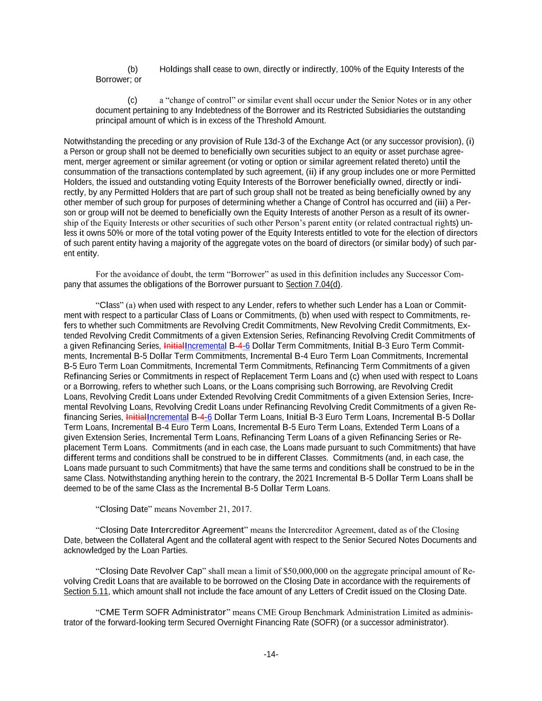 -14- (b) Holdings shall cease to own, directly or indirectly, 100% of the Equity Interests of the Borrower; or (c) a “change of control” or similar event shall occur under the Senior Notes or in any other document pertaining to any Indebtedness of the Borrower and its Restricted Subsidiaries the outstanding principal amount of which is in excess of the Threshold Amount. Notwithstanding the preceding or any provision of Rule 13d-3 of the Exchange Act (or any successor provision), (i) a Person or group shall not be deemed to beneficially own securities subject to an equity or asset purchase agree- ment, merger agreement or similar agreement (or voting or option or similar agreement related thereto) until the consummation of the transactions contemplated by such agreement, (ii) if any group includes one or more Permitted Holders, the issued and outstanding voting Equity Interests of the Borrower beneficially owned, directly or indi- rectly, by any Permitted Holders that are part of such group shall not be treated as being beneficially owned by any other member of such group for purposes of determining whether a Change of Control has occurred and (iii) a Per- son or group will not be deemed to beneficially own the Equity Interests of another Person as a result of its owner- ship of the Equity Interests or other securities of such other Person’s parent entity (or related contractual rights) un- less it owns 50% or more of the total voting power of the Equity Interests entitled to vote for the election of directors of such parent entity having a majority of the aggregate votes on the board of directors (or similar body) of such par- ent entity. For the avoidance of doubt, the term “Borrower” as used in this definition includes any Successor Com- pany that assumes the obligations of the Borrower pursuant to Section 7.04(d). “Class” (a) when used with respect to any Lender, refers to whether such Lender has a Loan or Commit- ment with respect to a particular Class of Loans or Commitments, (b) when used with respect to Commitments, re- fers to whether such Commitments are Revolving Credit Commitments, New Revolving Credit Commitments, Ex- tended Revolving Credit Commitments of a given Extension Series, Refinancing Revolving Credit Commitments of a given Refinancing Series, InitialIncremental B-4-6 Dollar Term Commitments, Initial B-3 Euro Term Commit- ments, Incremental B-5 Dollar Term Commitments, Incremental B-4 Euro Term Loan Commitments, Incremental B-5 Euro Term Loan Commitments, Incremental Term Commitments, Refinancing Term Commitments of a given Refinancing Series or Commitments in respect of Replacement Term Loans and (c) when used with respect to Loans or a Borrowing, refers to whether such Loans, or the Loans comprising such Borrowing, are Revolving Credit Loans, Revolving Credit Loans under Extended Revolving Credit Commitments of a given Extension Series, Incre- mental Revolving Loans, Revolving Credit Loans under Refinancing Revolving Credit Commitments of a given Re- financing Series, InitialIncremental B-4-6 Dollar Term Loans, Initial B-3 Euro Term Loans, Incremental B-5 Dollar Term Loans, Incremental B-4 Euro Term Loans, Incremental B-5 Euro Term Loans, Extended Term Loans of a given Extension Series, Incremental Term Loans, Refinancing Term Loans of a given Refinancing Series or Re- placement Term Loans. Commitments (and in each case, the Loans made pursuant to such Commitments) that have different terms and conditions shall be construed to be in different Classes. Commitments (and, in each case, the Loans made pursuant to such Commitments) that have the same terms and conditions shall be construed to be in the same Class. Notwithstanding anything herein to the contrary, the 2021 Incremental B-5 Dollar Term Loans shall be deemed to be of the same Class as the Incremental B-5 Dollar Term Loans. “Closing Date” means November 21, 2017. “Closing Date Intercreditor Agreement” means the Intercreditor Agreement, dated as of the Closing Date, between the Collateral Agent and the collateral agent with respect to the Senior Secured Notes Documents and acknowledged by the Loan Parties. “Closing Date Revolver Cap” shall mean a limit of $50,000,000 on the aggregate principal amount of Re- volving Credit Loans that are available to be borrowed on the Closing Date in accordance with the requirements of Section 5.11, which amount shall not include the face amount of any Letters of Credit issued on the Closing Date. “CME Term SOFR Administrator” means CME Group Benchmark Administration Limited as adminis- trator of the forward-looking term Secured Overnight Financing Rate (SOFR) (or a successor administrator).