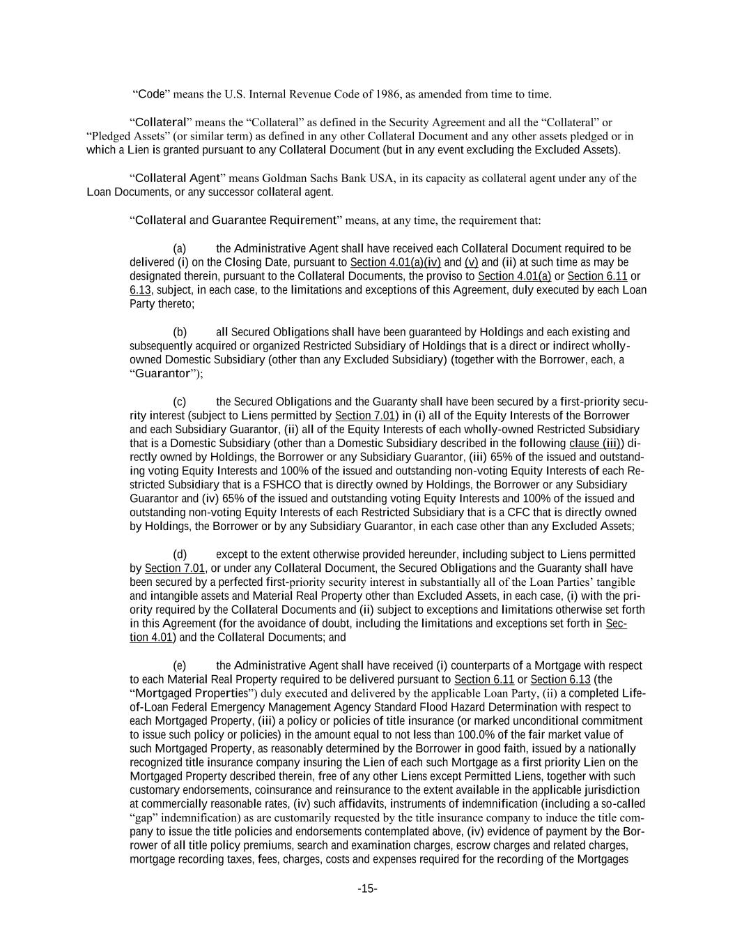 -15- “Code” means the U.S. Internal Revenue Code of 1986, as amended from time to time. “Collateral” means the “Collateral” as defined in the Security Agreement and all the “Collateral” or “Pledged Assets” (or similar term) as defined in any other Collateral Document and any other assets pledged or in which a Lien is granted pursuant to any Collateral Document (but in any event excluding the Excluded Assets). “Collateral Agent” means Goldman Sachs Bank USA, in its capacity as collateral agent under any of the Loan Documents, or any successor collateral agent. “Collateral and Guarantee Requirement” means, at any time, the requirement that: (a) the Administrative Agent shall have received each Collateral Document required to be delivered (i) on the Closing Date, pursuant to Section 4.01(a)(iv) and (v) and (ii) at such time as may be designated therein, pursuant to the Collateral Documents, the proviso to Section 4.01(a) or Section 6.11 or 6.13, subject, in each case, to the limitations and exceptions of this Agreement, duly executed by each Loan Party thereto; (b) all Secured Obligations shall have been guaranteed by Holdings and each existing and subsequently acquired or organized Restricted Subsidiary of Holdings that is a direct or indirect wholly- owned Domestic Subsidiary (other than any Excluded Subsidiary) (together with the Borrower, each, a “Guarantor”); (c) the Secured Obligations and the Guaranty shall have been secured by a first-priority secu- rity interest (subject to Liens permitted by Section 7.01) in (i) all of the Equity Interests of the Borrower and each Subsidiary Guarantor, (ii) all of the Equity Interests of each wholly-owned Restricted Subsidiary that is a Domestic Subsidiary (other than a Domestic Subsidiary described in the following clause (iii)) di- rectly owned by Holdings, the Borrower or any Subsidiary Guarantor, (iii) 65% of the issued and outstand- ing voting Equity Interests and 100% of the issued and outstanding non-voting Equity Interests of each Re- stricted Subsidiary that is a FSHCO that is directly owned by Holdings, the Borrower or any Subsidiary Guarantor and (iv) 65% of the issued and outstanding voting Equity Interests and 100% of the issued and outstanding non-voting Equity Interests of each Restricted Subsidiary that is a CFC that is directly owned by Holdings, the Borrower or by any Subsidiary Guarantor, in each case other than any Excluded Assets; (d) except to the extent otherwise provided hereunder, including subject to Liens permitted by Section 7.01, or under any Collateral Document, the Secured Obligations and the Guaranty shall have been secured by a perfected first-priority security interest in substantially all of the Loan Parties’ tangible and intangible assets and Material Real Property other than Excluded Assets, in each case, (i) with the pri- ority required by the Collateral Documents and (ii) subject to exceptions and limitations otherwise set forth in this Agreement (for the avoidance of doubt, including the limitations and exceptions set forth in Sec- tion 4.01) and the Collateral Documents; and (e) the Administrative Agent shall have received (i) counterparts of a Mortgage with respect to each Material Real Property required to be delivered pursuant to Section 6.11 or Section 6.13 (the “Mortgaged Properties”) duly executed and delivered by the applicable Loan Party, (ii) a completed Life- of-Loan Federal Emergency Management Agency Standard Flood Hazard Determination with respect to each Mortgaged Property, (iii) a policy or policies of title insurance (or marked unconditional commitment to issue such policy or policies) in the amount equal to not less than 100.0% of the fair market value of such Mortgaged Property, as reasonably determined by the Borrower in good faith, issued by a nationally recognized title insurance company insuring the Lien of each such Mortgage as a first priority Lien on the Mortgaged Property described therein, free of any other Liens except Permitted Liens, together with such customary endorsements, coinsurance and reinsurance to the extent available in the applicable jurisdiction at commercially reasonable rates, (iv) such affidavits, instruments of indemnification (including a so-called “gap” indemnification) as are customarily requested by the title insurance company to induce the title com- pany to issue the title policies and endorsements contemplated above, (iv) evidence of payment by the Bor- rower of all title policy premiums, search and examination charges, escrow charges and related charges, mortgage recording taxes, fees, charges, costs and expenses required for the recording of the Mortgages