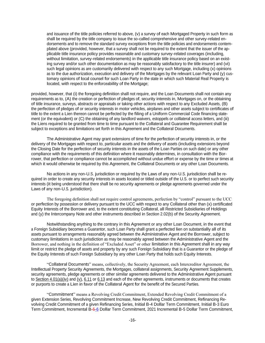 -16- and issuance of the title policies referred to above, (v) a survey of each Mortgaged Property in such form as shall be required by the title company to issue the so-called comprehensive and other survey-related en- dorsements and to remove the standard survey exceptions from the title policies and endorsements contem- plated above (provided, however, that a survey shall not be required to the extent that the issuer of the ap- plicable title insurance policy provides reasonable and customary survey-related coverages (including, without limitation, survey-related endorsements) in the applicable title insurance policy based on an exist- ing survey and/or such other documentation as may be reasonably satisfactory to the title insurer) and (vi) such legal opinions as are customarily delivered with respect to any such Mortgage, including (x) opinions as to the due authorization, execution and delivery of the Mortgages by the relevant Loan Party and (y) cus- tomary opinions of local counsel for such Loan Party in the state in which such Material Real Property is located, with respect to the enforceability of the Mortgage; provided, however, that (i) the foregoing definition shall not require, and the Loan Documents shall not contain any requirements as to, (A) the creation or perfection of pledges of, security interests in, Mortgages on, or the obtaining of title insurance, surveys, abstracts or appraisals or taking other actions with respect to any Excluded Assets, (B) the perfection of pledges of or security interests in motor vehicles, airplanes and other assets subject to certificates of title to the extent a Lien thereon cannot be perfected by the filing of a Uniform Commercial Code financing state- ment (or the equivalent) or (C) the obtaining of any landlord waivers, estoppels or collateral access letters, and (ii) the Liens required to be granted from time to time pursuant to the Collateral and Guarantee Requirement shall be subject to exceptions and limitations set forth in this Agreement and the Collateral Documents. The Administrative Agent may grant extensions of time for the perfection of security interests in, or the delivery of the Mortgages with respect to, particular assets and the delivery of assets (including extensions beyond the Closing Date for the perfection of security interests in the assets of the Loan Parties on such date) or any other compliance with the requirements of this definition where it reasonably determines, in consultation with the Bor- rower, that perfection or compliance cannot be accomplished without undue effort or expense by the time or times at which it would otherwise be required by this Agreement, the Collateral Documents or any other Loan Documents. No actions in any non-U.S. jurisdiction or required by the Laws of any non-U.S. jurisdiction shall be re- quired in order to create any security interests in assets located or titled outside of the U.S. or to perfect such security interests (it being understood that there shall be no security agreements or pledge agreements governed under the Laws of any non-U.S. jurisdiction). The foregoing definition shall not require control agreements, perfection by “control” pursuant to the UCC or perfection by possession or delivery pursuant to the UCC with respect to any Collateral other than (x) certificated Equity Interests of the Borrower and, to the extent constituting Collateral, all Restricted Subsidiaries of Holdings and (y) the Intercompany Note and other instruments described in Section 2.02(b) of the Security Agreement. Notwithstanding anything to the contrary in this Agreement or any other Loan Document, in the event that a Foreign Subsidiary becomes a Guarantor, such Loan Party shall grant a perfected lien on substantially all of its assets pursuant to arrangements reasonably agreed between the Administrative Agent and the Borrower, subject to customary limitations in such jurisdiction as may be reasonably agreed between the Administrative Agent and the Borrower, and nothing in the definition of “Excluded Asset” or other limitation in this Agreement shall in any way limit or restrict the pledge of assets and property by any such Foreign Subsidiary that is a Guarantor or the pledge of the Equity Interests of such Foreign Subsidiary by any other Loan Party that holds such Equity Interests. “Collateral Documents” means, collectively, the Security Agreement, each Intercreditor Agreement, the Intellectual Property Security Agreements, the Mortgages, collateral assignments, Security Agreement Supplements, security agreements, pledge agreements or other similar agreements delivered to the Administrative Agent pursuant to Section 4.01(a)(iv) and (v), 6.11 or 6.13 and each of the other agreements, instruments or documents that creates or purports to create a Lien in favor of the Collateral Agent for the benefit of the Secured Parties. “Commitment” means a Revolving Credit Commitment, Extended Revolving Credit Commitment of a given Extension Series, Revolving Commitment Increase, New Revolving Credit Commitment, Refinancing Re- volving Credit Commitment of a given Refinancing Series, Initial B-4 Dollar Term Commitment, Initial B-3 Euro Term Commitment, Incremental B-5-6 Dollar Term Commitment, 2021 Incremental B-5 Dollar Term Commitment,
