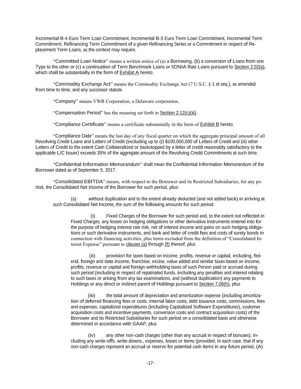 -17- Incremental B-4 Euro Term Loan Commitment, Incremental B-5 Euro Term Loan Commitment, Incremental Term Commitment, Refinancing Term Commitment of a given Refinancing Series or a Commitment in respect of Re- placement Term Loans, as the context may require. “Committed Loan Notice” means a written notice of (a) a Borrowing, (b) a conversion of Loans from one Type to the other or (c) a continuation of Term Benchmark Loans or SONIA Rate Loans pursuant to Section 2.02(a), which shall be substantially in the form of Exhibit A hereto. “Commodity Exchange Act” means the Commodity Exchange Act (7 U.S.C. § 1 et seq.), as amended from time to time, and any successor statute. “Company” means VWR Corporation, a Delaware corporation. “Compensation Period” has the meaning set forth in Section 2.12(c)(ii). “Compliance Certificate” means a certificate substantially in the form of Exhibit B hereto. “Compliance Date” means the last day of any fiscal quarter on which the aggregate principal amount of all Revolving Credit Loans and Letters of Credit (excluding up to (i) $100,000,000 of Letters of Credit and (ii) other Letters of Credit to the extent Cash Collateralized or backstopped by a letter of credit reasonably satisfactory to the applicable L/C Issuer) exceeds 35% of the aggregate amount of the Revolving Credit Commitments at such time. “Confidential Information Memorandum” shall mean the Confidential Information Memorandum of the Borrower dated as of September 5, 2017. “Consolidated EBITDA” means, with respect to the Borrower and its Restricted Subsidiaries, for any pe- riod, the Consolidated Net Income of the Borrower for such period, plus: (a) without duplication and to the extent already deducted (and not added back) in arriving at such Consolidated Net Income, the sum of the following amounts for such period: (i) Fixed Charges of the Borrower for such period and, to the extent not reflected in Fixed Charges, any losses on hedging obligations or other derivative instruments entered into for the purpose of hedging interest rate risk, net of interest income and gains on such hedging obliga- tions or such derivative instruments, and bank and letter of credit fees and costs of surety bonds in connection with financing activities, plus items excluded from the definition of “Consolidated In- terest Expense” pursuant to clauses (a) through (f) thereof, plus (ii) provision for taxes based on income, profits, revenue or capital, including, fed- eral, foreign and state income, franchise, excise, value added and similar taxes based on income, profits, revenue or capital and foreign withholding taxes of such Person paid or accrued during such period (including in respect of repatriated funds, including any penalties and interest relating to such taxes or arising from any tax examinations, and (without duplication) any payments to Holdings or any direct or indirect parent of Holdings pursuant to Section 7.06(h), plus (iii) the total amount of depreciation and amortization expense (including amortiza- tion of deferred financing fees or costs, internal labor costs, debt issuance costs, commissions, fees and expenses, capitalized expenditures (including Capitalized Software Expenditures), customer acquisition costs and incentive payments, conversion costs and contract acquisition costs) of the Borrower and its Restricted Subsidiaries for such period on a consolidated basis and otherwise determined in accordance with GAAP, plus (iv) any other non-cash charges (other than any accrual in respect of bonuses), in- cluding any write-offs, write-downs,, expenses, losses or items (provided, in each case, that if any non-cash charges represent an accrual or reserve for potential cash items in any future period, (A)