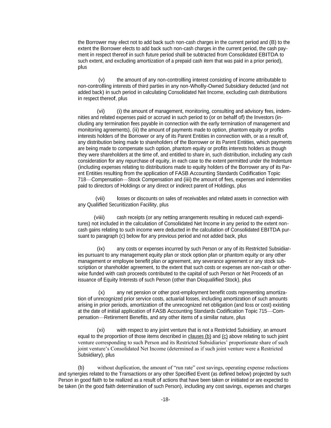 -18- the Borrower may elect not to add back such non-cash charges in the current period and (B) to the extent the Borrower elects to add back such non-cash charges in the current period, the cash pay- ment in respect thereof in such future period shall be subtracted from Consolidated EBITDA to such extent, and excluding amortization of a prepaid cash item that was paid in a prior period), plus (v) the amount of any non-controlling interest consisting of income attributable to non-controlling interests of third parties in any non-Wholly-Owned Subsidiary deducted (and not added back) in such period in calculating Consolidated Net Income, excluding cash distributions in respect thereof, plus (vi) (i) the amount of management, monitoring, consulting and advisory fees, indem- nities and related expenses paid or accrued in such period to (or on behalf of) the Investors (in- cluding any termination fees payable in connection with the early termination of management and monitoring agreements), (ii) the amount of payments made to option, phantom equity or profits interests holders of the Borrower or any of its Parent Entities in connection with, or as a result of, any distribution being made to shareholders of the Borrower or its Parent Entities, which payments are being made to compensate such option, phantom equity or profits interests holders as though they were shareholders at the time of, and entitled to share in, such distribution, including any cash consideration for any repurchase of equity, in each case to the extent permitted under the Indenture (including expenses relating to distributions made to equity holders of the Borrower any of its Par- ent Entities resulting from the application of FASB Accounting Standards Codification Topic 718—Compensation—Stock Compensation and (iii) the amount of fees, expenses and indemnities paid to directors of Holdings or any direct or indirect parent of Holdings, plus (vii) losses or discounts on sales of receivables and related assets in connection with any Qualified Securitization Facility, plus (viii) cash receipts (or any netting arrangements resulting in reduced cash expendi- tures) not included in the calculation of Consolidated Net Income in any period to the extent non- cash gains relating to such income were deducted in the calculation of Consolidated EBITDA pur- suant to paragraph (c) below for any previous period and not added back, plus (ix) any costs or expenses incurred by such Person or any of its Restricted Subsidiar- ies pursuant to any management equity plan or stock option plan or phantom equity or any other management or employee benefit plan or agreement, any severance agreement or any stock sub- scription or shareholder agreement, to the extent that such costs or expenses are non-cash or other- wise funded with cash proceeds contributed to the capital of such Person or Net Proceeds of an issuance of Equity Interests of such Person (other than Disqualified Stock), plus (x) any net pension or other post-employment benefit costs representing amortiza- tion of unrecognized prior service costs, actuarial losses, including amortization of such amounts arising in prior periods, amortization of the unrecognized net obligation (and loss or cost) existing at the date of initial application of FASB Accounting Standards Codification Topic 715—Com- pensation—Retirement Benefits, and any other items of a similar nature, plus (xi) with respect to any joint venture that is not a Restricted Subsidiary, an amount equal to the proportion of those items described in clauses (b) and (c) above relating to such joint venture corresponding to such Person and its Restricted Subsidiaries’ proportionate share of such joint venture’s Consolidated Net Income (determined as if such joint venture were a Restricted Subsidiary), plus (b) without duplication, the amount of “run rate” cost savings, operating expense reductions and synergies related to the Transactions or any other Specified Event (as defined below) projected by such Person in good faith to be realized as a result of actions that have been taken or initiated or are expected to be taken (in the good faith determination of such Person), including any cost savings, expenses and charges