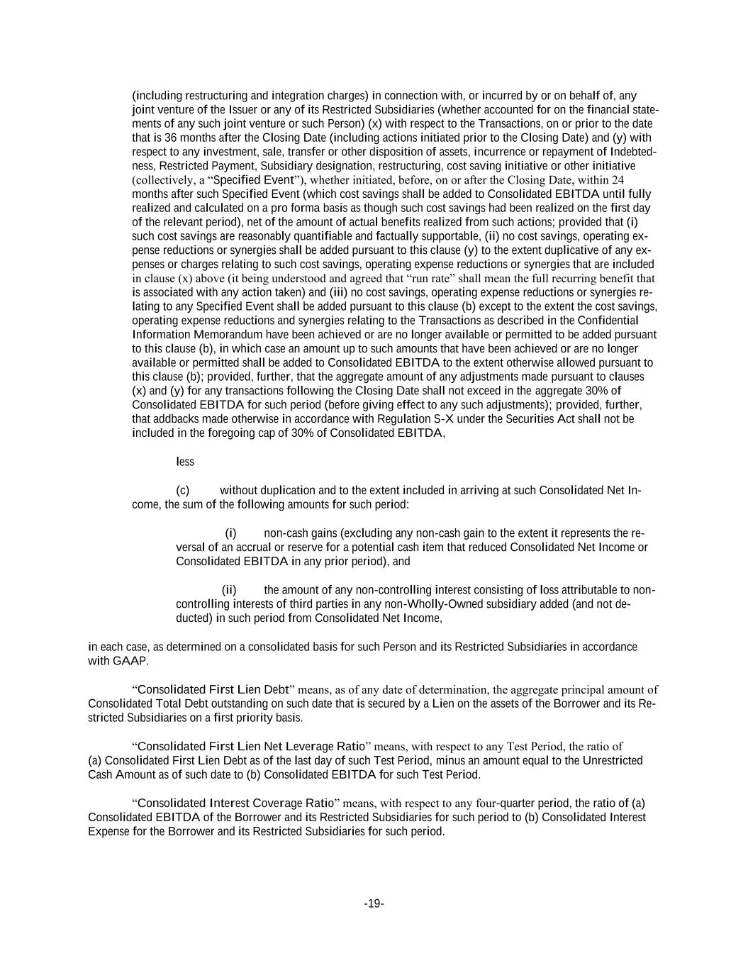 -19- (including restructuring and integration charges) in connection with, or incurred by or on behalf of, any joint venture of the Issuer or any of its Restricted Subsidiaries (whether accounted for on the financial state- ments of any such joint venture or such Person) (x) with respect to the Transactions, on or prior to the date that is 36 months after the Closing Date (including actions initiated prior to the Closing Date) and (y) with respect to any investment, sale, transfer or other disposition of assets, incurrence or repayment of Indebted- ness, Restricted Payment, Subsidiary designation, restructuring, cost saving initiative or other initiative (collectively, a “Specified Event”), whether initiated, before, on or after the Closing Date, within 24 months after such Specified Event (which cost savings shall be added to Consolidated EBITDA until fully realized and calculated on a pro forma basis as though such cost savings had been realized on the first day of the relevant period), net of the amount of actual benefits realized from such actions; provided that (i) such cost savings are reasonably quantifiable and factually supportable, (ii) no cost savings, operating ex- pense reductions or synergies shall be added pursuant to this clause (y) to the extent duplicative of any ex- penses or charges relating to such cost savings, operating expense reductions or synergies that are included in clause (x) above (it being understood and agreed that “run rate” shall mean the full recurring benefit that is associated with any action taken) and (iii) no cost savings, operating expense reductions or synergies re- lating to any Specified Event shall be added pursuant to this clause (b) except to the extent the cost savings, operating expense reductions and synergies relating to the Transactions as described in the Confidential Information Memorandum have been achieved or are no longer available or permitted to be added pursuant to this clause (b), in which case an amount up to such amounts that have been achieved or are no longer available or permitted shall be added to Consolidated EBITDA to the extent otherwise allowed pursuant to this clause (b); provided, further, that the aggregate amount of any adjustments made pursuant to clauses (x) and (y) for any transactions following the Closing Date shall not exceed in the aggregate 30% of Consolidated EBITDA for such period (before giving effect to any such adjustments); provided, further, that addbacks made otherwise in accordance with Regulation S-X under the Securities Act shall not be included in the foregoing cap of 30% of Consolidated EBITDA, less (c) without duplication and to the extent included in arriving at such Consolidated Net In- come, the sum of the following amounts for such period: (i) non-cash gains (excluding any non-cash gain to the extent it represents the re- versal of an accrual or reserve for a potential cash item that reduced Consolidated Net Income or Consolidated EBITDA in any prior period), and (ii) the amount of any non-controlling interest consisting of loss attributable to non- controlling interests of third parties in any non-Wholly-Owned subsidiary added (and not de- ducted) in such period from Consolidated Net Income, in each case, as determined on a consolidated basis for such Person and its Restricted Subsidiaries in accordance with GAAP. “Consolidated First Lien Debt” means, as of any date of determination, the aggregate principal amount of Consolidated Total Debt outstanding on such date that is secured by a Lien on the assets of the Borrower and its Re- stricted Subsidiaries on a first priority basis. “Consolidated First Lien Net Leverage Ratio” means, with respect to any Test Period, the ratio of (a) Consolidated First Lien Debt as of the last day of such Test Period, minus an amount equal to the Unrestricted Cash Amount as of such date to (b) Consolidated EBITDA for such Test Period. “Consolidated Interest Coverage Ratio” means, with respect to any four-quarter period, the ratio of (a) Consolidated EBITDA of the Borrower and its Restricted Subsidiaries for such period to (b) Consolidated Interest Expense for the Borrower and its Restricted Subsidiaries for such period.
