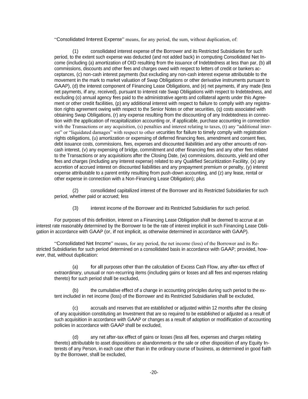 -20- “Consolidated Interest Expense” means, for any period, the sum, without duplication, of: (1) consolidated interest expense of the Borrower and its Restricted Subsidiaries for such period, to the extent such expense was deducted (and not added back) in computing Consolidated Net In- come (including (a) amortization of OID resulting from the issuance of Indebtedness at less than par, (b) all commissions, discounts and other fees and charges owed with respect to letters of credit or bankers ac- ceptances, (c) non-cash interest payments (but excluding any non-cash interest expense attributable to the movement in the mark to market valuation of Swap Obligations or other derivative instruments pursuant to GAAP), (d) the interest component of Financing Lease Obligations, and (e) net payments, if any made (less net payments, if any, received), pursuant to interest rate Swap Obligations with respect to Indebtedness, and excluding (o) annual agency fees paid to the administrative agents and collateral agents under this Agree- ment or other credit facilities, (p) any additional interest with respect to failure to comply with any registra- tion rights agreement owing with respect to the Senior Notes or other securities, (q) costs associated with obtaining Swap Obligations, (r) any expense resulting from the discounting of any Indebtedness in connec- tion with the application of recapitalization accounting or, if applicable, purchase accounting in connection with the Transactions or any acquisition, (s) penalties and interest relating to taxes, (t) any “additional inter- est” or “liquidated damages” with respect to other securities for failure to timely comply with registration rights obligations, (u) amortization or expensing of deferred financing fees, amendment and consent fees, debt issuance costs, commissions, fees, expenses and discounted liabilities and any other amounts of non- cash interest, (v) any expensing of bridge, commitment and other financing fees and any other fees related to the Transactions or any acquisitions after the Closing Date, (w) commissions, discounts, yield and other fees and charges (including any interest expense) related to any Qualified Securitization Facility, (x) any accretion of accrued interest on discounted liabilities and any prepayment premium or penalty, (y) interest expense attributable to a parent entity resulting from push-down accounting, and (z) any lease, rental or other expense in connection with a Non-Financing Lease Obligation); plus (2) consolidated capitalized interest of the Borrower and its Restricted Subsidiaries for such period, whether paid or accrued; less (3) interest income of the Borrower and its Restricted Subsidiaries for such period. For purposes of this definition, interest on a Financing Lease Obligation shall be deemed to accrue at an interest rate reasonably determined by the Borrower to be the rate of interest implicit in such Financing Lease Obli- gation in accordance with GAAP (or, if not implicit, as otherwise determined in accordance with GAAP). “Consolidated Net Income” means, for any period, the net income (loss) of the Borrower and its Re- stricted Subsidiaries for such period determined on a consolidated basis in accordance with GAAP; provided, how- ever, that, without duplication: (a) for all purposes other than the calculation of Excess Cash Flow, any after-tax effect of extraordinary, unusual or non-recurring items (including gains or losses and all fees and expenses relating thereto) for such period shall be excluded, (b) the cumulative effect of a change in accounting principles during such period to the ex- tent included in net income (loss) of the Borrower and its Restricted Subsidiaries shall be excluded, (c) accruals and reserves that are established or adjusted within 12 months after the closing of any acquisition constituting an Investment that are so required to be established or adjusted as a result of such acquisition in accordance with GAAP or changes as a result of adoption or modification of accounting policies in accordance with GAAP shall be excluded, (d) any net after-tax effect of gains or losses (less all fees, expenses and charges relating thereto) attributable to asset dispositions or abandonments or the sale or other disposition of any Equity In- terests of any Person, in each case other than in the ordinary course of business, as determined in good faith by the Borrower, shall be excluded,