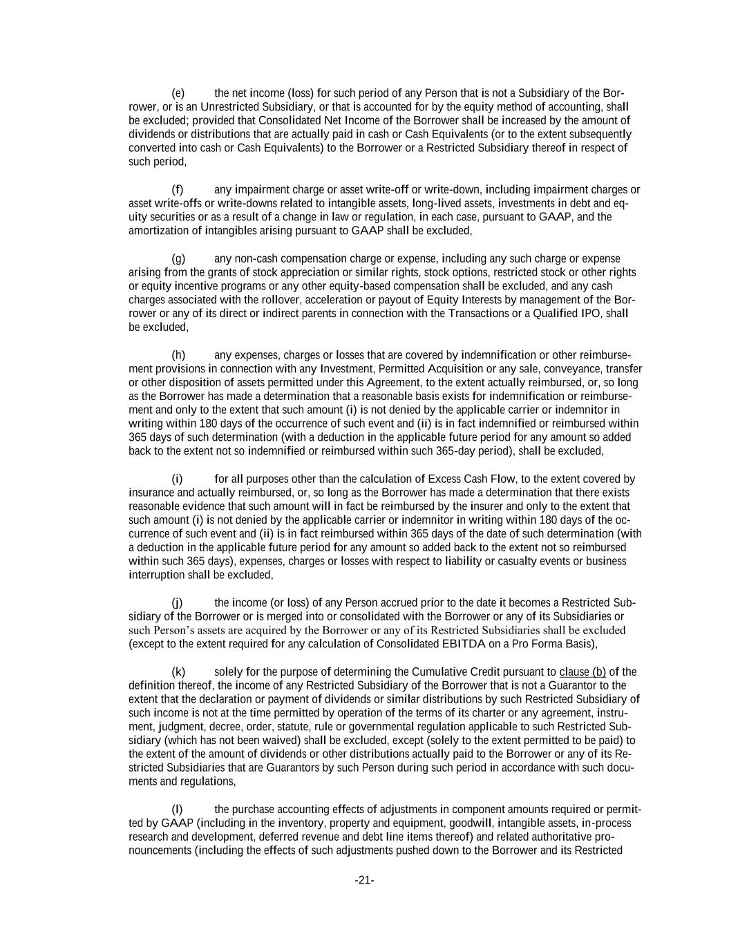 -21- (e) the net income (loss) for such period of any Person that is not a Subsidiary of the Bor- rower, or is an Unrestricted Subsidiary, or that is accounted for by the equity method of accounting, shall be excluded; provided that Consolidated Net Income of the Borrower shall be increased by the amount of dividends or distributions that are actually paid in cash or Cash Equivalents (or to the extent subsequently converted into cash or Cash Equivalents) to the Borrower or a Restricted Subsidiary thereof in respect of such period, (f) any impairment charge or asset write-off or write-down, including impairment charges or asset write-offs or write-downs related to intangible assets, long-lived assets, investments in debt and eq- uity securities or as a result of a change in law or regulation, in each case, pursuant to GAAP, and the amortization of intangibles arising pursuant to GAAP shall be excluded, (g) any non-cash compensation charge or expense, including any such charge or expense arising from the grants of stock appreciation or similar rights, stock options, restricted stock or other rights or equity incentive programs or any other equity-based compensation shall be excluded, and any cash charges associated with the rollover, acceleration or payout of Equity Interests by management of the Bor- rower or any of its direct or indirect parents in connection with the Transactions or a Qualified IPO, shall be excluded, (h) any expenses, charges or losses that are covered by indemnification or other reimburse- ment provisions in connection with any Investment, Permitted Acquisition or any sale, conveyance, transfer or other disposition of assets permitted under this Agreement, to the extent actually reimbursed, or, so long as the Borrower has made a determination that a reasonable basis exists for indemnification or reimburse- ment and only to the extent that such amount (i) is not denied by the applicable carrier or indemnitor in writing within 180 days of the occurrence of such event and (ii) is in fact indemnified or reimbursed within 365 days of such determination (with a deduction in the applicable future period for any amount so added back to the extent not so indemnified or reimbursed within such 365-day period), shall be excluded, (i) for all purposes other than the calculation of Excess Cash Flow, to the extent covered by insurance and actually reimbursed, or, so long as the Borrower has made a determination that there exists reasonable evidence that such amount will in fact be reimbursed by the insurer and only to the extent that such amount (i) is not denied by the applicable carrier or indemnitor in writing within 180 days of the oc- currence of such event and (ii) is in fact reimbursed within 365 days of the date of such determination (with a deduction in the applicable future period for any amount so added back to the extent not so reimbursed within such 365 days), expenses, charges or losses with respect to liability or casualty events or business interruption shall be excluded, (j) the income (or loss) of any Person accrued prior to the date it becomes a Restricted Sub- sidiary of the Borrower or is merged into or consolidated with the Borrower or any of its Subsidiaries or such Person’s assets are acquired by the Borrower or any of its Restricted Subsidiaries shall be excluded (except to the extent required for any calculation of Consolidated EBITDA on a Pro Forma Basis), (k) solely for the purpose of determining the Cumulative Credit pursuant to clause (b) of the definition thereof, the income of any Restricted Subsidiary of the Borrower that is not a Guarantor to the extent that the declaration or payment of dividends or similar distributions by such Restricted Subsidiary of such income is not at the time permitted by operation of the terms of its charter or any agreement, instru- ment, judgment, decree, order, statute, rule or governmental regulation applicable to such Restricted Sub- sidiary (which has not been waived) shall be excluded, except (solely to the extent permitted to be paid) to the extent of the amount of dividends or other distributions actually paid to the Borrower or any of its Re- stricted Subsidiaries that are Guarantors by such Person during such period in accordance with such docu- ments and regulations, (l) the purchase accounting effects of adjustments in component amounts required or permit- ted by GAAP (including in the inventory, property and equipment, goodwill, intangible assets, in-process research and development, deferred revenue and debt line items thereof) and related authoritative pro- nouncements (including the effects of such adjustments pushed down to the Borrower and its Restricted