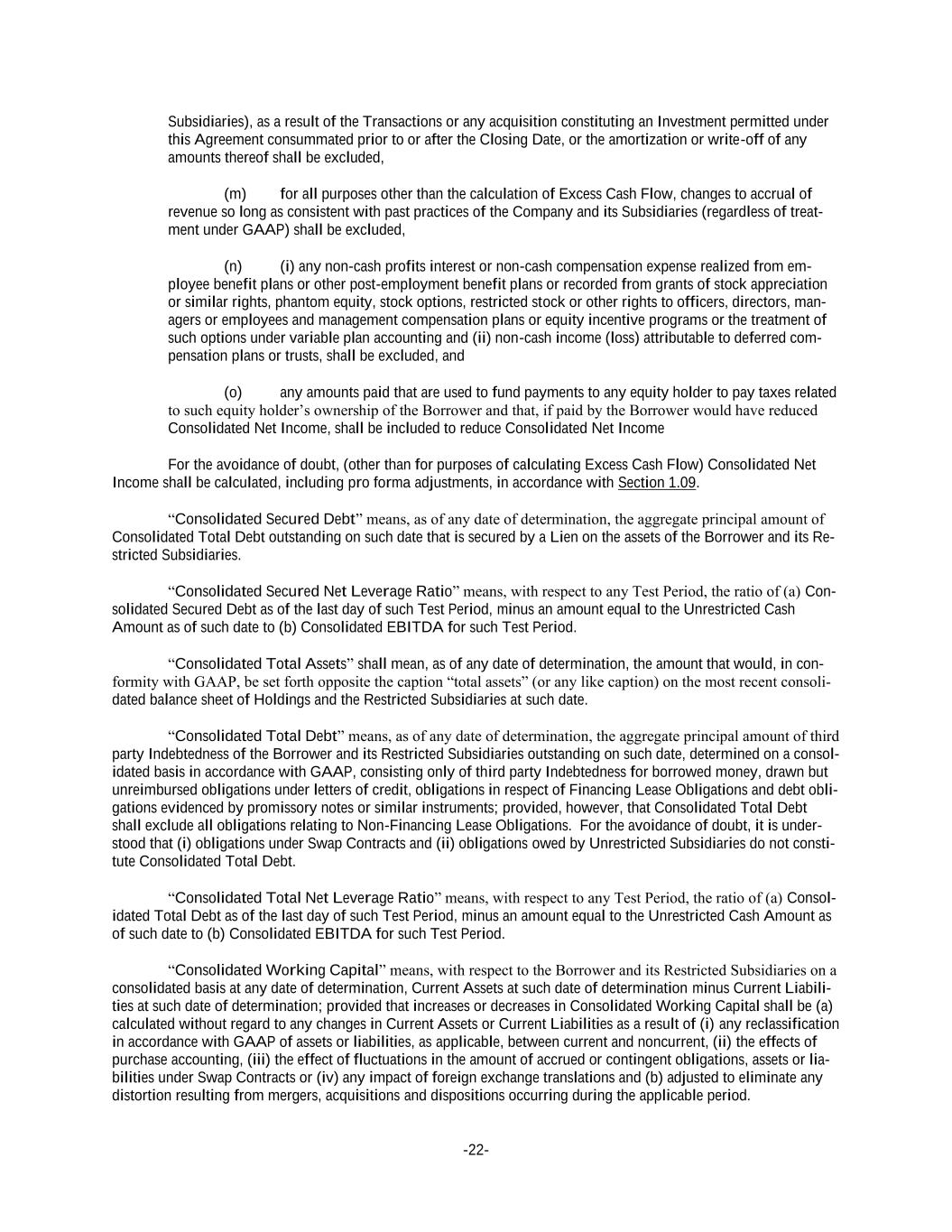 -22- Subsidiaries), as a result of the Transactions or any acquisition constituting an Investment permitted under this Agreement consummated prior to or after the Closing Date, or the amortization or write-off of any amounts thereof shall be excluded, (m) for all purposes other than the calculation of Excess Cash Flow, changes to accrual of revenue so long as consistent with past practices of the Company and its Subsidiaries (regardless of treat- ment under GAAP) shall be excluded, (n) (i) any non-cash profits interest or non-cash compensation expense realized from em- ployee benefit plans or other post-employment benefit plans or recorded from grants of stock appreciation or similar rights, phantom equity, stock options, restricted stock or other rights to officers, directors, man- agers or employees and management compensation plans or equity incentive programs or the treatment of such options under variable plan accounting and (ii) non-cash income (loss) attributable to deferred com- pensation plans or trusts, shall be excluded, and (o) any amounts paid that are used to fund payments to any equity holder to pay taxes related to such equity holder’s ownership of the Borrower and that, if paid by the Borrower would have reduced Consolidated Net Income, shall be included to reduce Consolidated Net Income For the avoidance of doubt, (other than for purposes of calculating Excess Cash Flow) Consolidated Net Income shall be calculated, including pro forma adjustments, in accordance with Section 1.09. “Consolidated Secured Debt” means, as of any date of determination, the aggregate principal amount of Consolidated Total Debt outstanding on such date that is secured by a Lien on the assets of the Borrower and its Re- stricted Subsidiaries. “Consolidated Secured Net Leverage Ratio” means, with respect to any Test Period, the ratio of (a) Con- solidated Secured Debt as of the last day of such Test Period, minus an amount equal to the Unrestricted Cash Amount as of such date to (b) Consolidated EBITDA for such Test Period. “Consolidated Total Assets” shall mean, as of any date of determination, the amount that would, in con- formity with GAAP, be set forth opposite the caption “total assets” (or any like caption) on the most recent consoli- dated balance sheet of Holdings and the Restricted Subsidiaries at such date. “Consolidated Total Debt” means, as of any date of determination, the aggregate principal amount of third party Indebtedness of the Borrower and its Restricted Subsidiaries outstanding on such date, determined on a consol- idated basis in accordance with GAAP, consisting only of third party Indebtedness for borrowed money, drawn but unreimbursed obligations under letters of credit, obligations in respect of Financing Lease Obligations and debt obli- gations evidenced by promissory notes or similar instruments; provided, however, that Consolidated Total Debt shall exclude all obligations relating to Non-Financing Lease Obligations. For the avoidance of doubt, it is under- stood that (i) obligations under Swap Contracts and (ii) obligations owed by Unrestricted Subsidiaries do not consti- tute Consolidated Total Debt. “Consolidated Total Net Leverage Ratio” means, with respect to any Test Period, the ratio of (a) Consol- idated Total Debt as of the last day of such Test Period, minus an amount equal to the Unrestricted Cash Amount as of such date to (b) Consolidated EBITDA for such Test Period. “Consolidated Working Capital” means, with respect to the Borrower and its Restricted Subsidiaries on a consolidated basis at any date of determination, Current Assets at such date of determination minus Current Liabili- ties at such date of determination; provided that increases or decreases in Consolidated Working Capital shall be (a) calculated without regard to any changes in Current Assets or Current Liabilities as a result of (i) any reclassification in accordance with GAAP of assets or liabilities, as applicable, between current and noncurrent, (ii) the effects of purchase accounting, (iii) the effect of fluctuations in the amount of accrued or contingent obligations, assets or lia- bilities under Swap Contracts or (iv) any impact of foreign exchange translations and (b) adjusted to eliminate any distortion resulting from mergers, acquisitions and dispositions occurring during the applicable period.
