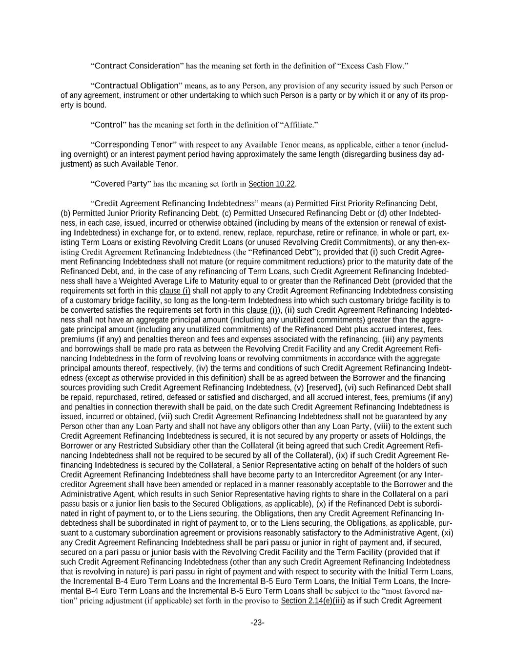 -23- “Contract Consideration” has the meaning set forth in the definition of “Excess Cash Flow.” “Contractual Obligation” means, as to any Person, any provision of any security issued by such Person or of any agreement, instrument or other undertaking to which such Person is a party or by which it or any of its prop- erty is bound. “Control” has the meaning set forth in the definition of “Affiliate.” “Corresponding Tenor” with respect to any Available Tenor means, as applicable, either a tenor (includ- ing overnight) or an interest payment period having approximately the same length (disregarding business day ad- justment) as such Available Tenor. “Covered Party” has the meaning set forth in Section 10.22. “Credit Agreement Refinancing Indebtedness” means (a) Permitted First Priority Refinancing Debt, (b) Permitted Junior Priority Refinancing Debt, (c) Permitted Unsecured Refinancing Debt or (d) other Indebted- ness, in each case, issued, incurred or otherwise obtained (including by means of the extension or renewal of exist- ing Indebtedness) in exchange for, or to extend, renew, replace, repurchase, retire or refinance, in whole or part, ex- isting Term Loans or existing Revolving Credit Loans (or unused Revolving Credit Commitments), or any then-ex- isting Credit Agreement Refinancing Indebtedness (the “Refinanced Debt”); provided that (i) such Credit Agree- ment Refinancing Indebtedness shall not mature (or require commitment reductions) prior to the maturity date of the Refinanced Debt, and, in the case of any refinancing of Term Loans, such Credit Agreement Refinancing Indebted- ness shall have a Weighted Average Life to Maturity equal to or greater than the Refinanced Debt (provided that the requirements set forth in this clause (i) shall not apply to any Credit Agreement Refinancing Indebtedness consisting of a customary bridge facility, so long as the long-term Indebtedness into which such customary bridge facility is to be converted satisfies the requirements set forth in this clause (i)), (ii) such Credit Agreement Refinancing Indebted- ness shall not have an aggregate principal amount (including any unutilized commitments) greater than the aggre- gate principal amount (including any unutilized commitments) of the Refinanced Debt plus accrued interest, fees, premiums (if any) and penalties thereon and fees and expenses associated with the refinancing, (iii) any payments and borrowings shall be made pro rata as between the Revolving Credit Facility and any Credit Agreement Refi- nancing Indebtedness in the form of revolving loans or revolving commitments in accordance with the aggregate principal amounts thereof, respectively, (iv) the terms and conditions of such Credit Agreement Refinancing Indebt- edness (except as otherwise provided in this definition) shall be as agreed between the Borrower and the financing sources providing such Credit Agreement Refinancing Indebtedness, (v) [reserved], (vi) such Refinanced Debt shall be repaid, repurchased, retired, defeased or satisfied and discharged, and all accrued interest, fees, premiums (if any) and penalties in connection therewith shall be paid, on the date such Credit Agreement Refinancing Indebtedness is issued, incurred or obtained, (vii) such Credit Agreement Refinancing Indebtedness shall not be guaranteed by any Person other than any Loan Party and shall not have any obligors other than any Loan Party, (viii) to the extent such Credit Agreement Refinancing Indebtedness is secured, it is not secured by any property or assets of Holdings, the Borrower or any Restricted Subsidiary other than the Collateral (it being agreed that such Credit Agreement Refi- nancing Indebtedness shall not be required to be secured by all of the Collateral), (ix) if such Credit Agreement Re- financing Indebtedness is secured by the Collateral, a Senior Representative acting on behalf of the holders of such Credit Agreement Refinancing Indebtedness shall have become party to an Intercreditor Agreement (or any Inter- creditor Agreement shall have been amended or replaced in a manner reasonably acceptable to the Borrower and the Administrative Agent, which results in such Senior Representative having rights to share in the Collateral on a pari passu basis or a junior lien basis to the Secured Obligations, as applicable), (x) if the Refinanced Debt is subordi- nated in right of payment to, or to the Liens securing, the Obligations, then any Credit Agreement Refinancing In- debtedness shall be subordinated in right of payment to, or to the Liens securing, the Obligations, as applicable, pur- suant to a customary subordination agreement or provisions reasonably satisfactory to the Administrative Agent, (xi) any Credit Agreement Refinancing Indebtedness shall be pari passu or junior in right of payment and, if secured, secured on a pari passu or junior basis with the Revolving Credit Facility and the Term Facility (provided that if such Credit Agreement Refinancing Indebtedness (other than any such Credit Agreement Refinancing Indebtedness that is revolving in nature) is pari passu in right of payment and with respect to security with the Initial Term Loans, the Incremental B-4 Euro Term Loans and the Incremental B-5 Euro Term Loans, the Initial Term Loans, the Incre- mental B-4 Euro Term Loans and the Incremental B-5 Euro Term Loans shall be subject to the “most favored na- tion” pricing adjustment (if applicable) set forth in the proviso to Section 2.14(e)(iii) as if such Credit Agreement