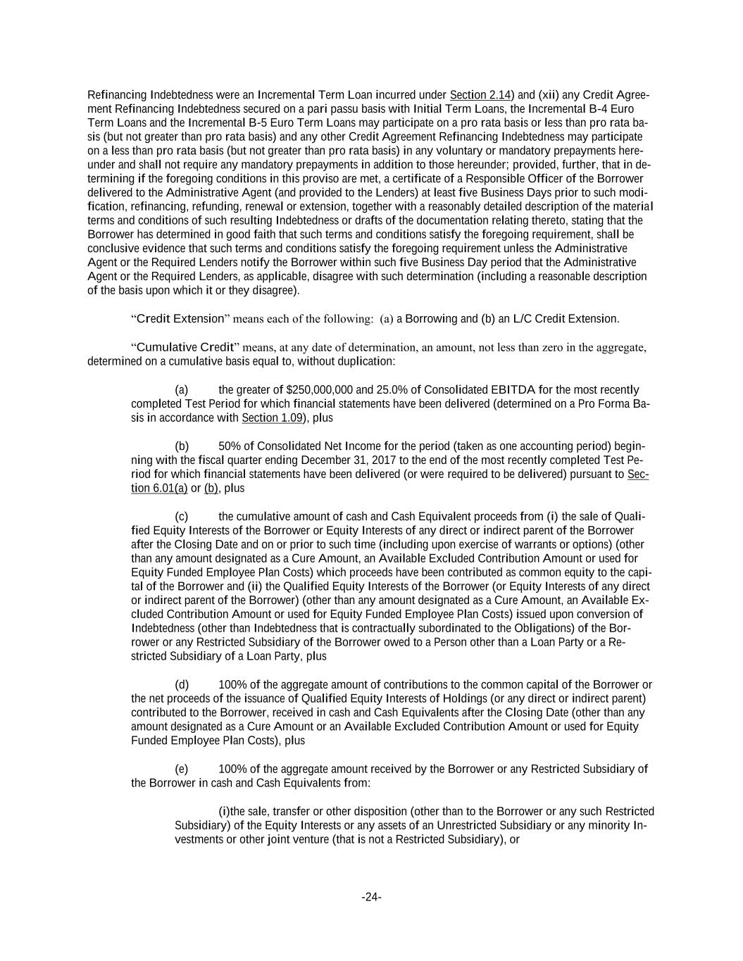 -24- Refinancing Indebtedness were an Incremental Term Loan incurred under Section 2.14) and (xii) any Credit Agree- ment Refinancing Indebtedness secured on a pari passu basis with Initial Term Loans, the Incremental B-4 Euro Term Loans and the Incremental B-5 Euro Term Loans may participate on a pro rata basis or less than pro rata ba- sis (but not greater than pro rata basis) and any other Credit Agreement Refinancing Indebtedness may participate on a less than pro rata basis (but not greater than pro rata basis) in any voluntary or mandatory prepayments here- under and shall not require any mandatory prepayments in addition to those hereunder; provided, further, that in de- termining if the foregoing conditions in this proviso are met, a certificate of a Responsible Officer of the Borrower delivered to the Administrative Agent (and provided to the Lenders) at least five Business Days prior to such modi- fication, refinancing, refunding, renewal or extension, together with a reasonably detailed description of the material terms and conditions of such resulting Indebtedness or drafts of the documentation relating thereto, stating that the Borrower has determined in good faith that such terms and conditions satisfy the foregoing requirement, shall be conclusive evidence that such terms and conditions satisfy the foregoing requirement unless the Administrative Agent or the Required Lenders notify the Borrower within such five Business Day period that the Administrative Agent or the Required Lenders, as applicable, disagree with such determination (including a reasonable description of the basis upon which it or they disagree). “Credit Extension” means each of the following: (a) a Borrowing and (b) an L/C Credit Extension. “Cumulative Credit” means, at any date of determination, an amount, not less than zero in the aggregate, determined on a cumulative basis equal to, without duplication: (a) the greater of $250,000,000 and 25.0% of Consolidated EBITDA for the most recently completed Test Period for which financial statements have been delivered (determined on a Pro Forma Ba- sis in accordance with Section 1.09), plus (b) 50% of Consolidated Net Income for the period (taken as one accounting period) begin- ning with the fiscal quarter ending December 31, 2017 to the end of the most recently completed Test Pe- riod for which financial statements have been delivered (or were required to be delivered) pursuant to Sec- tion 6.01(a) or (b), plus (c) the cumulative amount of cash and Cash Equivalent proceeds from (i) the sale of Quali- fied Equity Interests of the Borrower or Equity Interests of any direct or indirect parent of the Borrower after the Closing Date and on or prior to such time (including upon exercise of warrants or options) (other than any amount designated as a Cure Amount, an Available Excluded Contribution Amount or used for Equity Funded Employee Plan Costs) which proceeds have been contributed as common equity to the capi- tal of the Borrower and (ii) the Qualified Equity Interests of the Borrower (or Equity Interests of any direct or indirect parent of the Borrower) (other than any amount designated as a Cure Amount, an Available Ex- cluded Contribution Amount or used for Equity Funded Employee Plan Costs) issued upon conversion of Indebtedness (other than Indebtedness that is contractually subordinated to the Obligations) of the Bor- rower or any Restricted Subsidiary of the Borrower owed to a Person other than a Loan Party or a Re- stricted Subsidiary of a Loan Party, plus (d) 100% of the aggregate amount of contributions to the common capital of the Borrower or the net proceeds of the issuance of Qualified Equity Interests of Holdings (or any direct or indirect parent) contributed to the Borrower, received in cash and Cash Equivalents after the Closing Date (other than any amount designated as a Cure Amount or an Available Excluded Contribution Amount or used for Equity Funded Employee Plan Costs), plus (e) 100% of the aggregate amount received by the Borrower or any Restricted Subsidiary of the Borrower in cash and Cash Equivalents from: (i)the sale, transfer or other disposition (other than to the Borrower or any such Restricted Subsidiary) of the Equity Interests or any assets of an Unrestricted Subsidiary or any minority In- vestments or other joint venture (that is not a Restricted Subsidiary), or