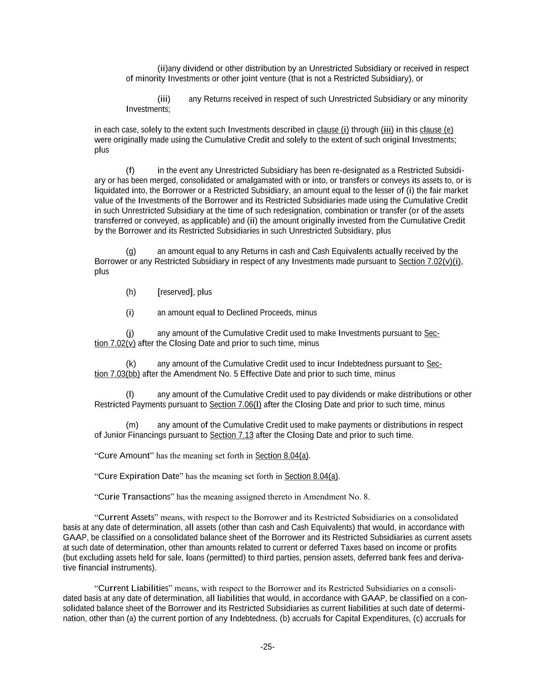 -25- (ii)any dividend or other distribution by an Unrestricted Subsidiary or received in respect of minority Investments or other joint venture (that is not a Restricted Subsidiary), or (iii) any Returns received in respect of such Unrestricted Subsidiary or any minority Investments; in each case, solely to the extent such Investments described in clause (i) through (iii) in this clause (e) were originally made using the Cumulative Credit and solely to the extent of such original Investments; plus (f) in the event any Unrestricted Subsidiary has been re-designated as a Restricted Subsidi- ary or has been merged, consolidated or amalgamated with or into, or transfers or conveys its assets to, or is liquidated into, the Borrower or a Restricted Subsidiary, an amount equal to the lesser of (i) the fair market value of the Investments of the Borrower and its Restricted Subsidiaries made using the Cumulative Credit in such Unrestricted Subsidiary at the time of such redesignation, combination or transfer (or of the assets transferred or conveyed, as applicable) and (ii) the amount originally invested from the Cumulative Credit by the Borrower and its Restricted Subsidiaries in such Unrestricted Subsidiary, plus (g) an amount equal to any Returns in cash and Cash Equivalents actually received by the Borrower or any Restricted Subsidiary in respect of any Investments made pursuant to Section 7.02(v)(i), plus (h) [reserved], plus (i) an amount equal to Declined Proceeds, minus (j) any amount of the Cumulative Credit used to make Investments pursuant to Sec- tion 7.02(v) after the Closing Date and prior to such time, minus (k) any amount of the Cumulative Credit used to incur Indebtedness pursuant to Sec- tion 7.03(bb) after the Amendment No. 5 Effective Date and prior to such time, minus (l) any amount of the Cumulative Credit used to pay dividends or make distributions or other Restricted Payments pursuant to Section 7.06(l) after the Closing Date and prior to such time, minus (m) any amount of the Cumulative Credit used to make payments or distributions in respect of Junior Financings pursuant to Section 7.13 after the Closing Date and prior to such time. “Cure Amount” has the meaning set forth in Section 8.04(a). “Cure Expiration Date” has the meaning set forth in Section 8.04(a). “Curie Transactions” has the meaning assigned thereto in Amendment No. 8. “Current Assets” means, with respect to the Borrower and its Restricted Subsidiaries on a consolidated basis at any date of determination, all assets (other than cash and Cash Equivalents) that would, in accordance with GAAP, be classified on a consolidated balance sheet of the Borrower and its Restricted Subsidiaries as current assets at such date of determination, other than amounts related to current or deferred Taxes based on income or profits (but excluding assets held for sale, loans (permitted) to third parties, pension assets, deferred bank fees and deriva- tive financial instruments). “Current Liabilities” means, with respect to the Borrower and its Restricted Subsidiaries on a consoli- dated basis at any date of determination, all liabilities that would, in accordance with GAAP, be classified on a con- solidated balance sheet of the Borrower and its Restricted Subsidiaries as current liabilities at such date of determi- nation, other than (a) the current portion of any Indebtedness, (b) accruals for Capital Expenditures, (c) accruals for