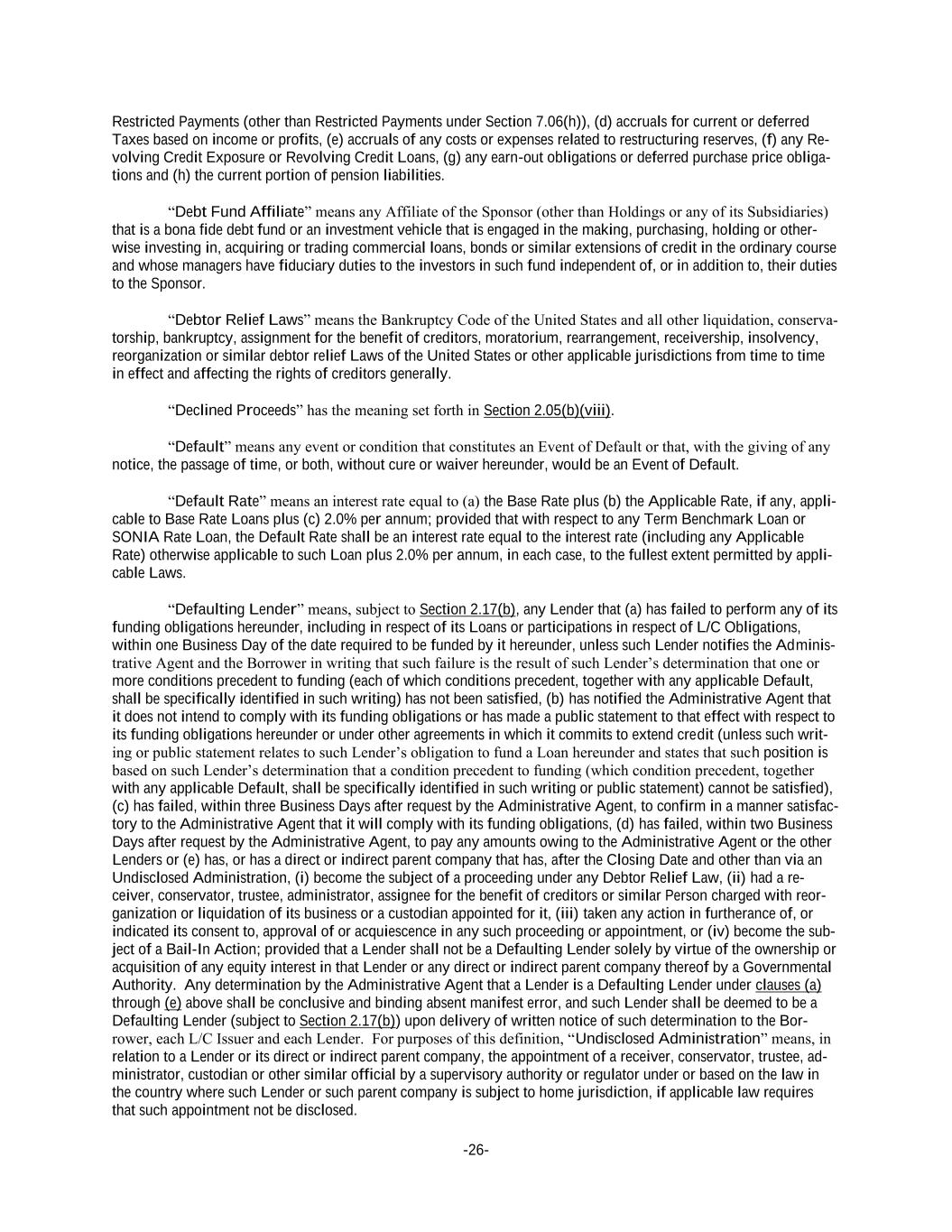-26- Restricted Payments (other than Restricted Payments under Section 7.06(h)), (d) accruals for current or deferred Taxes based on income or profits, (e) accruals of any costs or expenses related to restructuring reserves, (f) any Re- volving Credit Exposure or Revolving Credit Loans, (g) any earn-out obligations or deferred purchase price obliga- tions and (h) the current portion of pension liabilities. “Debt Fund Affiliate” means any Affiliate of the Sponsor (other than Holdings or any of its Subsidiaries) that is a bona fide debt fund or an investment vehicle that is engaged in the making, purchasing, holding or other- wise investing in, acquiring or trading commercial loans, bonds or similar extensions of credit in the ordinary course and whose managers have fiduciary duties to the investors in such fund independent of, or in addition to, their duties to the Sponsor. “Debtor Relief Laws” means the Bankruptcy Code of the United States and all other liquidation, conserva- torship, bankruptcy, assignment for the benefit of creditors, moratorium, rearrangement, receivership, insolvency, reorganization or similar debtor relief Laws of the United States or other applicable jurisdictions from time to time in effect and affecting the rights of creditors generally. “Declined Proceeds” has the meaning set forth in Section 2.05(b)(viii). “Default” means any event or condition that constitutes an Event of Default or that, with the giving of any notice, the passage of time, or both, without cure or waiver hereunder, would be an Event of Default. “Default Rate” means an interest rate equal to (a) the Base Rate plus (b) the Applicable Rate, if any, appli- cable to Base Rate Loans plus (c) 2.0% per annum; provided that with respect to any Term Benchmark Loan or SONIA Rate Loan, the Default Rate shall be an interest rate equal to the interest rate (including any Applicable Rate) otherwise applicable to such Loan plus 2.0% per annum, in each case, to the fullest extent permitted by appli- cable Laws. “Defaulting Lender” means, subject to Section 2.17(b), any Lender that (a) has failed to perform any of its funding obligations hereunder, including in respect of its Loans or participations in respect of L/C Obligations, within one Business Day of the date required to be funded by it hereunder, unless such Lender notifies the Adminis- trative Agent and the Borrower in writing that such failure is the result of such Lender’s determination that one or more conditions precedent to funding (each of which conditions precedent, together with any applicable Default, shall be specifically identified in such writing) has not been satisfied, (b) has notified the Administrative Agent that it does not intend to comply with its funding obligations or has made a public statement to that effect with respect to its funding obligations hereunder or under other agreements in which it commits to extend credit (unless such writ- ing or public statement relates to such Lender’s obligation to fund a Loan hereunder and states that such position is based on such Lender’s determination that a condition precedent to funding (which condition precedent, together with any applicable Default, shall be specifically identified in such writing or public statement) cannot be satisfied), (c) has failed, within three Business Days after request by the Administrative Agent, to confirm in a manner satisfac- tory to the Administrative Agent that it will comply with its funding obligations, (d) has failed, within two Business Days after request by the Administrative Agent, to pay any amounts owing to the Administrative Agent or the other Lenders or (e) has, or has a direct or indirect parent company that has, after the Closing Date and other than via an Undisclosed Administration, (i) become the subject of a proceeding under any Debtor Relief Law, (ii) had a re- ceiver, conservator, trustee, administrator, assignee for the benefit of creditors or similar Person charged with reor- ganization or liquidation of its business or a custodian appointed for it, (iii) taken any action in furtherance of, or indicated its consent to, approval of or acquiescence in any such proceeding or appointment, or (iv) become the sub- ject of a Bail-In Action; provided that a Lender shall not be a Defaulting Lender solely by virtue of the ownership or acquisition of any equity interest in that Lender or any direct or indirect parent company thereof by a Governmental Authority. Any determination by the Administrative Agent that a Lender is a Defaulting Lender under clauses (a) through (e) above shall be conclusive and binding absent manifest error, and such Lender shall be deemed to be a Defaulting Lender (subject to Section 2.17(b)) upon delivery of written notice of such determination to the Bor- rower, each L/C Issuer and each Lender. For purposes of this definition, “Undisclosed Administration” means, in relation to a Lender or its direct or indirect parent company, the appointment of a receiver, conservator, trustee, ad- ministrator, custodian or other similar official by a supervisory authority or regulator under or based on the law in the country where such Lender or such parent company is subject to home jurisdiction, if applicable law requires that such appointment not be disclosed.
