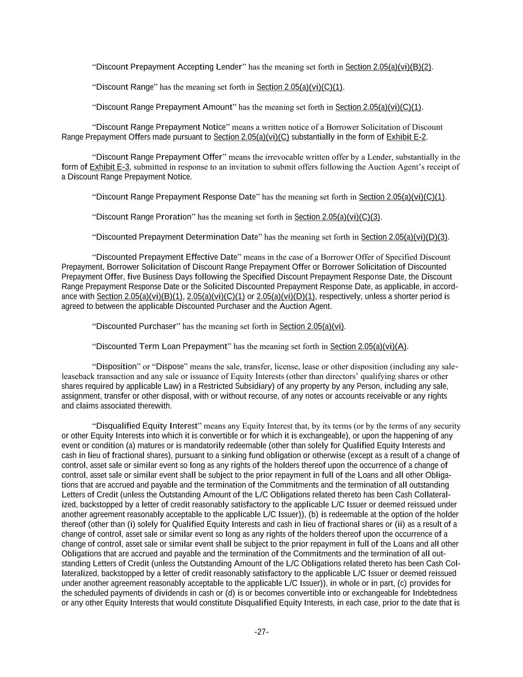 -27- “Discount Prepayment Accepting Lender” has the meaning set forth in Section 2.05(a)(vi)(B)(2). “Discount Range” has the meaning set forth in Section 2.05(a)(vi)(C)(1). “Discount Range Prepayment Amount” has the meaning set forth in Section 2.05(a)(vi)(C)(1). “Discount Range Prepayment Notice” means a written notice of a Borrower Solicitation of Discount Range Prepayment Offers made pursuant to Section 2.05(a)(vi)(C) substantially in the form of Exhibit E-2. “Discount Range Prepayment Offer” means the irrevocable written offer by a Lender, substantially in the form of Exhibit E-3, submitted in response to an invitation to submit offers following the Auction Agent’s receipt of a Discount Range Prepayment Notice. “Discount Range Prepayment Response Date” has the meaning set forth in Section 2.05(a)(vi)(C)(1). “Discount Range Proration” has the meaning set forth in Section 2.05(a)(vi)(C)(3). “Discounted Prepayment Determination Date” has the meaning set forth in Section 2.05(a)(vi)(D)(3). “Discounted Prepayment Effective Date” means in the case of a Borrower Offer of Specified Discount Prepayment, Borrower Solicitation of Discount Range Prepayment Offer or Borrower Solicitation of Discounted Prepayment Offer, five Business Days following the Specified Discount Prepayment Response Date, the Discount Range Prepayment Response Date or the Solicited Discounted Prepayment Response Date, as applicable, in accord- ance with Section 2.05(a)(vi)(B)(1), 2.05(a)(vi)(C)(1) or 2.05(a)(vi)(D)(1), respectively, unless a shorter period is agreed to between the applicable Discounted Purchaser and the Auction Agent. “Discounted Purchaser” has the meaning set forth in Section 2.05(a)(vi). “Discounted Term Loan Prepayment” has the meaning set forth in Section 2.05(a)(vi)(A). “Disposition” or “Dispose” means the sale, transfer, license, lease or other disposition (including any sale- leaseback transaction and any sale or issuance of Equity Interests (other than directors’ qualifying shares or other shares required by applicable Law) in a Restricted Subsidiary) of any property by any Person, including any sale, assignment, transfer or other disposal, with or without recourse, of any notes or accounts receivable or any rights and claims associated therewith. “Disqualified Equity Interest” means any Equity Interest that, by its terms (or by the terms of any security or other Equity Interests into which it is convertible or for which it is exchangeable), or upon the happening of any event or condition (a) matures or is mandatorily redeemable (other than solely for Qualified Equity Interests and cash in lieu of fractional shares), pursuant to a sinking fund obligation or otherwise (except as a result of a change of control, asset sale or similar event so long as any rights of the holders thereof upon the occurrence of a change of control, asset sale or similar event shall be subject to the prior repayment in full of the Loans and all other Obliga- tions that are accrued and payable and the termination of the Commitments and the termination of all outstanding Letters of Credit (unless the Outstanding Amount of the L/C Obligations related thereto has been Cash Collateral- ized, backstopped by a letter of credit reasonably satisfactory to the applicable L/C Issuer or deemed reissued under another agreement reasonably acceptable to the applicable L/C Issuer)), (b) is redeemable at the option of the holder thereof (other than (i) solely for Qualified Equity Interests and cash in lieu of fractional shares or (ii) as a result of a change of control, asset sale or similar event so long as any rights of the holders thereof upon the occurrence of a change of control, asset sale or similar event shall be subject to the prior repayment in full of the Loans and all other Obligations that are accrued and payable and the termination of the Commitments and the termination of all out- standing Letters of Credit (unless the Outstanding Amount of the L/C Obligations related thereto has been Cash Col- lateralized, backstopped by a letter of credit reasonably satisfactory to the applicable L/C Issuer or deemed reissued under another agreement reasonably acceptable to the applicable L/C Issuer)), in whole or in part, (c) provides for the scheduled payments of dividends in cash or (d) is or becomes convertible into or exchangeable for Indebtedness or any other Equity Interests that would constitute Disqualified Equity Interests, in each case, prior to the date that is