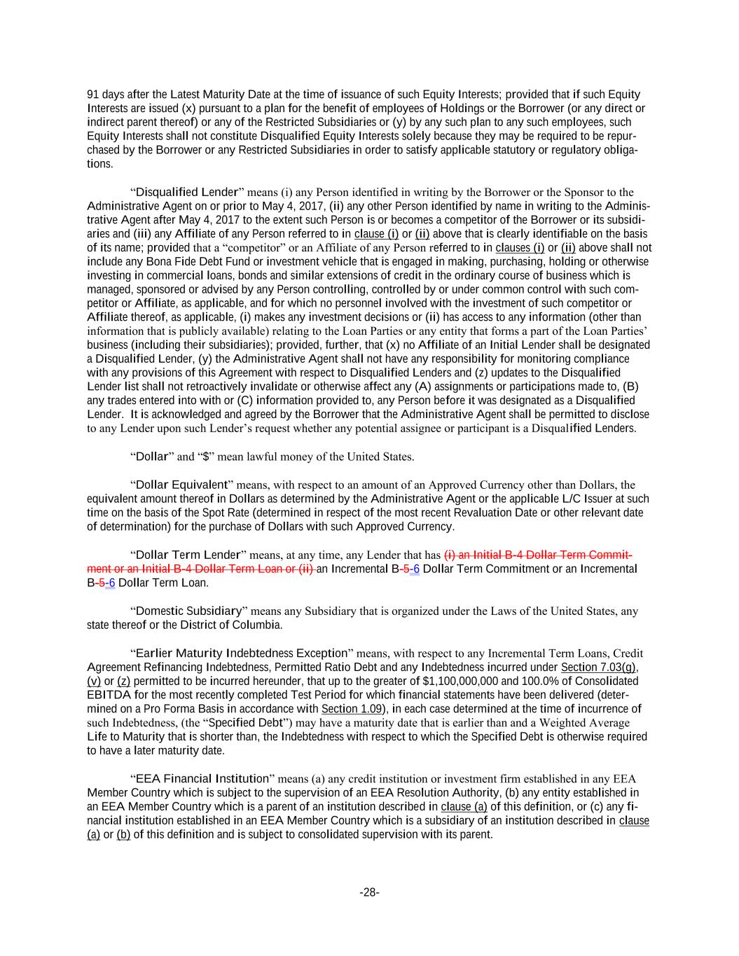 -28- 91 days after the Latest Maturity Date at the time of issuance of such Equity Interests; provided that if such Equity Interests are issued (x) pursuant to a plan for the benefit of employees of Holdings or the Borrower (or any direct or indirect parent thereof) or any of the Restricted Subsidiaries or (y) by any such plan to any such employees, such Equity Interests shall not constitute Disqualified Equity Interests solely because they may be required to be repur- chased by the Borrower or any Restricted Subsidiaries in order to satisfy applicable statutory or regulatory obliga- tions. “Disqualified Lender” means (i) any Person identified in writing by the Borrower or the Sponsor to the Administrative Agent on or prior to May 4, 2017, (ii) any other Person identified by name in writing to the Adminis- trative Agent after May 4, 2017 to the extent such Person is or becomes a competitor of the Borrower or its subsidi- aries and (iii) any Affiliate of any Person referred to in clause (i) or (ii) above that is clearly identifiable on the basis of its name; provided that a “competitor” or an Affiliate of any Person referred to in clauses (i) or (ii) above shall not include any Bona Fide Debt Fund or investment vehicle that is engaged in making, purchasing, holding or otherwise investing in commercial loans, bonds and similar extensions of credit in the ordinary course of business which is managed, sponsored or advised by any Person controlling, controlled by or under common control with such com- petitor or Affiliate, as applicable, and for which no personnel involved with the investment of such competitor or Affiliate thereof, as applicable, (i) makes any investment decisions or (ii) has access to any information (other than information that is publicly available) relating to the Loan Parties or any entity that forms a part of the Loan Parties’ business (including their subsidiaries); provided, further, that (x) no Affiliate of an Initial Lender shall be designated a Disqualified Lender, (y) the Administrative Agent shall not have any responsibility for monitoring compliance with any provisions of this Agreement with respect to Disqualified Lenders and (z) updates to the Disqualified Lender list shall not retroactively invalidate or otherwise affect any (A) assignments or participations made to, (B) any trades entered into with or (C) information provided to, any Person before it was designated as a Disqualified Lender. It is acknowledged and agreed by the Borrower that the Administrative Agent shall be permitted to disclose to any Lender upon such Lender’s request whether any potential assignee or participant is a Disqualified Lenders. “Dollar” and “$” mean lawful money of the United States. “Dollar Equivalent” means, with respect to an amount of an Approved Currency other than Dollars, the equivalent amount thereof in Dollars as determined by the Administrative Agent or the applicable L/C Issuer at such time on the basis of the Spot Rate (determined in respect of the most recent Revaluation Date or other relevant date of determination) for the purchase of Dollars with such Approved Currency. “Dollar Term Lender” means, at any time, any Lender that has (i) an Initial B-4 Dollar Term Commit- ment or an Initial B-4 Dollar Term Loan or (ii) an Incremental B-5-6 Dollar Term Commitment or an Incremental B-5-6 Dollar Term Loan. “Domestic Subsidiary” means any Subsidiary that is organized under the Laws of the United States, any state thereof or the District of Columbia. “Earlier Maturity Indebtedness Exception” means, with respect to any Incremental Term Loans, Credit Agreement Refinancing Indebtedness, Permitted Ratio Debt and any Indebtedness incurred under Section 7.03(g), (v) or (z) permitted to be incurred hereunder, that up to the greater of $1,100,000,000 and 100.0% of Consolidated EBITDA for the most recently completed Test Period for which financial statements have been delivered (deter- mined on a Pro Forma Basis in accordance with Section 1.09), in each case determined at the time of incurrence of such Indebtedness, (the “Specified Debt”) may have a maturity date that is earlier than and a Weighted Average Life to Maturity that is shorter than, the Indebtedness with respect to which the Specified Debt is otherwise required to have a later maturity date. “EEA Financial Institution” means (a) any credit institution or investment firm established in any EEA Member Country which is subject to the supervision of an EEA Resolution Authority, (b) any entity established in an EEA Member Country which is a parent of an institution described in clause (a) of this definition, or (c) any fi- nancial institution established in an EEA Member Country which is a subsidiary of an institution described in clause (a) or (b) of this definition and is subject to consolidated supervision with its parent.
