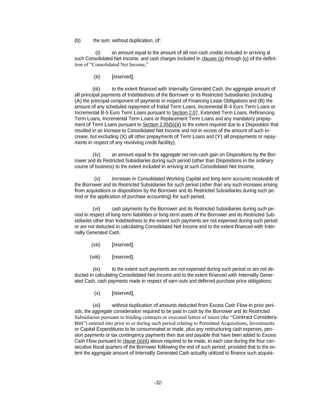 -32- (b) the sum, without duplication, of: (i) an amount equal to the amount of all non-cash credits included in arriving at such Consolidated Net Income, and cash charges included in clauses (a) through (o) of the defini- tion of “Consolidated Net Income,” (ii) [reserved], (iii) to the extent financed with Internally Generated Cash, the aggregate amount of all principal payments of Indebtedness of the Borrower or its Restricted Subsidiaries (including (A) the principal component of payments in respect of Financing Lease Obligations and (B) the amount of any scheduled repayment of Initial Term Loans, Incremental B-4 Euro Term Loans or Incremental B-5 Euro Term Loans pursuant to Section 2.07, Extended Term Loans, Refinancing Term Loans, Incremental Term Loans or Replacement Term Loans and any mandatory prepay- ment of Term Loans pursuant to Section 2.05(b)(ii) to the extent required due to a Disposition that resulted in an increase to Consolidated Net Income and not in excess of the amount of such in- crease, but excluding (X) all other prepayments of Term Loans and (Y) all prepayments or repay- ments in respect of any revolving credit facility), (iv) an amount equal to the aggregate net non-cash gain on Dispositions by the Bor- rower and its Restricted Subsidiaries during such period (other than Dispositions in the ordinary course of business) to the extent included in arriving at such Consolidated Net Income, (v) increases in Consolidated Working Capital and long-term accounts receivable of the Borrower and its Restricted Subsidiaries for such period (other than any such increases arising from acquisitions or dispositions by the Borrower and its Restricted Subsidiaries during such pe- riod or the application of purchase accounting) for such period, (vi) cash payments by the Borrower and its Restricted Subsidiaries during such pe- riod in respect of long-term liabilities or long-term assets of the Borrower and its Restricted Sub- sidiaries other than Indebtedness to the extent such payments are not expensed during such period or are not deducted in calculating Consolidated Net Income and to the extent financed with Inter- nally Generated Cash, (vii) [reserved], (viii) [reserved], (ix) to the extent such payments are not expensed during such period or are not de- ducted in calculating Consolidated Net Income and to the extent financed with Internally Gener- ated Cash, cash payments made in respect of earn-outs and deferred purchase price obligations; (x) [reserved], (xi) without duplication of amounts deducted from Excess Cash Flow in prior peri- ods, the aggregate consideration required to be paid in cash by the Borrower and its Restricted Subsidiaries pursuant to binding contracts or executed letters of intent (the “Contract Considera- tion”) entered into prior to or during such period relating to Permitted Acquisitions, Investments or Capital Expenditures to be consummated or made, plus any restructuring cash expenses, pen- sion payments or tax contingency payments then due and payable that have been added to Excess Cash Flow pursuant to clause (a)(ii) above required to be made, in each case during the four con- secutive fiscal quarters of the Borrower following the end of such period; provided that to the ex- tent the aggregate amount of Internally Generated Cash actually utilized to finance such acquisi-