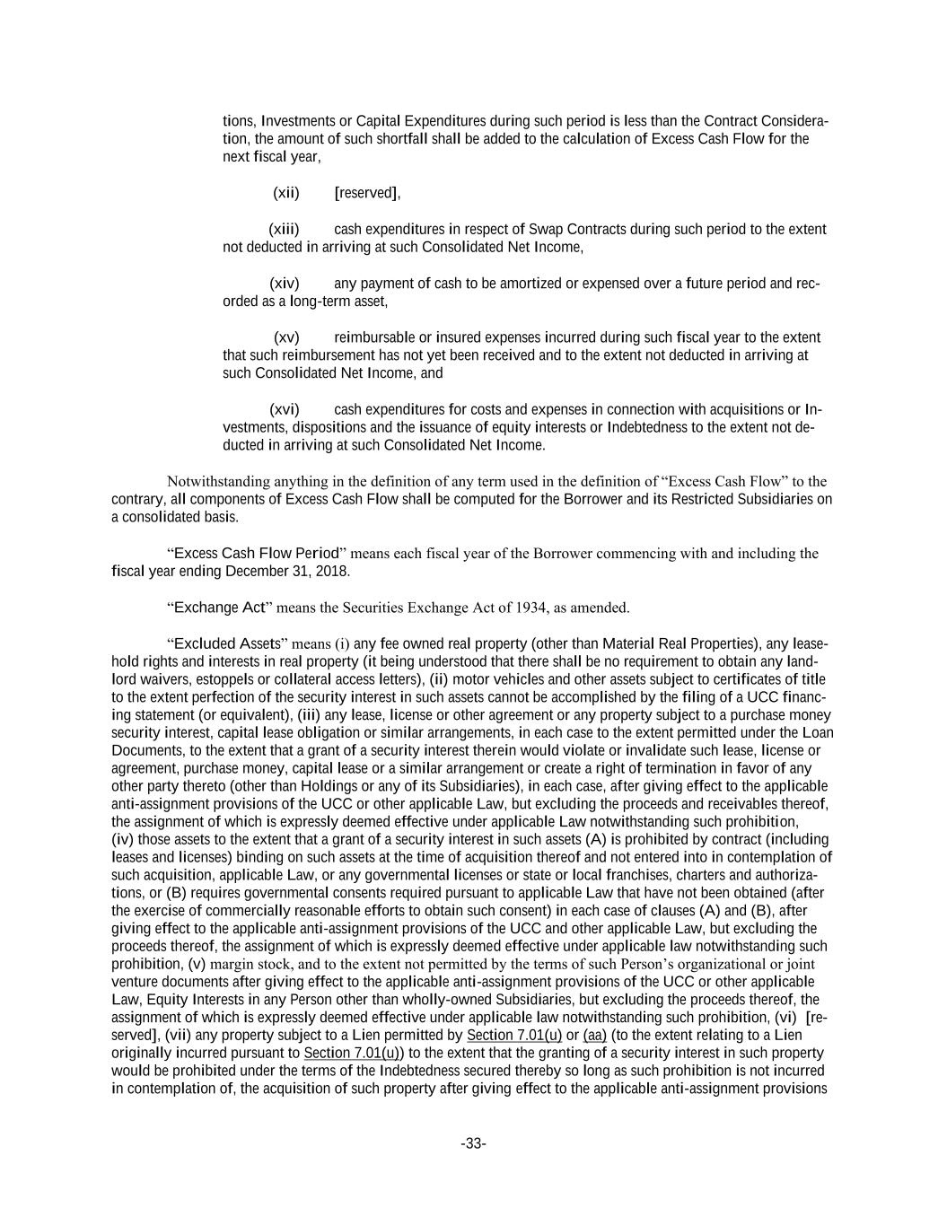 -33- tions, Investments or Capital Expenditures during such period is less than the Contract Considera- tion, the amount of such shortfall shall be added to the calculation of Excess Cash Flow for the next fiscal year, (xii) [reserved], (xiii) cash expenditures in respect of Swap Contracts during such period to the extent not deducted in arriving at such Consolidated Net Income, (xiv) any payment of cash to be amortized or expensed over a future period and rec- orded as a long-term asset, (xv) reimbursable or insured expenses incurred during such fiscal year to the extent that such reimbursement has not yet been received and to the extent not deducted in arriving at such Consolidated Net Income, and (xvi) cash expenditures for costs and expenses in connection with acquisitions or In- vestments, dispositions and the issuance of equity interests or Indebtedness to the extent not de- ducted in arriving at such Consolidated Net Income. Notwithstanding anything in the definition of any term used in the definition of “Excess Cash Flow” to the contrary, all components of Excess Cash Flow shall be computed for the Borrower and its Restricted Subsidiaries on a consolidated basis. “Excess Cash Flow Period” means each fiscal year of the Borrower commencing with and including the fiscal year ending December 31, 2018. “Exchange Act” means the Securities Exchange Act of 1934, as amended. “Excluded Assets” means (i) any fee owned real property (other than Material Real Properties), any lease- hold rights and interests in real property (it being understood that there shall be no requirement to obtain any land- lord waivers, estoppels or collateral access letters), (ii) motor vehicles and other assets subject to certificates of title to the extent perfection of the security interest in such assets cannot be accomplished by the filing of a UCC financ- ing statement (or equivalent), (iii) any lease, license or other agreement or any property subject to a purchase money security interest, capital lease obligation or similar arrangements, in each case to the extent permitted under the Loan Documents, to the extent that a grant of a security interest therein would violate or invalidate such lease, license or agreement, purchase money, capital lease or a similar arrangement or create a right of termination in favor of any other party thereto (other than Holdings or any of its Subsidiaries), in each case, after giving effect to the applicable anti-assignment provisions of the UCC or other applicable Law, but excluding the proceeds and receivables thereof, the assignment of which is expressly deemed effective under applicable Law notwithstanding such prohibition, (iv) those assets to the extent that a grant of a security interest in such assets (A) is prohibited by contract (including leases and licenses) binding on such assets at the time of acquisition thereof and not entered into in contemplation of such acquisition, applicable Law, or any governmental licenses or state or local franchises, charters and authoriza- tions, or (B) requires governmental consents required pursuant to applicable Law that have not been obtained (after the exercise of commercially reasonable efforts to obtain such consent) in each case of clauses (A) and (B), after giving effect to the applicable anti-assignment provisions of the UCC and other applicable Law, but excluding the proceeds thereof, the assignment of which is expressly deemed effective under applicable law notwithstanding such prohibition, (v) margin stock, and to the extent not permitted by the terms of such Person’s organizational or joint venture documents after giving effect to the applicable anti-assignment provisions of the UCC or other applicable Law, Equity Interests in any Person other than wholly-owned Subsidiaries, but excluding the proceeds thereof, the assignment of which is expressly deemed effective under applicable law notwithstanding such prohibition, (vi) [re- served], (vii) any property subject to a Lien permitted by Section 7.01(u) or (aa) (to the extent relating to a Lien originally incurred pursuant to Section 7.01(u)) to the extent that the granting of a security interest in such property would be prohibited under the terms of the Indebtedness secured thereby so long as such prohibition is not incurred in contemplation of, the acquisition of such property after giving effect to the applicable anti-assignment provisions