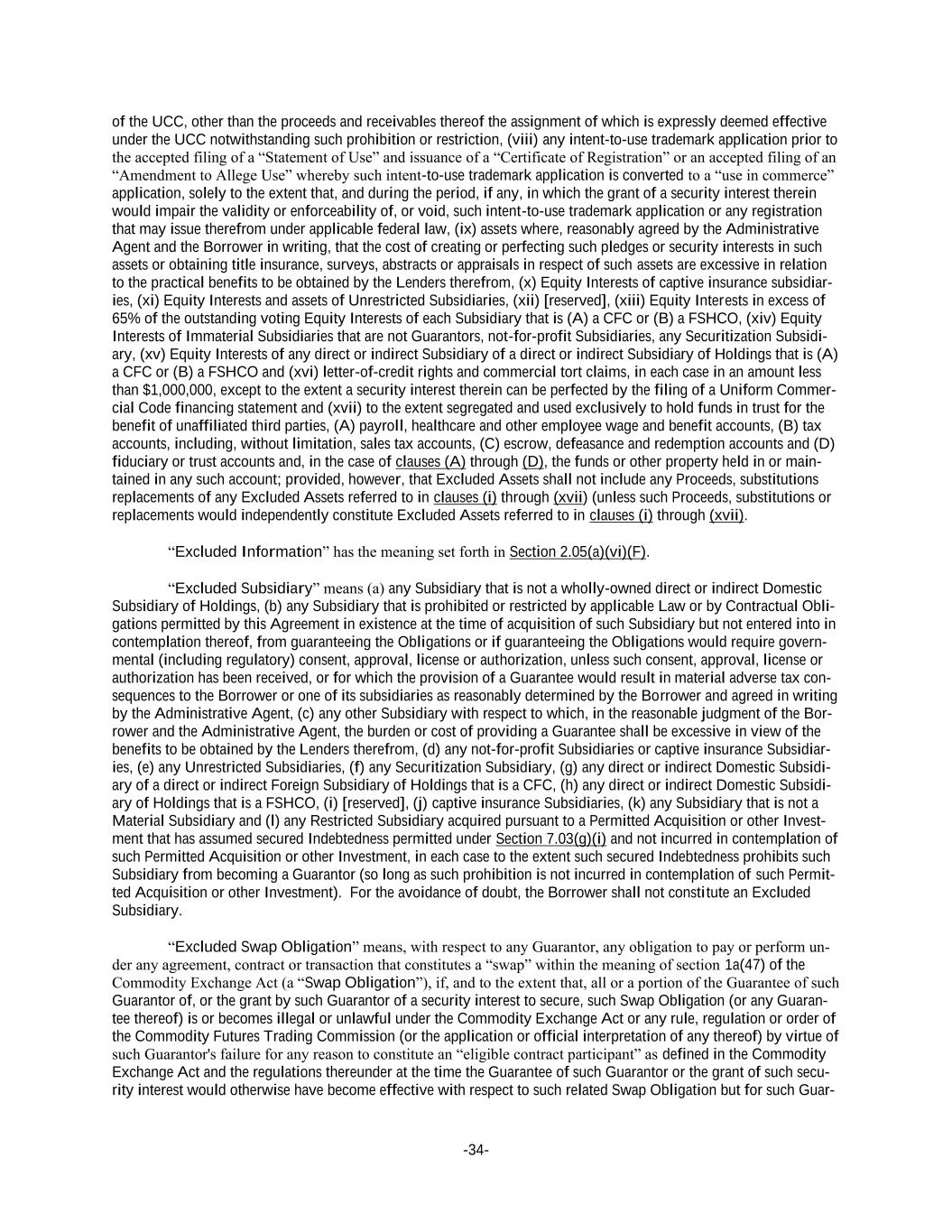-34- of the UCC, other than the proceeds and receivables thereof the assignment of which is expressly deemed effective under the UCC notwithstanding such prohibition or restriction, (viii) any intent-to-use trademark application prior to the accepted filing of a “Statement of Use” and issuance of a “Certificate of Registration” or an accepted filing of an “Amendment to Allege Use” whereby such intent-to-use trademark application is converted to a “use in commerce” application, solely to the extent that, and during the period, if any, in which the grant of a security interest therein would impair the validity or enforceability of, or void, such intent-to-use trademark application or any registration that may issue therefrom under applicable federal law, (ix) assets where, reasonably agreed by the Administrative Agent and the Borrower in writing, that the cost of creating or perfecting such pledges or security interests in such assets or obtaining title insurance, surveys, abstracts or appraisals in respect of such assets are excessive in relation to the practical benefits to be obtained by the Lenders therefrom, (x) Equity Interests of captive insurance subsidiar- ies, (xi) Equity Interests and assets of Unrestricted Subsidiaries, (xii) [reserved], (xiii) Equity Interests in excess of 65% of the outstanding voting Equity Interests of each Subsidiary that is (A) a CFC or (B) a FSHCO, (xiv) Equity Interests of Immaterial Subsidiaries that are not Guarantors, not-for-profit Subsidiaries, any Securitization Subsidi- ary, (xv) Equity Interests of any direct or indirect Subsidiary of a direct or indirect Subsidiary of Holdings that is (A) a CFC or (B) a FSHCO and (xvi) letter-of-credit rights and commercial tort claims, in each case in an amount less than $1,000,000, except to the extent a security interest therein can be perfected by the filing of a Uniform Commer- cial Code financing statement and (xvii) to the extent segregated and used exclusively to hold funds in trust for the benefit of unaffiliated third parties, (A) payroll, healthcare and other employee wage and benefit accounts, (B) tax accounts, including, without limitation, sales tax accounts, (C) escrow, defeasance and redemption accounts and (D) fiduciary or trust accounts and, in the case of clauses (A) through (D), the funds or other property held in or main- tained in any such account; provided, however, that Excluded Assets shall not include any Proceeds, substitutions replacements of any Excluded Assets referred to in clauses (i) through (xvii) (unless such Proceeds, substitutions or replacements would independently constitute Excluded Assets referred to in clauses (i) through (xvii). “Excluded Information” has the meaning set forth in Section 2.05(a)(vi)(F). “Excluded Subsidiary” means (a) any Subsidiary that is not a wholly-owned direct or indirect Domestic Subsidiary of Holdings, (b) any Subsidiary that is prohibited or restricted by applicable Law or by Contractual Obli- gations permitted by this Agreement in existence at the time of acquisition of such Subsidiary but not entered into in contemplation thereof, from guaranteeing the Obligations or if guaranteeing the Obligations would require govern- mental (including regulatory) consent, approval, license or authorization, unless such consent, approval, license or authorization has been received, or for which the provision of a Guarantee would result in material adverse tax con- sequences to the Borrower or one of its subsidiaries as reasonably determined by the Borrower and agreed in writing by the Administrative Agent, (c) any other Subsidiary with respect to which, in the reasonable judgment of the Bor- rower and the Administrative Agent, the burden or cost of providing a Guarantee shall be excessive in view of the benefits to be obtained by the Lenders therefrom, (d) any not-for-profit Subsidiaries or captive insurance Subsidiar- ies, (e) any Unrestricted Subsidiaries, (f) any Securitization Subsidiary, (g) any direct or indirect Domestic Subsidi- ary of a direct or indirect Foreign Subsidiary of Holdings that is a CFC, (h) any direct or indirect Domestic Subsidi- ary of Holdings that is a FSHCO, (i) [reserved], (j) captive insurance Subsidiaries, (k) any Subsidiary that is not a Material Subsidiary and (l) any Restricted Subsidiary acquired pursuant to a Permitted Acquisition or other Invest- ment that has assumed secured Indebtedness permitted under Section 7.03(g)(i) and not incurred in contemplation of such Permitted Acquisition or other Investment, in each case to the extent such secured Indebtedness prohibits such Subsidiary from becoming a Guarantor (so long as such prohibition is not incurred in contemplation of such Permit- ted Acquisition or other Investment). For the avoidance of doubt, the Borrower shall not constitute an Excluded Subsidiary. “Excluded Swap Obligation” means, with respect to any Guarantor, any obligation to pay or perform un- der any agreement, contract or transaction that constitutes a “swap” within the meaning of section 1a(47) of the Commodity Exchange Act (a “Swap Obligation”), if, and to the extent that, all or a portion of the Guarantee of such Guarantor of, or the grant by such Guarantor of a security interest to secure, such Swap Obligation (or any Guaran- tee thereof) is or becomes illegal or unlawful under the Commodity Exchange Act or any rule, regulation or order of the Commodity Futures Trading Commission (or the application or official interpretation of any thereof) by virtue of such Guarantor's failure for any reason to constitute an “eligible contract participant” as defined in the Commodity Exchange Act and the regulations thereunder at the time the Guarantee of such Guarantor or the grant of such secu- rity interest would otherwise have become effective with respect to such related Swap Obligation but for such Guar-