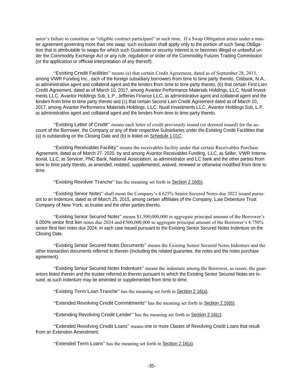 -35- antor’s failure to constitute an “eligible contract participant” at such time. If a Swap Obligation arises under a mas- ter agreement governing more than one swap, such exclusion shall apply only to the portion of such Swap Obliga- tion that is attributable to swaps for which such Guarantee or security interest is or becomes illegal or unlawful un- der the Commodity Exchange Act or any rule, regulation or order of the Commodity Futures Trading Commission (or the application or official interpretation of any thereof). “Existing Credit Facilities” means (a) that certain Credit Agreement, dated as of September 28, 2015, among VWR Funding Inc., each of the foreign subsidiary borrowers from time to time party thereto, Citibank, N.A., as administrative agent and collateral agent and the lenders from time to time party thereto, (b) that certain First Lien Credit Agreement, dated as of March 10, 2017, among Avantor Performance Materials Holdings, LLC, Nusil Invest- ments LLC, Avantor Holdings Sub, L.P., Jefferies Finance LLC, as administrative agent and collateral agent and the lenders from time to time party thereto and (c) that certain Second Lien Credit Agreement dated as of March 10, 2017, among Avantor Performance Materials Holdings, LLC, Nusil Investments LLC, Avantor Holdings Sub, L.P. as administrative agent and collateral agent and the lenders from time to time party thereto. “Existing Letter of Credit” means each letter of credit previously issued (or deemed issued) for the ac- count of the Borrower, the Company or any of their respective Subsidiaries under the Existing Credit Facilities that (a) is outstanding on the Closing Date and (b) is listed on Schedule 1.01C. “Existing Receivables Facility” means the receivables facility under that certain Receivables Purchase Agreement, dated as of March 27, 2020, by and among Avantor Receivables Funding, LLC, as Seller, VWR Interna- tional, LLC, as Servicer, PNC Bank, National Association, as administrator and LC bank and the other parties from time to time party thereto, as amended, restated, supplemented, waived, renewed or otherwise modified from time to time. “Existing Revolver Tranche” has the meaning set forth in Section 2.16(b). “Existing Senior Notes” shall mean the Company’s 4.625% Senior Secured Notes due 2022 issued pursu- ant to an Indenture, dated as of March 25, 2015, among certain affiliates of the Company, Law Debenture Trust Company of New York, as trustee and the other parties thereto. “Existing Senior Secured Notes” means $1,500,000,000 in aggregate principal amount of the Borrower’s 6.000% senior first lien notes due 2024 and €500,000,000 in aggregate principal amount of the Borrower’s 4.750% senior first lien notes due 2024, in each case issued pursuant to the Existing Senior Secured Notes Indenture on the Closing Date. “Existing Senior Secured Notes Documents” means the Existing Senior Secured Notes Indenture and the other transaction documents referred to therein (including the related guarantee, the notes and the notes purchase agreement). “Existing Senior Secured Notes Indenture” means the indenture among the Borrower, as issuer, the guar- antors listed therein and the trustee referred to therein pursuant to which the Existing Senior Secured Notes are is- sued, as such indenture may be amended or supplemented from time to time. “Existing Term Loan Tranche” has the meaning set forth in Section 2.16(a). “Extended Revolving Credit Commitments” has the meaning set forth in Section 2.16(b). “Extending Revolving Credit Lender” has the meaning set forth in Section 2.16(c). “Extended Revolving Credit Loans” means one or more Classes of Revolving Credit Loans that result from an Extension Amendment. “Extended Term Loans” has the meaning set forth in Section 2.16(a).