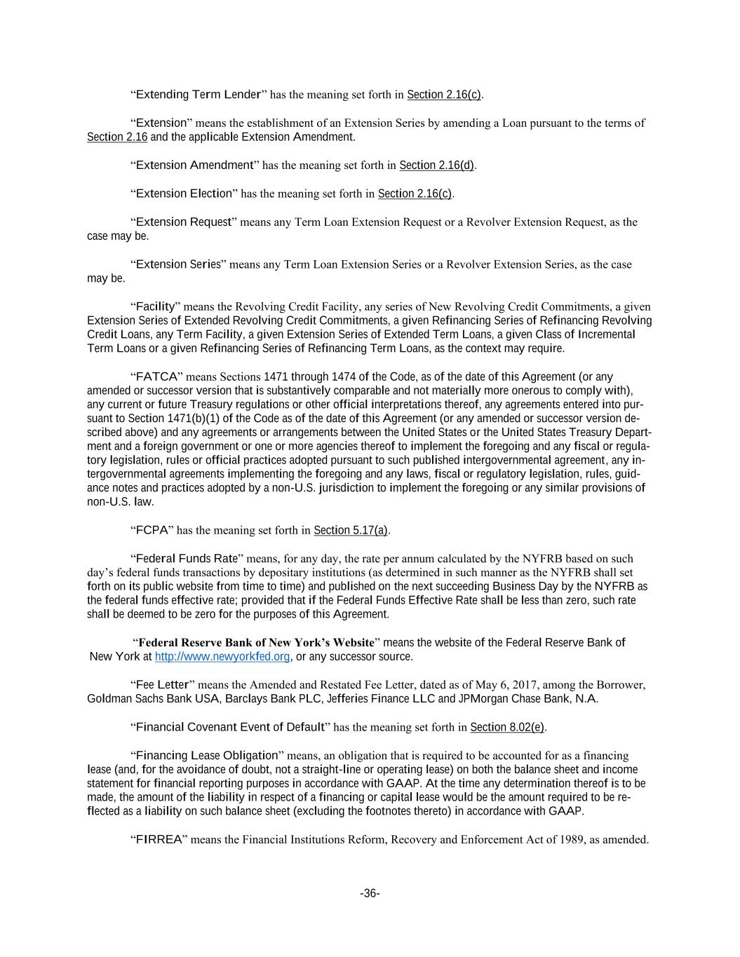 -36- “Extending Term Lender” has the meaning set forth in Section 2.16(c). “Extension” means the establishment of an Extension Series by amending a Loan pursuant to the terms of Section 2.16 and the applicable Extension Amendment. “Extension Amendment” has the meaning set forth in Section 2.16(d). “Extension Election” has the meaning set forth in Section 2.16(c). “Extension Request” means any Term Loan Extension Request or a Revolver Extension Request, as the case may be. “Extension Series” means any Term Loan Extension Series or a Revolver Extension Series, as the case may be. “Facility” means the Revolving Credit Facility, any series of New Revolving Credit Commitments, a given Extension Series of Extended Revolving Credit Commitments, a given Refinancing Series of Refinancing Revolving Credit Loans, any Term Facility, a given Extension Series of Extended Term Loans, a given Class of Incremental Term Loans or a given Refinancing Series of Refinancing Term Loans, as the context may require. “FATCA” means Sections 1471 through 1474 of the Code, as of the date of this Agreement (or any amended or successor version that is substantively comparable and not materially more onerous to comply with), any current or future Treasury regulations or other official interpretations thereof, any agreements entered into pur- suant to Section 1471(b)(1) of the Code as of the date of this Agreement (or any amended or successor version de- scribed above) and any agreements or arrangements between the United States or the United States Treasury Depart- ment and a foreign government or one or more agencies thereof to implement the foregoing and any fiscal or regula- tory legislation, rules or official practices adopted pursuant to such published intergovernmental agreement, any in- tergovernmental agreements implementing the foregoing and any laws, fiscal or regulatory legislation, rules, guid- ance notes and practices adopted by a non-U.S. jurisdiction to implement the foregoing or any similar provisions of non-U.S. law. “FCPA” has the meaning set forth in Section 5.17(a). “Federal Funds Rate” means, for any day, the rate per annum calculated by the NYFRB based on such day’s federal funds transactions by depositary institutions (as determined in such manner as the NYFRB shall set forth on its public website from time to time) and published on the next succeeding Business Day by the NYFRB as the federal funds effective rate; provided that if the Federal Funds Effective Rate shall be less than zero, such rate shall be deemed to be zero for the purposes of this Agreement. “Federal Reserve Bank of New York’s Website” means the website of the Federal Reserve Bank of New York at http://www.newyorkfed.org, or any successor source. “Fee Letter” means the Amended and Restated Fee Letter, dated as of May 6, 2017, among the Borrower, Goldman Sachs Bank USA, Barclays Bank PLC, Jefferies Finance LLC and JPMorgan Chase Bank, N.A. “Financial Covenant Event of Default” has the meaning set forth in Section 8.02(e). “Financing Lease Obligation” means, an obligation that is required to be accounted for as a financing lease (and, for the avoidance of doubt, not a straight-line or operating lease) on both the balance sheet and income statement for financial reporting purposes in accordance with GAAP. At the time any determination thereof is to be made, the amount of the liability in respect of a financing or capital lease would be the amount required to be re- flected as a liability on such balance sheet (excluding the footnotes thereto) in accordance with GAAP. “FIRREA” means the Financial Institutions Reform, Recovery and Enforcement Act of 1989, as amended.