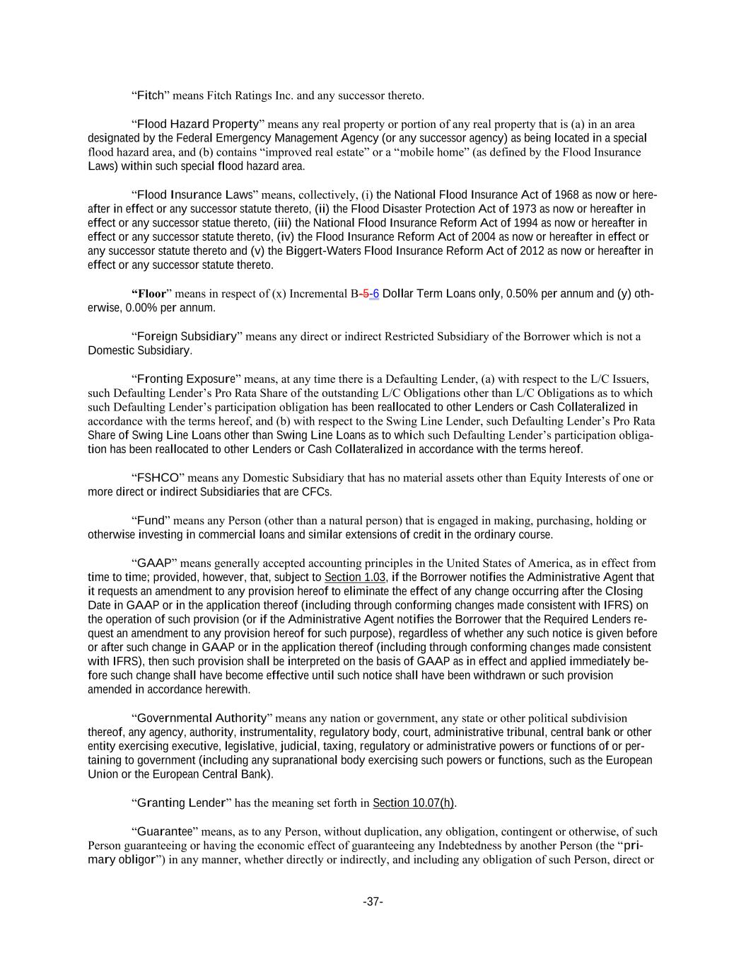 -37- “Fitch” means Fitch Ratings Inc. and any successor thereto. “Flood Hazard Property” means any real property or portion of any real property that is (a) in an area designated by the Federal Emergency Management Agency (or any successor agency) as being located in a special flood hazard area, and (b) contains “improved real estate” or a “mobile home” (as defined by the Flood Insurance Laws) within such special flood hazard area. “Flood Insurance Laws” means, collectively, (i) the National Flood Insurance Act of 1968 as now or here- after in effect or any successor statute thereto, (ii) the Flood Disaster Protection Act of 1973 as now or hereafter in effect or any successor statue thereto, (iii) the National Flood Insurance Reform Act of 1994 as now or hereafter in effect or any successor statute thereto, (iv) the Flood Insurance Reform Act of 2004 as now or hereafter in effect or any successor statute thereto and (v) the Biggert-Waters Flood Insurance Reform Act of 2012 as now or hereafter in effect or any successor statute thereto. “Floor” means in respect of (x) Incremental B-5-6 Dollar Term Loans only, 0.50% per annum and (y) oth- erwise, 0.00% per annum. “Foreign Subsidiary” means any direct or indirect Restricted Subsidiary of the Borrower which is not a Domestic Subsidiary. “Fronting Exposure” means, at any time there is a Defaulting Lender, (a) with respect to the L/C Issuers, such Defaulting Lender’s Pro Rata Share of the outstanding L/C Obligations other than L/C Obligations as to which such Defaulting Lender’s participation obligation has been reallocated to other Lenders or Cash Collateralized in accordance with the terms hereof, and (b) with respect to the Swing Line Lender, such Defaulting Lender’s Pro Rata Share of Swing Line Loans other than Swing Line Loans as to which such Defaulting Lender’s participation obliga- tion has been reallocated to other Lenders or Cash Collateralized in accordance with the terms hereof. “FSHCO” means any Domestic Subsidiary that has no material assets other than Equity Interests of one or more direct or indirect Subsidiaries that are CFCs. “Fund” means any Person (other than a natural person) that is engaged in making, purchasing, holding or otherwise investing in commercial loans and similar extensions of credit in the ordinary course. “GAAP” means generally accepted accounting principles in the United States of America, as in effect from time to time; provided, however, that, subject to Section 1.03, if the Borrower notifies the Administrative Agent that it requests an amendment to any provision hereof to eliminate the effect of any change occurring after the Closing Date in GAAP or in the application thereof (including through conforming changes made consistent with IFRS) on the operation of such provision (or if the Administrative Agent notifies the Borrower that the Required Lenders re- quest an amendment to any provision hereof for such purpose), regardless of whether any such notice is given before or after such change in GAAP or in the application thereof (including through conforming changes made consistent with IFRS), then such provision shall be interpreted on the basis of GAAP as in effect and applied immediately be- fore such change shall have become effective until such notice shall have been withdrawn or such provision amended in accordance herewith. “Governmental Authority” means any nation or government, any state or other political subdivision thereof, any agency, authority, instrumentality, regulatory body, court, administrative tribunal, central bank or other entity exercising executive, legislative, judicial, taxing, regulatory or administrative powers or functions of or per- taining to government (including any supranational body exercising such powers or functions, such as the European Union or the European Central Bank). “Granting Lender” has the meaning set forth in Section 10.07(h). “Guarantee” means, as to any Person, without duplication, any obligation, contingent or otherwise, of such Person guaranteeing or having the economic effect of guaranteeing any Indebtedness by another Person (the “pri- mary obligor”) in any manner, whether directly or indirectly, and including any obligation of such Person, direct or