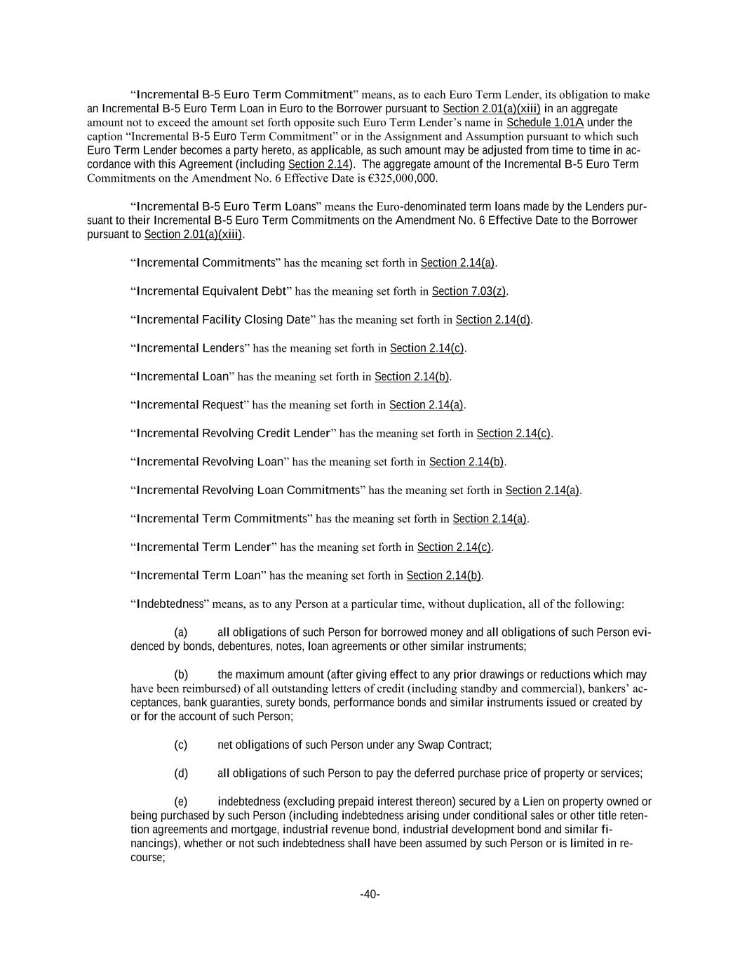 -40- “Incremental B-5 Euro Term Commitment” means, as to each Euro Term Lender, its obligation to make an Incremental B-5 Euro Term Loan in Euro to the Borrower pursuant to Section 2.01(a)(xiii) in an aggregate amount not to exceed the amount set forth opposite such Euro Term Lender’s name in Schedule 1.01A under the caption “Incremental B-5 Euro Term Commitment” or in the Assignment and Assumption pursuant to which such Euro Term Lender becomes a party hereto, as applicable, as such amount may be adjusted from time to time in ac- cordance with this Agreement (including Section 2.14). The aggregate amount of the Incremental B-5 Euro Term Commitments on the Amendment No. 6 Effective Date is €325,000,000. “Incremental B-5 Euro Term Loans” means the Euro-denominated term loans made by the Lenders pur- suant to their Incremental B-5 Euro Term Commitments on the Amendment No. 6 Effective Date to the Borrower pursuant to Section 2.01(a)(xiii). “Incremental Commitments” has the meaning set forth in Section 2.14(a). “Incremental Equivalent Debt” has the meaning set forth in Section 7.03(z). “Incremental Facility Closing Date” has the meaning set forth in Section 2.14(d). “Incremental Lenders” has the meaning set forth in Section 2.14(c). “Incremental Loan” has the meaning set forth in Section 2.14(b). “Incremental Request” has the meaning set forth in Section 2.14(a). “Incremental Revolving Credit Lender” has the meaning set forth in Section 2.14(c). “Incremental Revolving Loan” has the meaning set forth in Section 2.14(b). “Incremental Revolving Loan Commitments” has the meaning set forth in Section 2.14(a). “Incremental Term Commitments” has the meaning set forth in Section 2.14(a). “Incremental Term Lender” has the meaning set forth in Section 2.14(c). “Incremental Term Loan” has the meaning set forth in Section 2.14(b). “Indebtedness” means, as to any Person at a particular time, without duplication, all of the following: (a) all obligations of such Person for borrowed money and all obligations of such Person evi- denced by bonds, debentures, notes, loan agreements or other similar instruments; (b) the maximum amount (after giving effect to any prior drawings or reductions which may have been reimbursed) of all outstanding letters of credit (including standby and commercial), bankers’ ac- ceptances, bank guaranties, surety bonds, performance bonds and similar instruments issued or created by or for the account of such Person; (c) net obligations of such Person under any Swap Contract; (d) all obligations of such Person to pay the deferred purchase price of property or services; (e) indebtedness (excluding prepaid interest thereon) secured by a Lien on property owned or being purchased by such Person (including indebtedness arising under conditional sales or other title reten- tion agreements and mortgage, industrial revenue bond, industrial development bond and similar fi- nancings), whether or not such indebtedness shall have been assumed by such Person or is limited in re- course;
