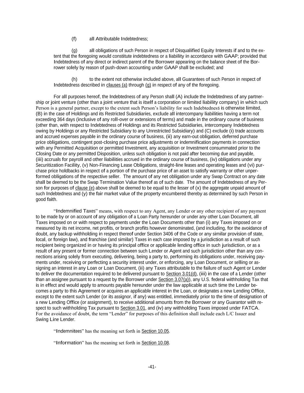 -41- (f) all Attributable Indebtedness; (g) all obligations of such Person in respect of Disqualified Equity Interests if and to the ex- tent that the foregoing would constitute indebtedness or a liability in accordance with GAAP; provided that Indebtedness of any direct or indirect parent of the Borrower appearing on the balance sheet of the Bor- rower solely by reason of push-down accounting under GAAP shall be excluded; and (h) to the extent not otherwise included above, all Guarantees of such Person in respect of Indebtedness described in clauses (a) through (g) in respect of any of the foregoing. For all purposes hereof, the Indebtedness of any Person shall (A) include the Indebtedness of any partner- ship or joint venture (other than a joint venture that is itself a corporation or limited liability company) in which such Person is a general partner, except to the extent such Person’s liability for such Indebtedness is otherwise limited, (B) in the case of Holdings and its Restricted Subsidiaries, exclude all intercompany liabilities having a term not exceeding 364 days (inclusive of any roll-over or extensions of terms) and made in the ordinary course of business (other than, with respect to Indebtedness of Holdings and its Restricted Subsidiaries, intercompany Indebtedness owing by Holdings or any Restricted Subsidiary to any Unrestricted Subsidiary) and (C) exclude (i) trade accounts and accrued expenses payable in the ordinary course of business, (ii) any earn-out obligation, deferred purchase price obligations, contingent post-closing purchase price adjustments or indemnification payments in connection with any Permitted Acquisition or permitted Investment, any acquisition or Investment consummated prior to the Closing Date or any permitted Disposition, unless such obligation is not paid after becoming due and payable, (iii) accruals for payroll and other liabilities accrued in the ordinary course of business, (iv) obligations under any Securitization Facility, (v) Non-Financing Lease Obligations, straight-line leases and operating leases and (vi) pur- chase price holdbacks in respect of a portion of the purchase price of an asset to satisfy warranty or other unper- formed obligations of the respective seller. The amount of any net obligation under any Swap Contract on any date shall be deemed to be the Swap Termination Value thereof as of such date. The amount of Indebtedness of any Per- son for purposes of clause (e) above shall be deemed to be equal to the lesser of (x) the aggregate unpaid amount of such Indebtedness and (y) the fair market value of the property encumbered thereby as determined by such Person in good faith. “Indemnified Taxes” means, with respect to any Agent, any Lender or any other recipient of any payment to be made by or on account of any obligation of a Loan Party hereunder or under any other Loan Document, all Taxes imposed on or with respect to payments under the Loan Documents other than (i) any Taxes imposed on or measured by its net income, net profits, or branch profits however denominated, (and including, for the avoidance of doubt, any backup withholding in respect thereof under Section 3406 of the Code or any similar provision of state, local, or foreign law), and franchise (and similar) Taxes in each case imposed by a jurisdiction as a result of such recipient being organized in or having its principal office or applicable lending office in such jurisdiction, or as a result of any present or former connection between such Lender or Agent and such jurisdiction other than any con- nections arising solely from executing, delivering, being a party to, performing its obligations under, receiving pay- ments under, receiving or perfecting a security interest under, or enforcing, any Loan Document, or selling or as- signing an interest in any Loan or Loan Document, (ii) any Taxes attributable to the failure of such Agent or Lender to deliver the documentation required to be delivered pursuant to Section 3.01(d), (iii) in the case of a Lender (other than an assignee pursuant to a request by the Borrower under Section 3.07(a)), any U.S. federal withholding Tax that is in effect and would apply to amounts payable hereunder under the law applicable at such time the Lender be- comes a party to this Agreement or acquires an applicable interest in the Loan, or designates a new Lending Office, except to the extent such Lender (or its assignor, if any) was entitled, immediately prior to the time of designation of a new Lending Office (or assignment), to receive additional amounts from the Borrower or any Guarantor with re- spect to such withholding Tax pursuant to Section 3.01, and (iv) any withholding Taxes imposed under FATCA. For the avoidance of doubt, the term “Lender” for purposes of this definition shall include each L/C Issuer and Swing Line Lender. “Indemnitees” has the meaning set forth in Section 10.05. “Information” has the meaning set forth in Section 10.08.