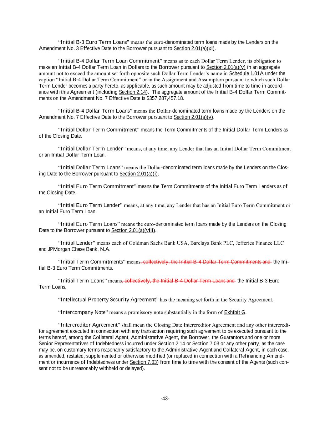 -43- “Initial B-3 Euro Term Loans” means the euro-denominated term loans made by the Lenders on the Amendment No. 3 Effective Date to the Borrower pursuant to Section 2.01(a)(xi). “Initial B-4 Dollar Term Loan Commitment” means as to each Dollar Term Lender, its obligation to make an Initial B-4 Dollar Term Loan in Dollars to the Borrower pursuant to Section 2.01(a)(v) in an aggregate amount not to exceed the amount set forth opposite such Dollar Term Lender’s name in Schedule 1.01A under the caption “Initial B-4 Dollar Term Commitment” or in the Assignment and Assumption pursuant to which such Dollar Term Lender becomes a party hereto, as applicable, as such amount may be adjusted from time to time in accord- ance with this Agreement (including Section 2.14). The aggregate amount of the Initial B-4 Dollar Term Commit- ments on the Amendment No. 7 Effective Date is $357,287,457.18. “Initial B-4 Dollar Term Loans” means the Dollar-denominated term loans made by the Lenders on the Amendment No. 7 Effective Date to the Borrower pursuant to Section 2.01(a)(v). “Initial Dollar Term Commitment” means the Term Commitments of the Initial Dollar Term Lenders as of the Closing Date. “Initial Dollar Term Lender” means, at any time, any Lender that has an Initial Dollar Term Commitment or an Initial Dollar Term Loan. “Initial Dollar Term Loans” means the Dollar-denominated term loans made by the Lenders on the Clos- ing Date to the Borrower pursuant to Section 2.01(a)(i). “Initial Euro Term Commitment” means the Term Commitments of the Initial Euro Term Lenders as of the Closing Date. “Initial Euro Term Lender” means, at any time, any Lender that has an Initial Euro Term Commitment or an Initial Euro Term Loan. “Initial Euro Term Loans” means the euro-denominated term loans made by the Lenders on the Closing Date to the Borrower pursuant to Section 2.01(a)(viii). “Initial Lender” means each of Goldman Sachs Bank USA, Barclays Bank PLC, Jefferies Finance LLC and JPMorgan Chase Bank, N.A. “Initial Term Commitments” means, collectively, the Initial B-4 Dollar Term Commitments and the Ini- tial B-3 Euro Term Commitments. “Initial Term Loans” means, collectively, the Initial B-4 Dollar Term Loans and the Initial B-3 Euro Term Loans. “Intellectual Property Security Agreement” has the meaning set forth in the Security Agreement. “Intercompany Note” means a promissory note substantially in the form of Exhibit G. “Intercreditor Agreement” shall mean the Closing Date Intercreditor Agreement and any other intercredi- tor agreement executed in connection with any transaction requiring such agreement to be executed pursuant to the terms hereof, among the Collateral Agent, Administrative Agent, the Borrower, the Guarantors and one or more Senior Representatives of Indebtedness incurred under Section 2.14 or Section 7.03 or any other party, as the case may be, on customary terms reasonably satisfactory to the Administrative Agent and Collateral Agent, in each case, as amended, restated, supplemented or otherwise modified (or replaced in connection with a Refinancing Amend- ment or incurrence of Indebtedness under Section 7.03) from time to time with the consent of the Agents (such con- sent not to be unreasonably withheld or delayed).