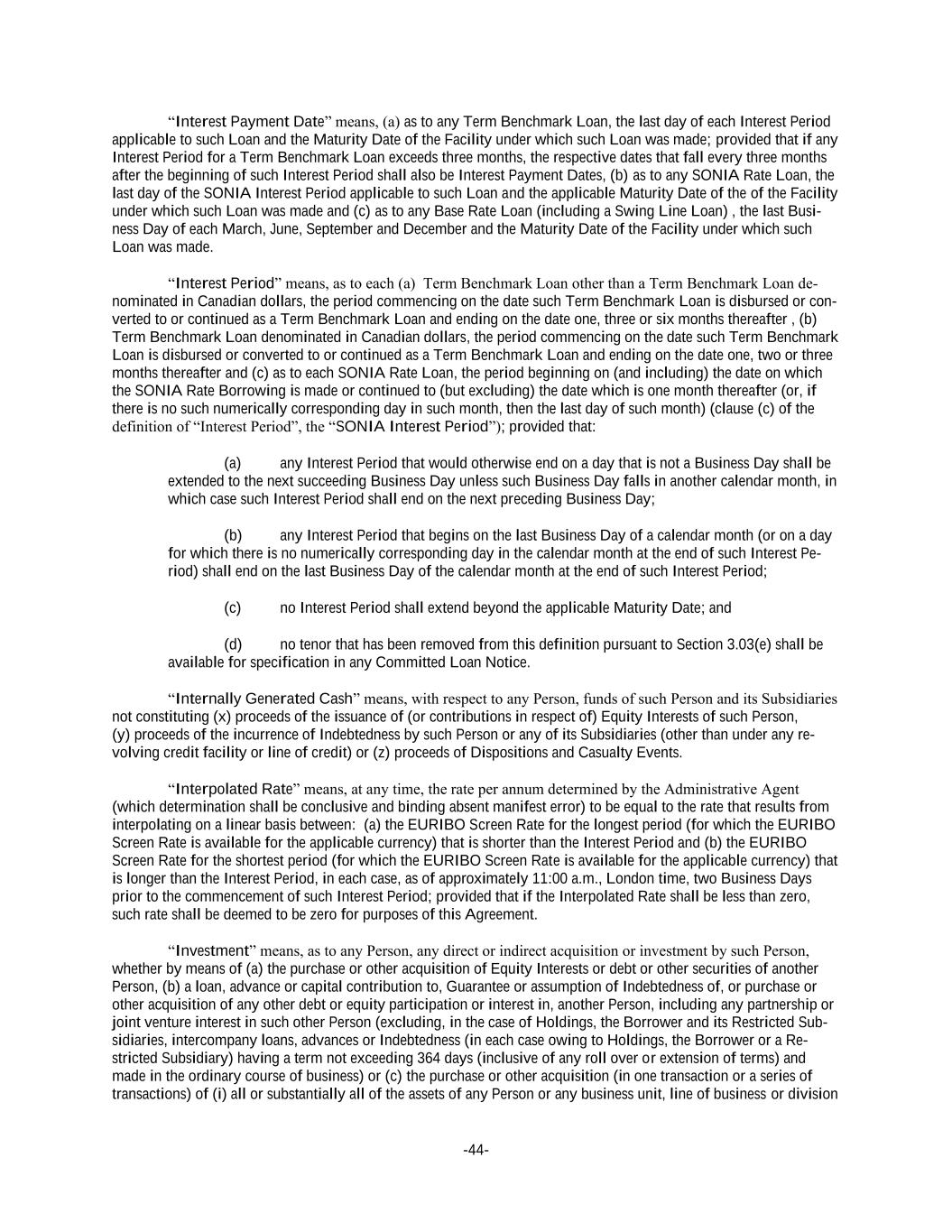 -44- “Interest Payment Date” means, (a) as to any Term Benchmark Loan, the last day of each Interest Period applicable to such Loan and the Maturity Date of the Facility under which such Loan was made; provided that if any Interest Period for a Term Benchmark Loan exceeds three months, the respective dates that fall every three months after the beginning of such Interest Period shall also be Interest Payment Dates, (b) as to any SONIA Rate Loan, the last day of the SONIA Interest Period applicable to such Loan and the applicable Maturity Date of the of the Facility under which such Loan was made and (c) as to any Base Rate Loan (including a Swing Line Loan) , the last Busi- ness Day of each March, June, September and December and the Maturity Date of the Facility under which such Loan was made. “Interest Period” means, as to each (a) Term Benchmark Loan other than a Term Benchmark Loan de- nominated in Canadian dollars, the period commencing on the date such Term Benchmark Loan is disbursed or con- verted to or continued as a Term Benchmark Loan and ending on the date one, three or six months thereafter , (b) Term Benchmark Loan denominated in Canadian dollars, the period commencing on the date such Term Benchmark Loan is disbursed or converted to or continued as a Term Benchmark Loan and ending on the date one, two or three months thereafter and (c) as to each SONIA Rate Loan, the period beginning on (and including) the date on which the SONIA Rate Borrowing is made or continued to (but excluding) the date which is one month thereafter (or, if there is no such numerically corresponding day in such month, then the last day of such month) (clause (c) of the definition of “Interest Period”, the “SONIA Interest Period”); provided that: (a) any Interest Period that would otherwise end on a day that is not a Business Day shall be extended to the next succeeding Business Day unless such Business Day falls in another calendar month, in which case such Interest Period shall end on the next preceding Business Day; (b) any Interest Period that begins on the last Business Day of a calendar month (or on a day for which there is no numerically corresponding day in the calendar month at the end of such Interest Pe- riod) shall end on the last Business Day of the calendar month at the end of such Interest Period; (c) no Interest Period shall extend beyond the applicable Maturity Date; and (d) no tenor that has been removed from this definition pursuant to Section 3.03(e) shall be available for specification in any Committed Loan Notice. “Internally Generated Cash” means, with respect to any Person, funds of such Person and its Subsidiaries not constituting (x) proceeds of the issuance of (or contributions in respect of) Equity Interests of such Person, (y) proceeds of the incurrence of Indebtedness by such Person or any of its Subsidiaries (other than under any re- volving credit facility or line of credit) or (z) proceeds of Dispositions and Casualty Events. “Interpolated Rate” means, at any time, the rate per annum determined by the Administrative Agent (which determination shall be conclusive and binding absent manifest error) to be equal to the rate that results from interpolating on a linear basis between: (a) the EURIBO Screen Rate for the longest period (for which the EURIBO Screen Rate is available for the applicable currency) that is shorter than the Interest Period and (b) the EURIBO Screen Rate for the shortest period (for which the EURIBO Screen Rate is available for the applicable currency) that is longer than the Interest Period, in each case, as of approximately 11:00 a.m., London time, two Business Days prior to the commencement of such Interest Period; provided that if the Interpolated Rate shall be less than zero, such rate shall be deemed to be zero for purposes of this Agreement. “Investment” means, as to any Person, any direct or indirect acquisition or investment by such Person, whether by means of (a) the purchase or other acquisition of Equity Interests or debt or other securities of another Person, (b) a loan, advance or capital contribution to, Guarantee or assumption of Indebtedness of, or purchase or other acquisition of any other debt or equity participation or interest in, another Person, including any partnership or joint venture interest in such other Person (excluding, in the case of Holdings, the Borrower and its Restricted Sub- sidiaries, intercompany loans, advances or Indebtedness (in each case owing to Holdings, the Borrower or a Re- stricted Subsidiary) having a term not exceeding 364 days (inclusive of any roll over or extension of terms) and made in the ordinary course of business) or (c) the purchase or other acquisition (in one transaction or a series of transactions) of (i) all or substantially all of the assets of any Person or any business unit, line of business or division
